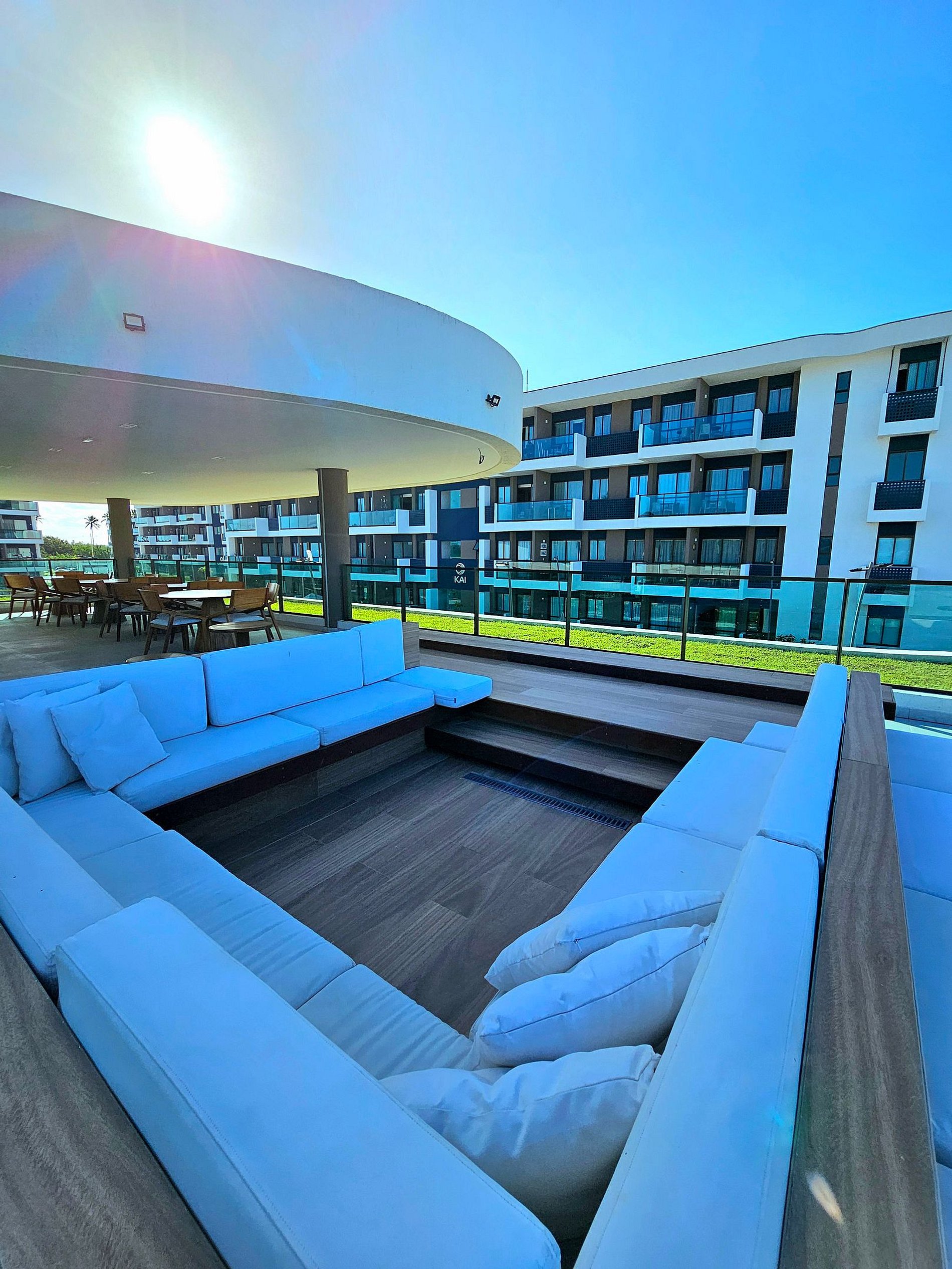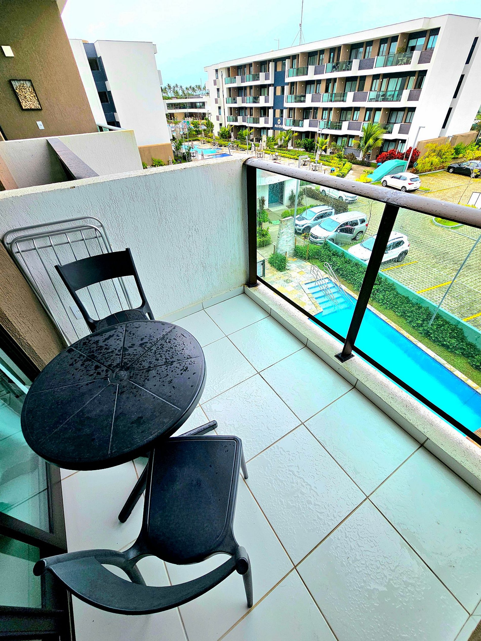 Pra finalizar temos uma varanda com mesa de apoio e cadeiras e uma excelente vista de uma das piscinas.