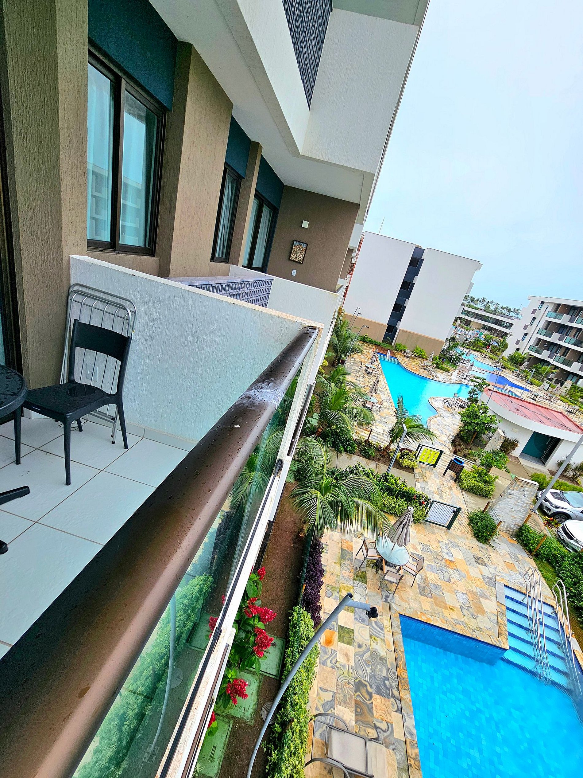 Pra finalizar temos uma varanda com mesa de apoio e cadeiras e uma excelente vista de uma das piscinas.