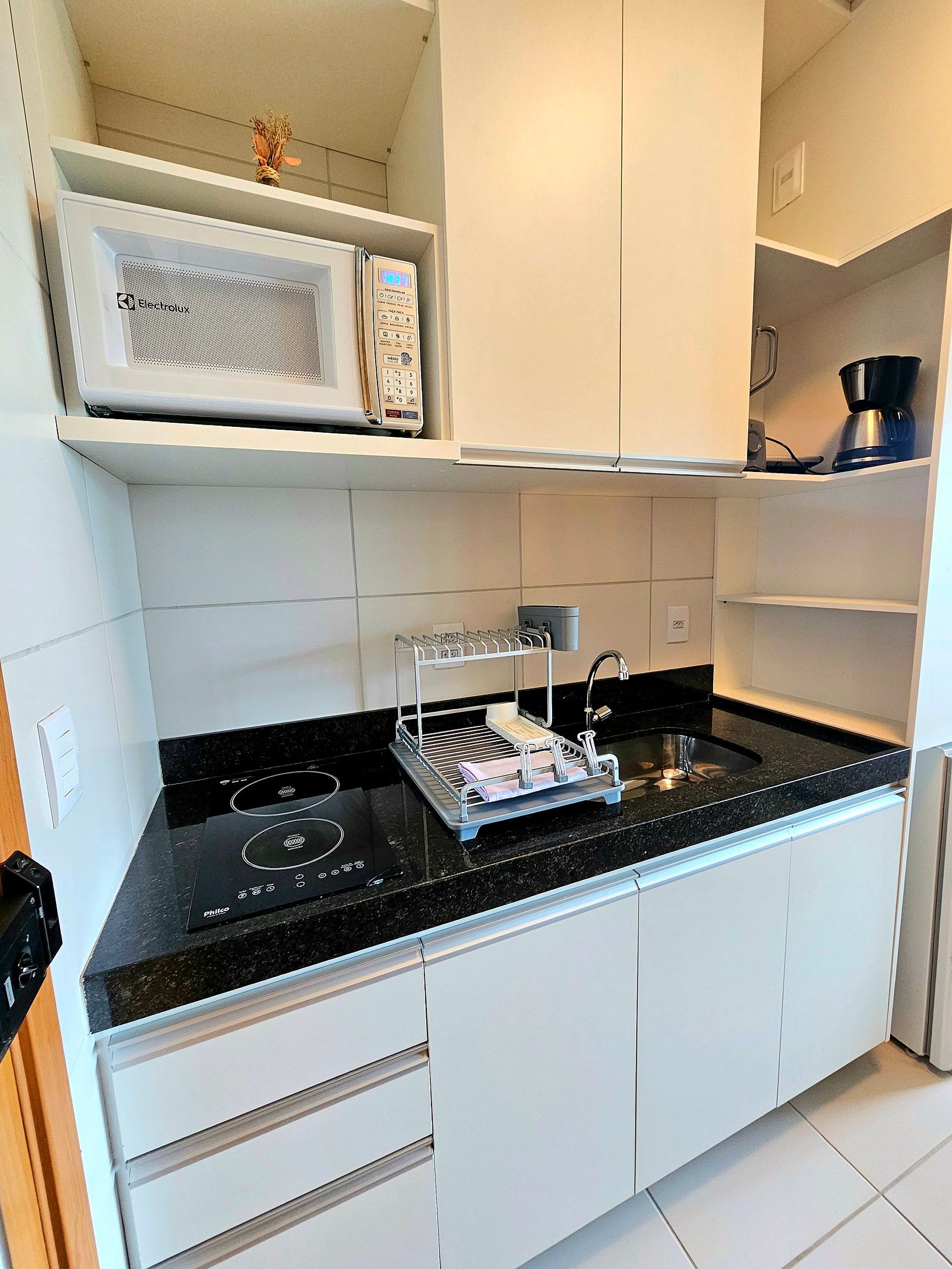Possui cozinha completa e bem equipada, com os principais eletrodomésticos (Frigobar, cooktop, airfryer, cafeteira, sanduicheira, liquidificador...), além de ser bem completa em utensílios.