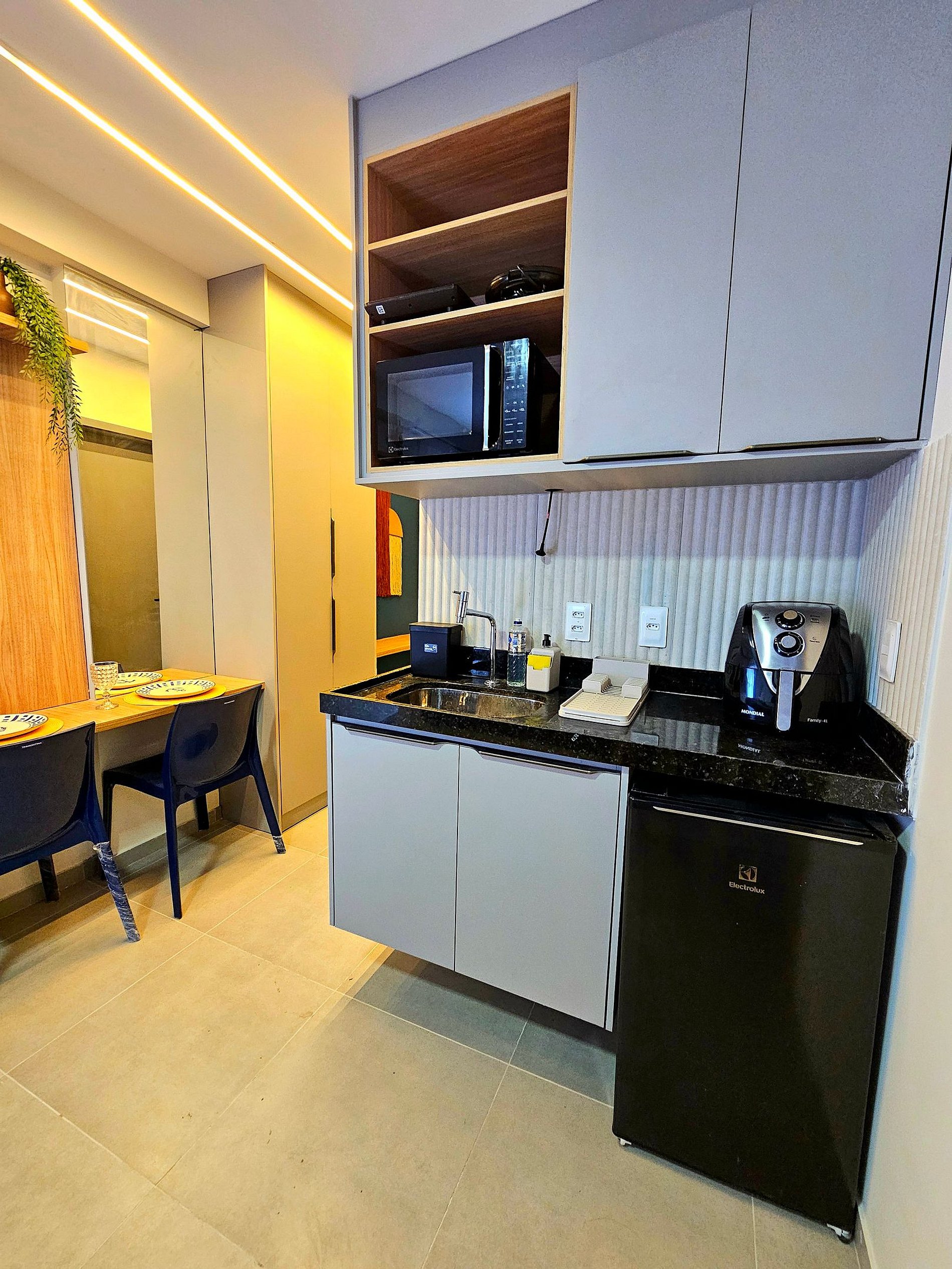 A cozinha completa é equipada com os principais eletrodomésticos, como frigobar, microondas, cooktop, cafeteira, liquidificador, sanduicheira e airfryer, além de todos os utensílios necessários para que você possa preparar suas refeições de maneira prática e confortável.