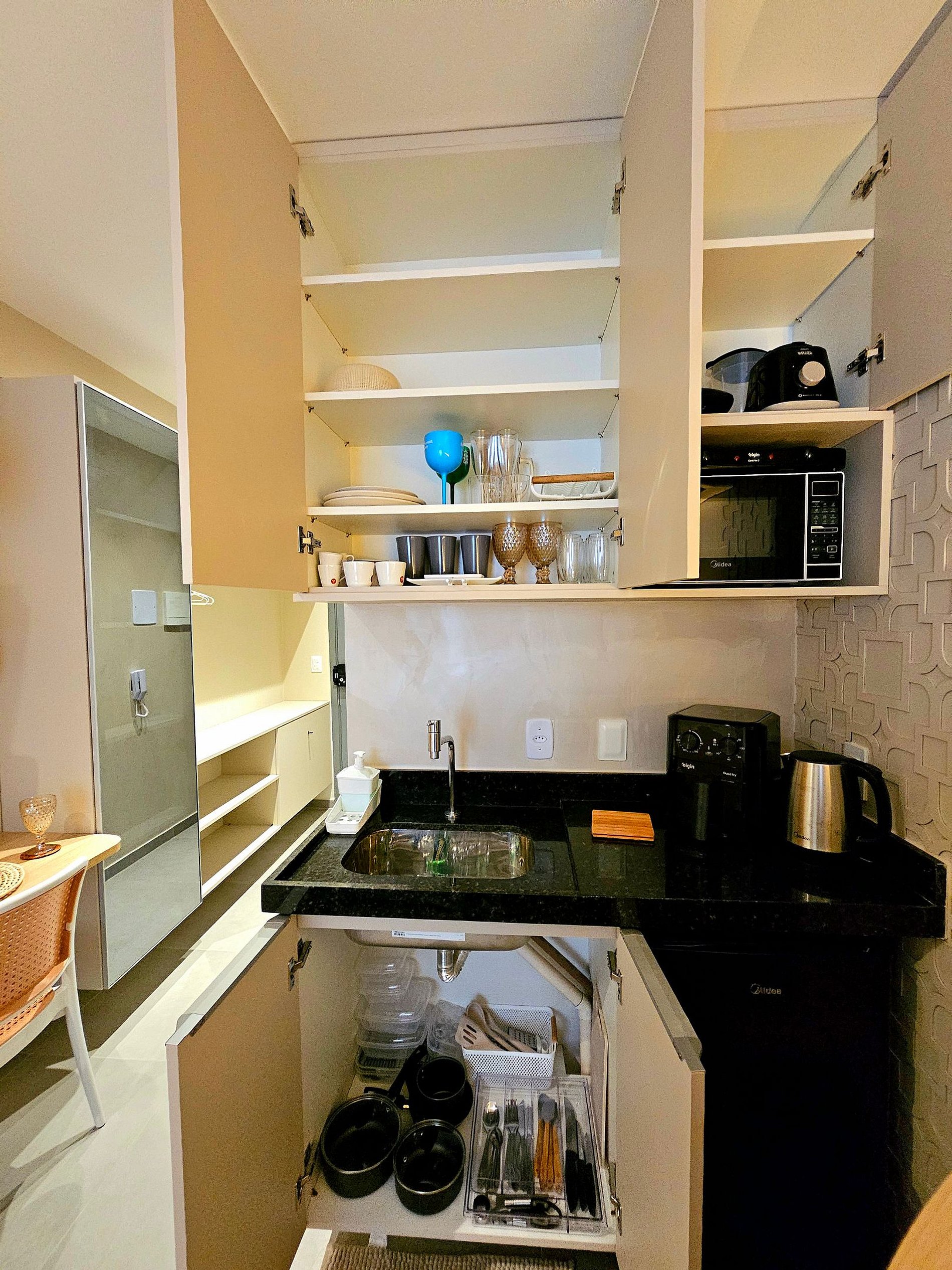 A cozinha completa é equipada com os principais eletrodomésticos, como frigobar, microondas, cooktop, liquidificador, sanduicheira e airfryer, além de todos os utensílios necessários para que você possa preparar suas refeições de maneira prática e confortável.