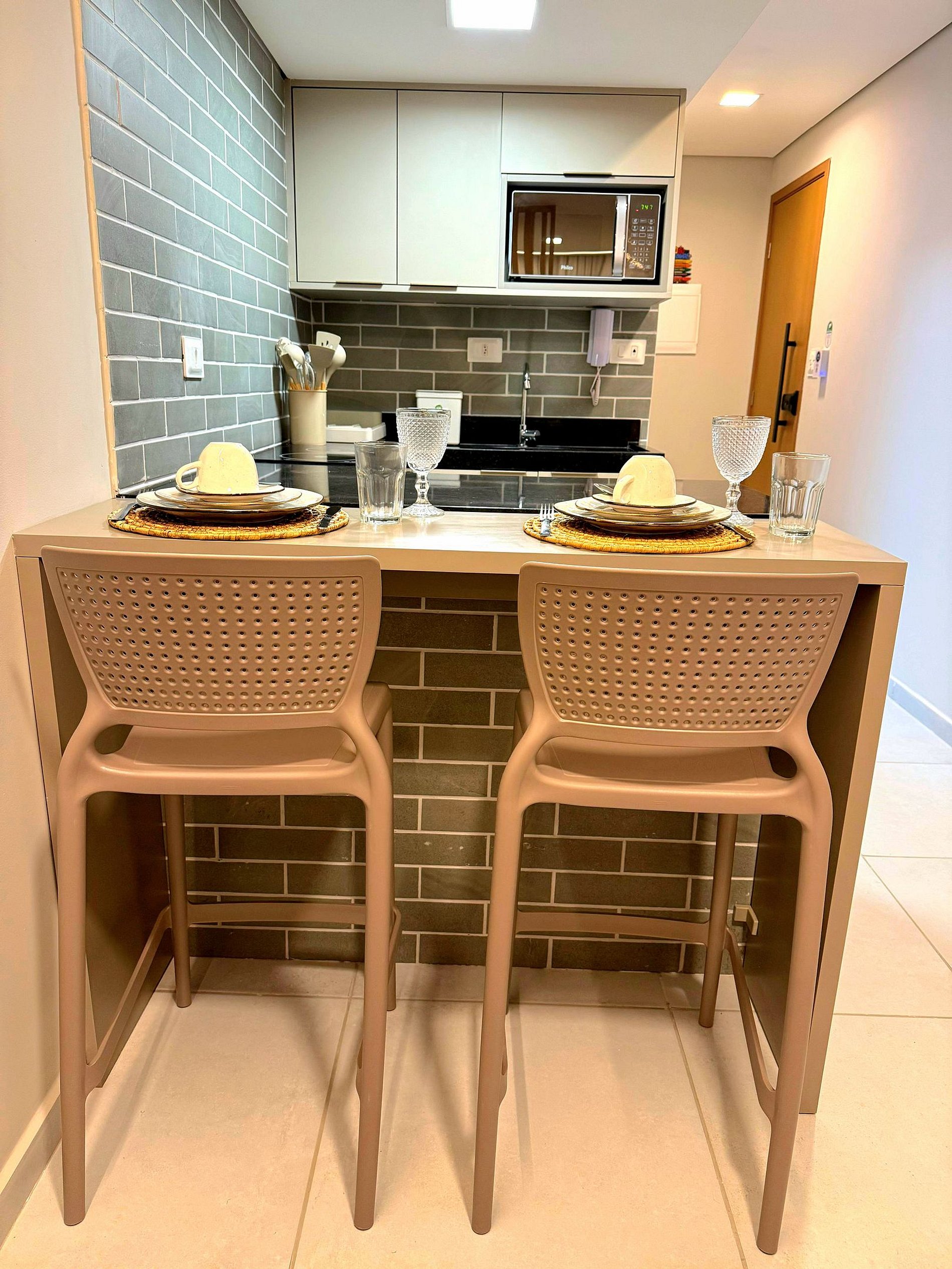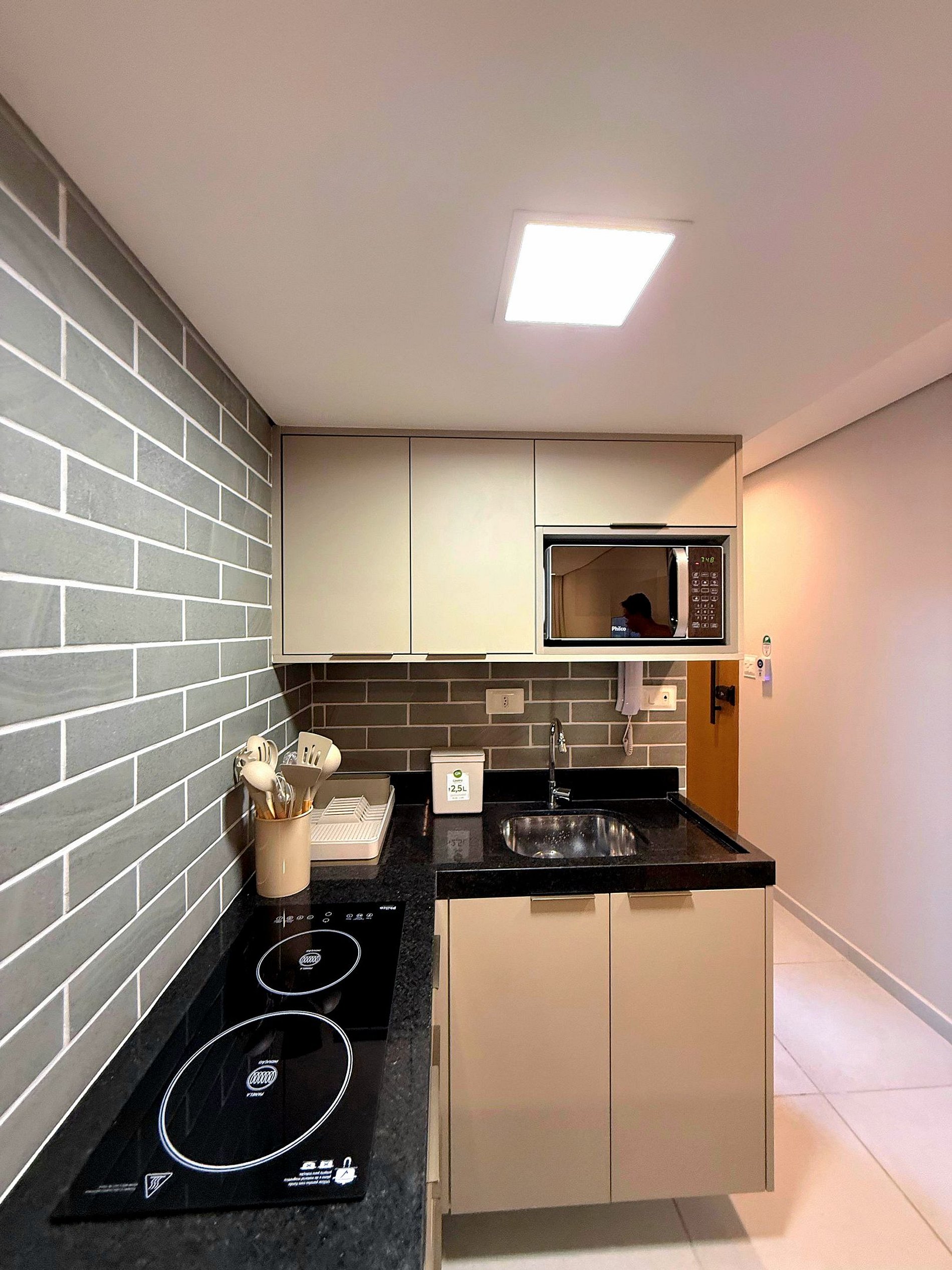 A cozinha é totalmente equipada com eletrodomésticos de alta qualidade, incluindo cooktop, geladeira, micro-ondas, airfryer, sanduicheira, liquidificador, cafeteira e todos os utensílios (panelas, copos, taças, pratos e talheres) para realizar sua refeição.