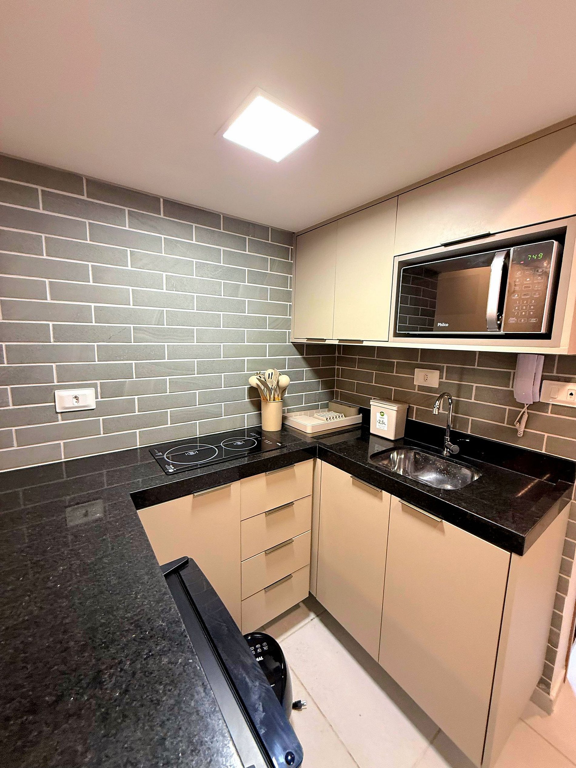 A cozinha é totalmente equipada com eletrodomésticos de alta qualidade, incluindo cooktop, geladeira, micro-ondas, airfryer, sanduicheira, liquidificador, cafeteira e todos os utensílios (panelas, copos, taças, pratos e talheres) para realizar sua refeição.