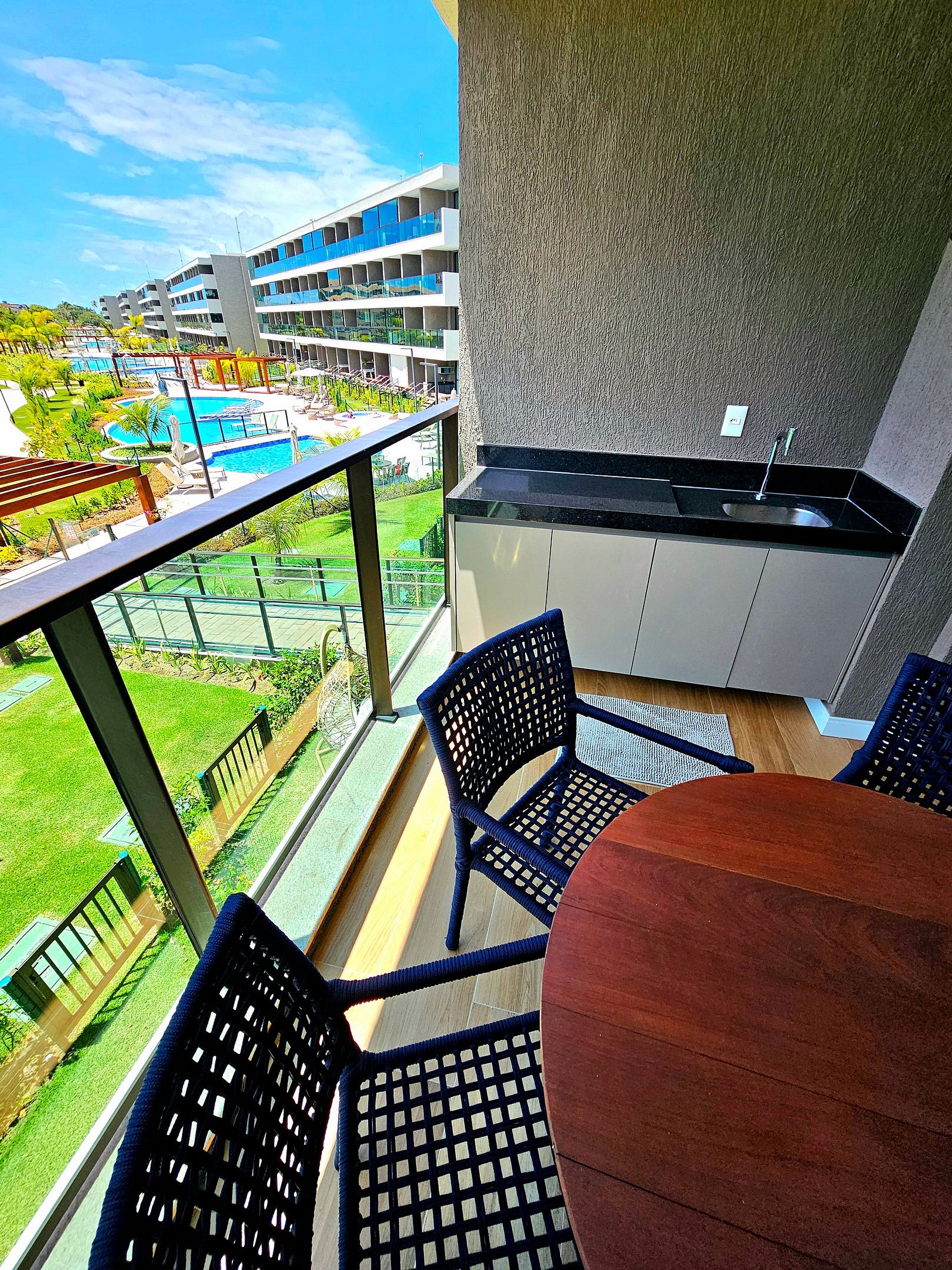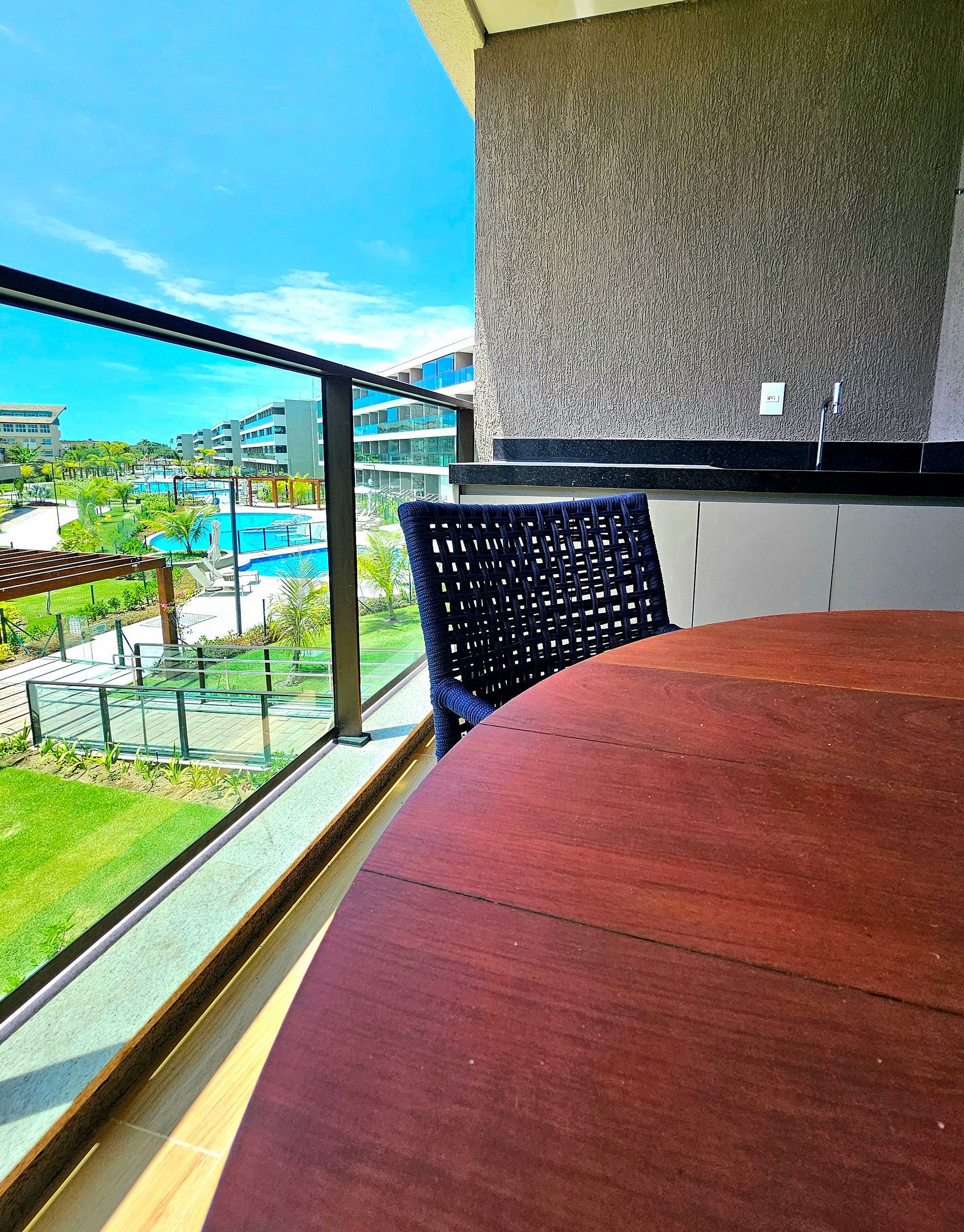 A Cereja do Bolo é nossa varanda gourmet com uma ótima mesa para refeições e vista para o complexo aquático do empreendimento.
