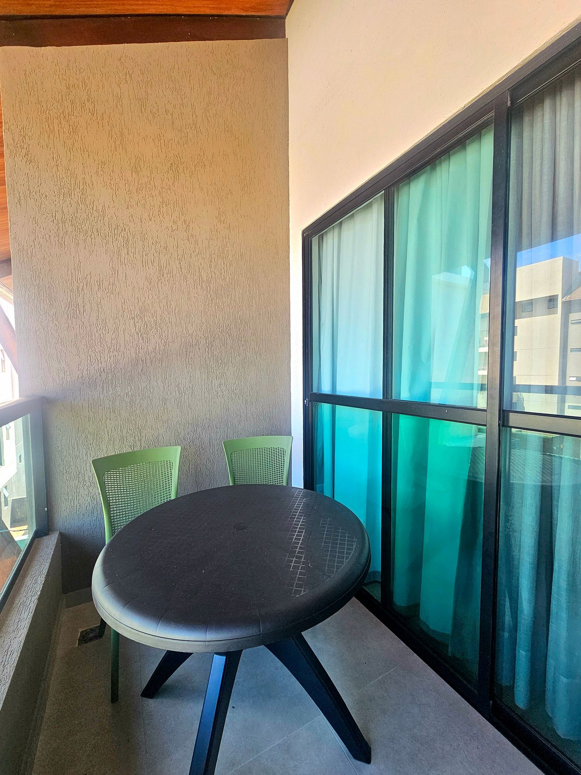 A sala dispõe de uma smart TV, garantindo momentos de lazer e entretenimento durante a sua estadia. O ambiente se estende até uma espaçosa varanda, onde há uma mesa para 2 pessoas, ideal para refeições ao ar livre ou para relaxar enquanto aprecia o clima tropical de Porto de Galinhas.
