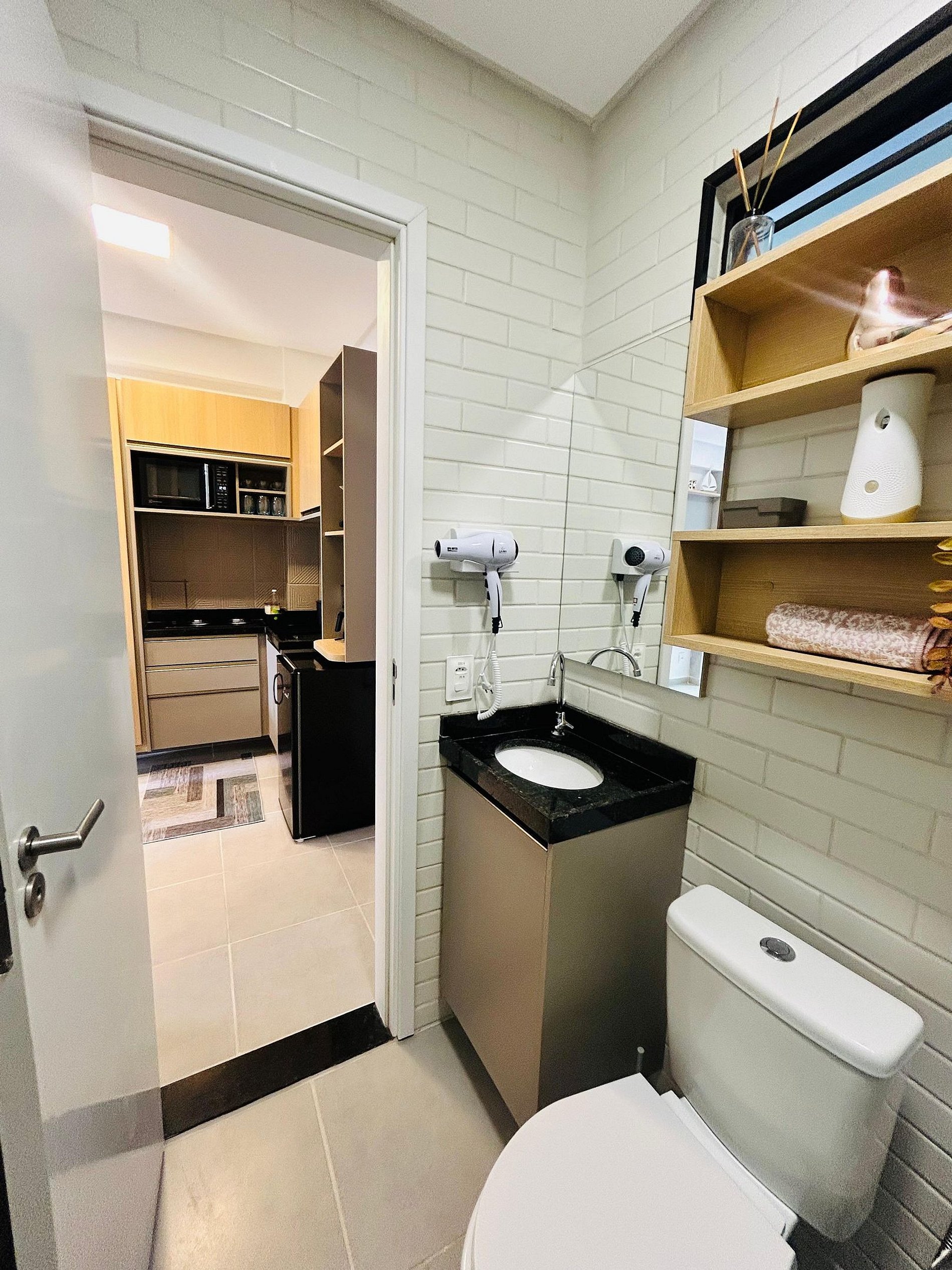 - Cozinha equipada com cooktop, micro-ondas, cafeteira, sanduicheira, liquidificador, airfryer e geladeira.