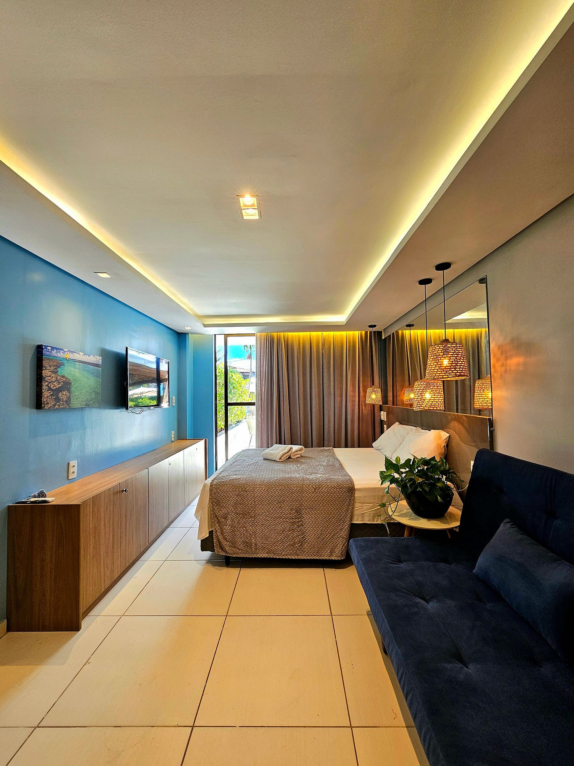 O Flat possui uma decoração sofisticada que proporciona um ambiente relaxante após um dia de passeios em Porto de Galinhas e Muro Alto.