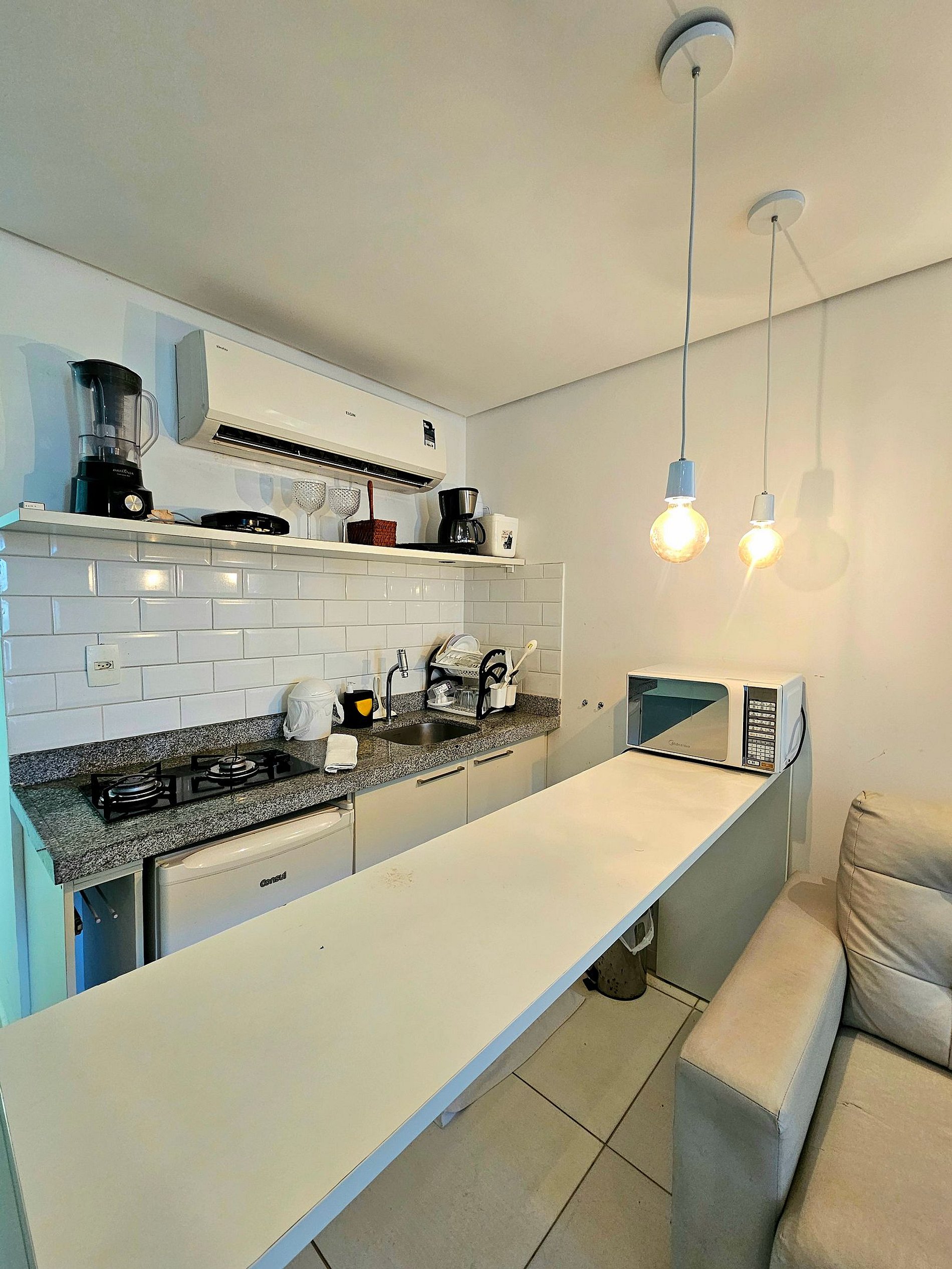 A cozinha completa é equipada com os principais eletrodomésticos, como frigobar, microondas, cooktop, cafeteira, liquidificador e sanduicheira, além de todos os utensílios necessários para que você possa preparar suas refeições de maneira prática e confortável.