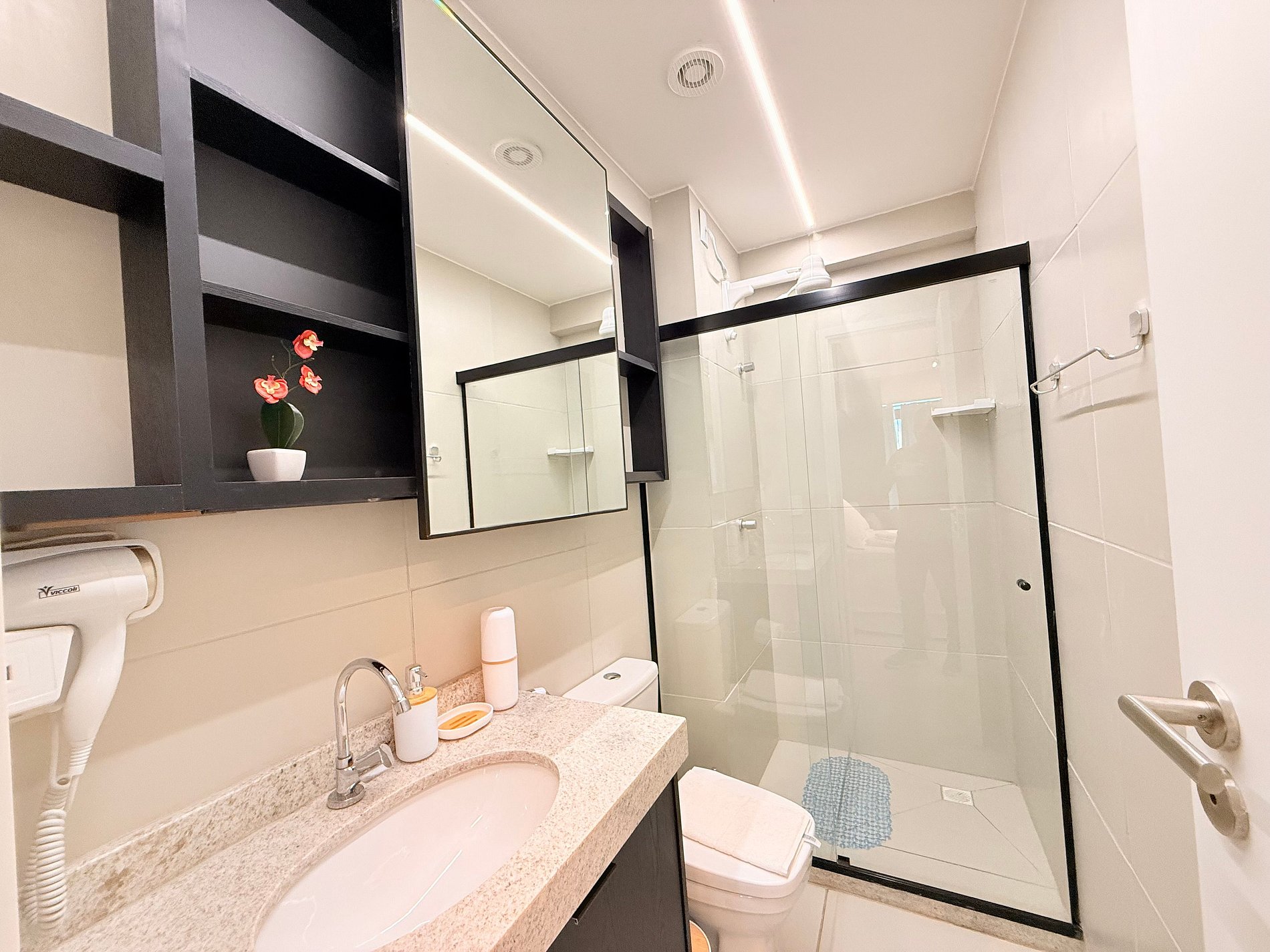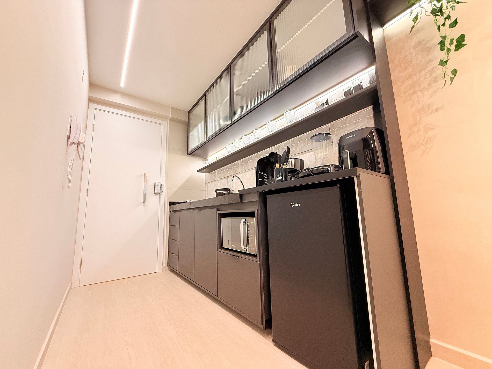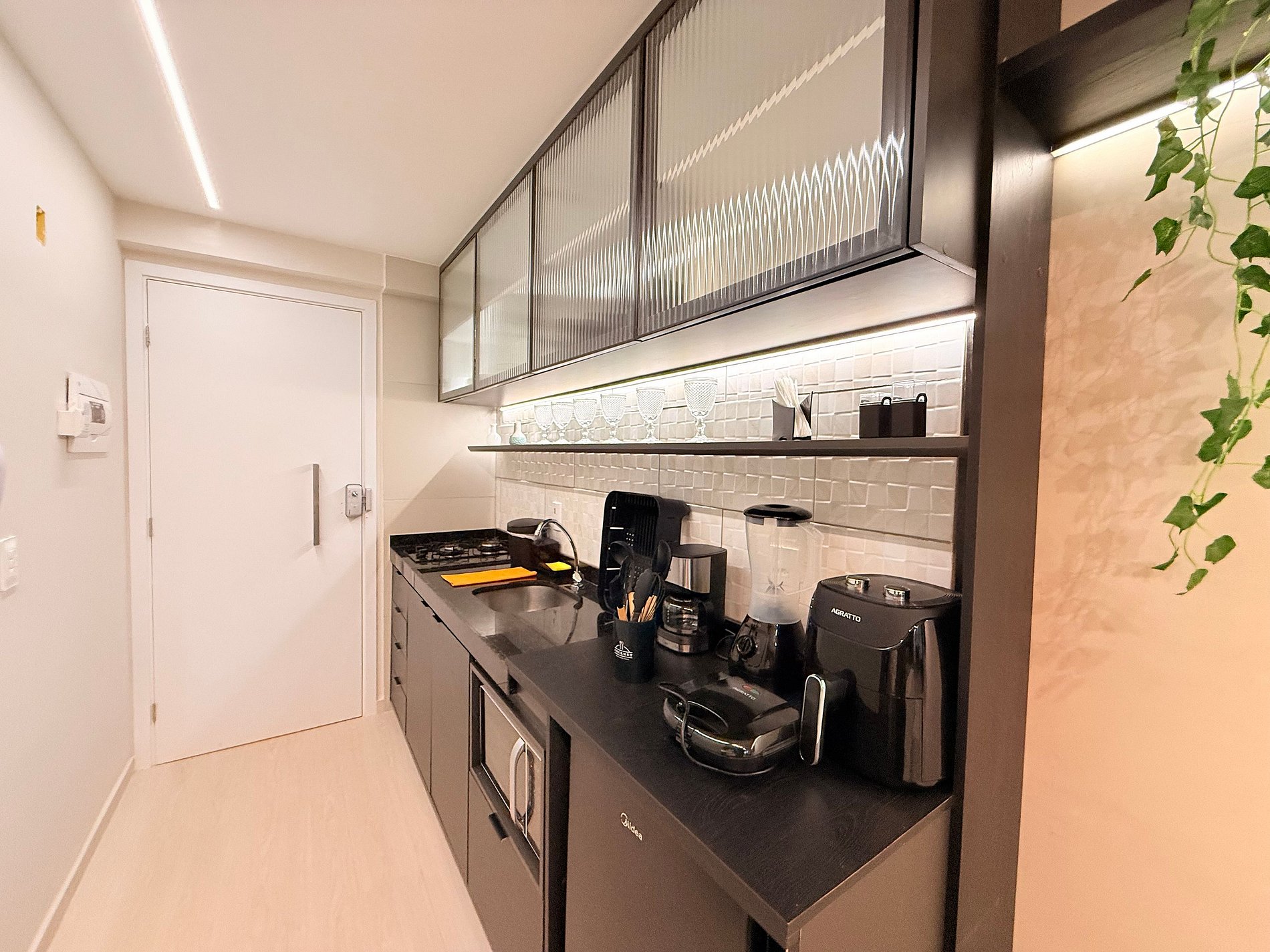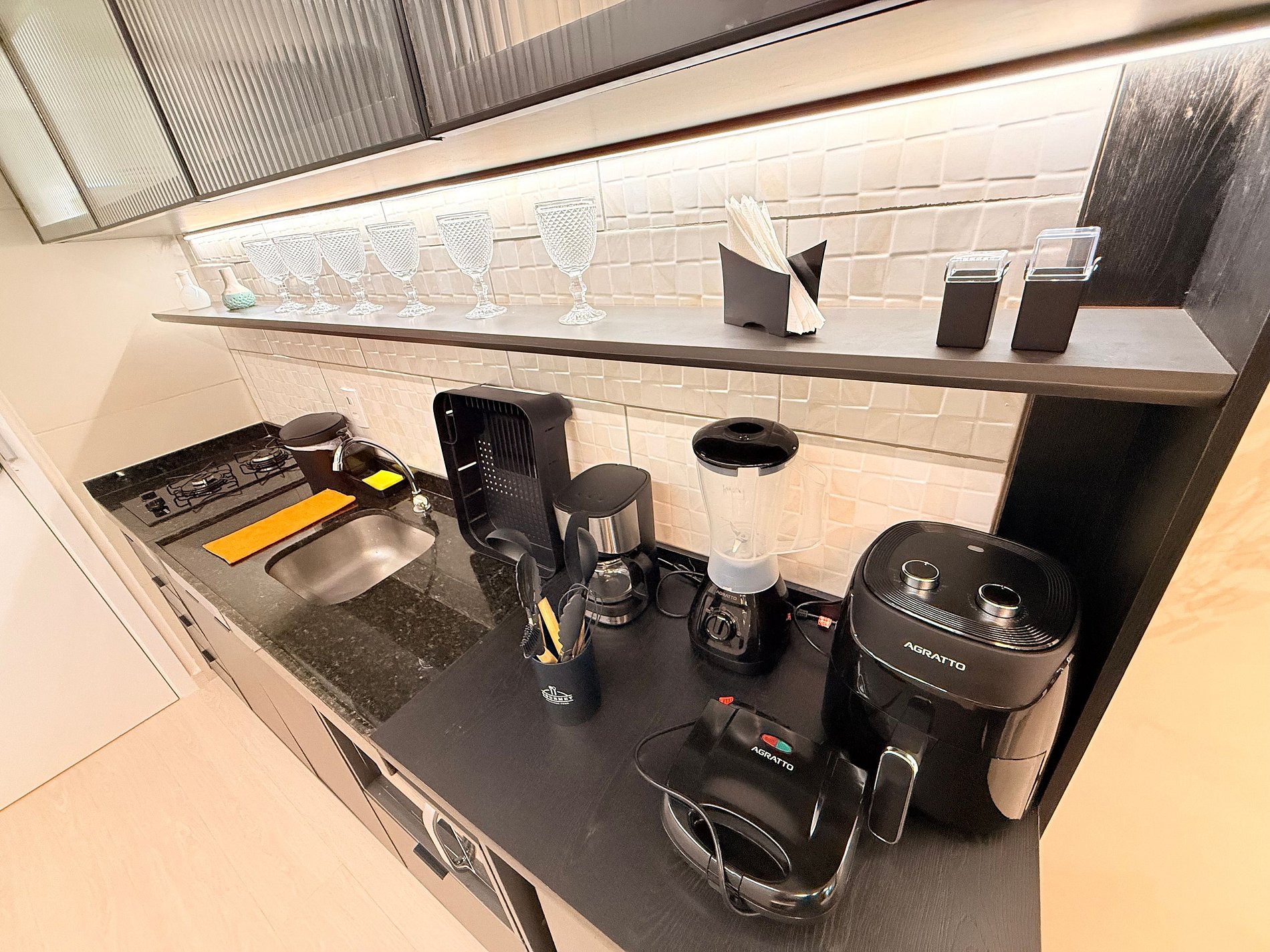 A cozinha é um grande diferencial: totalmente completa, conta com airfryer, liquidificador, sanduicheira, cafeteira, fogão cooktop, micro-ondas e frigobar, oferecendo tudo o que você precisa para preparar desde refeições rápidas até pratos mais elaborados.