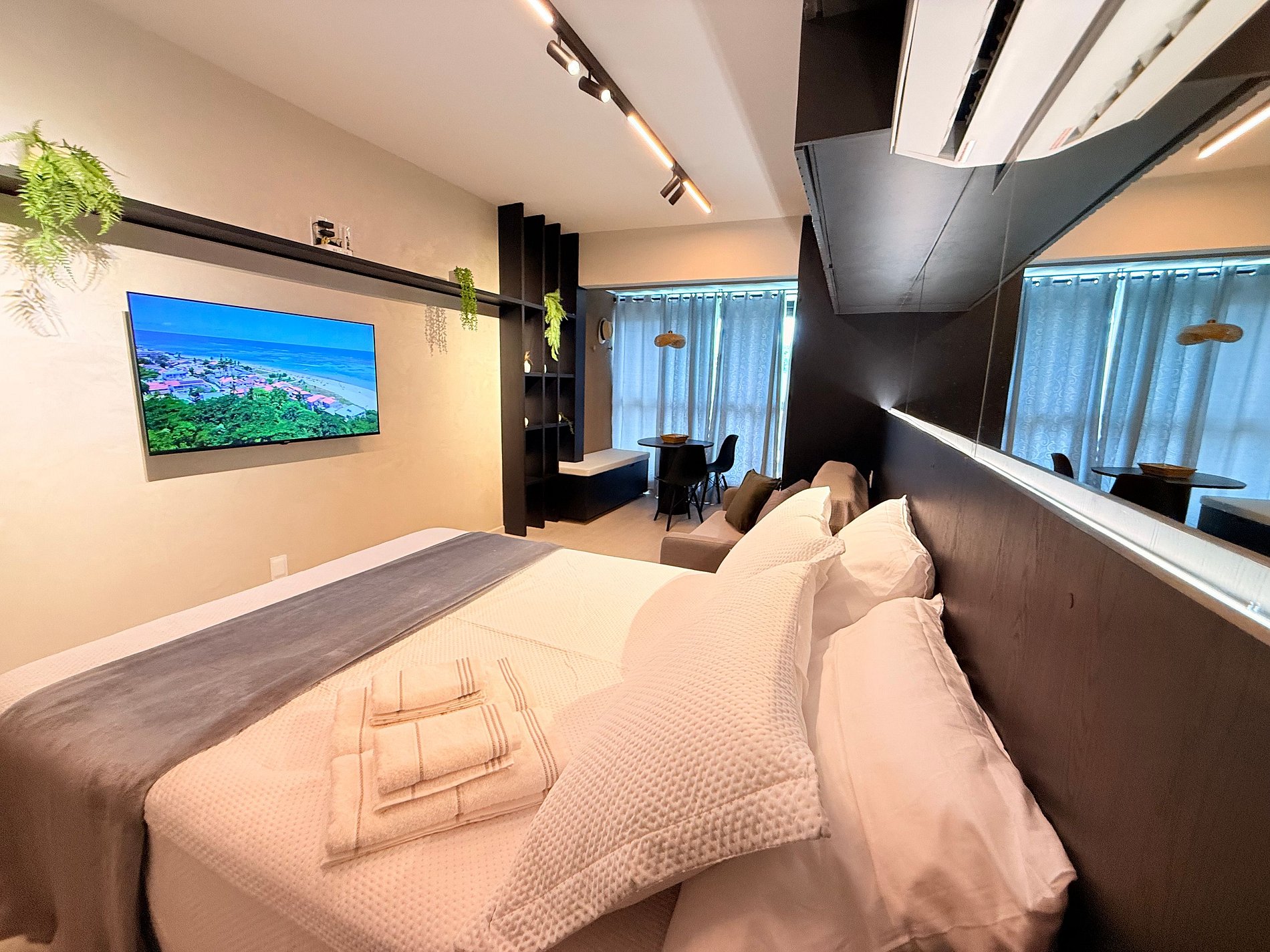 O flat acomoda confortavelmente até 4 hóspedes, com uma cama extremamente confortável e um sofá-cama muito aconchegante, garantindo noites de descanso perfeitas após dias de sol e mar.
