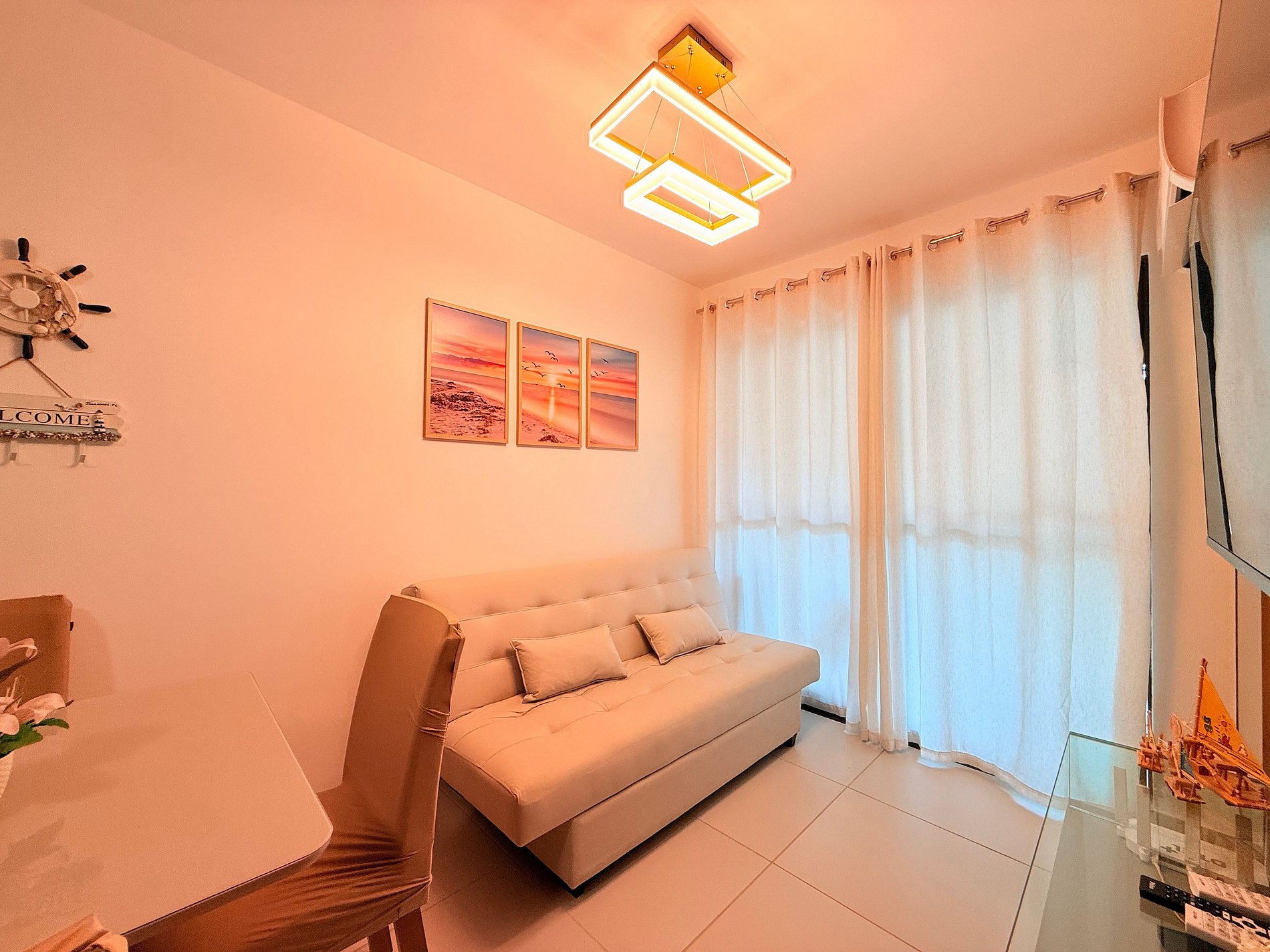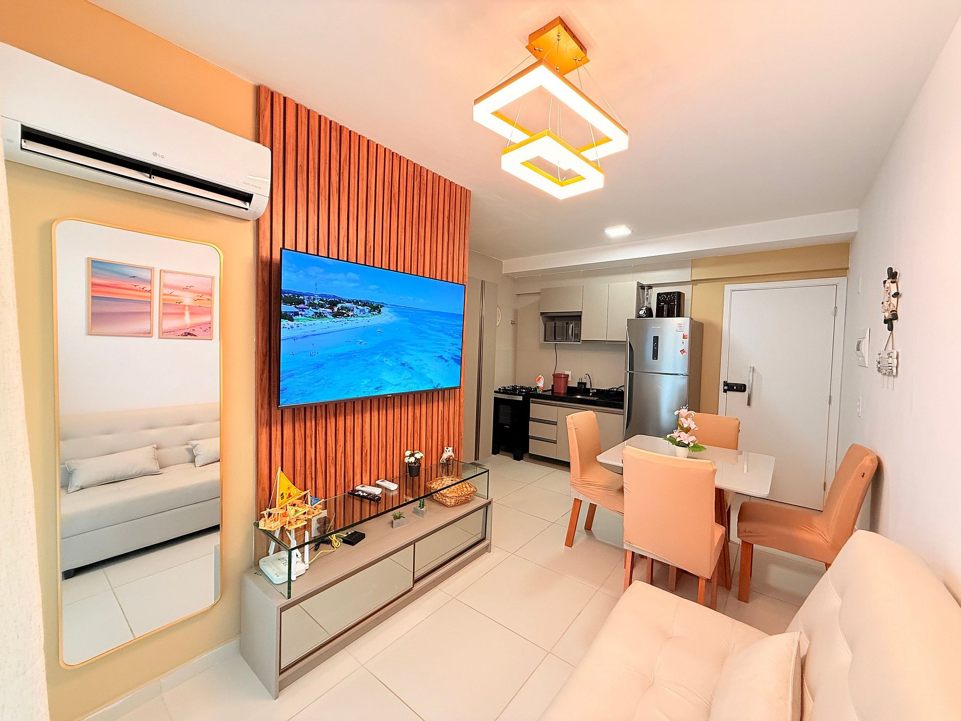 Sala ampla, com sofá-cama, TV, ar-condicionado e mesa de jantar com 4 cadeiras