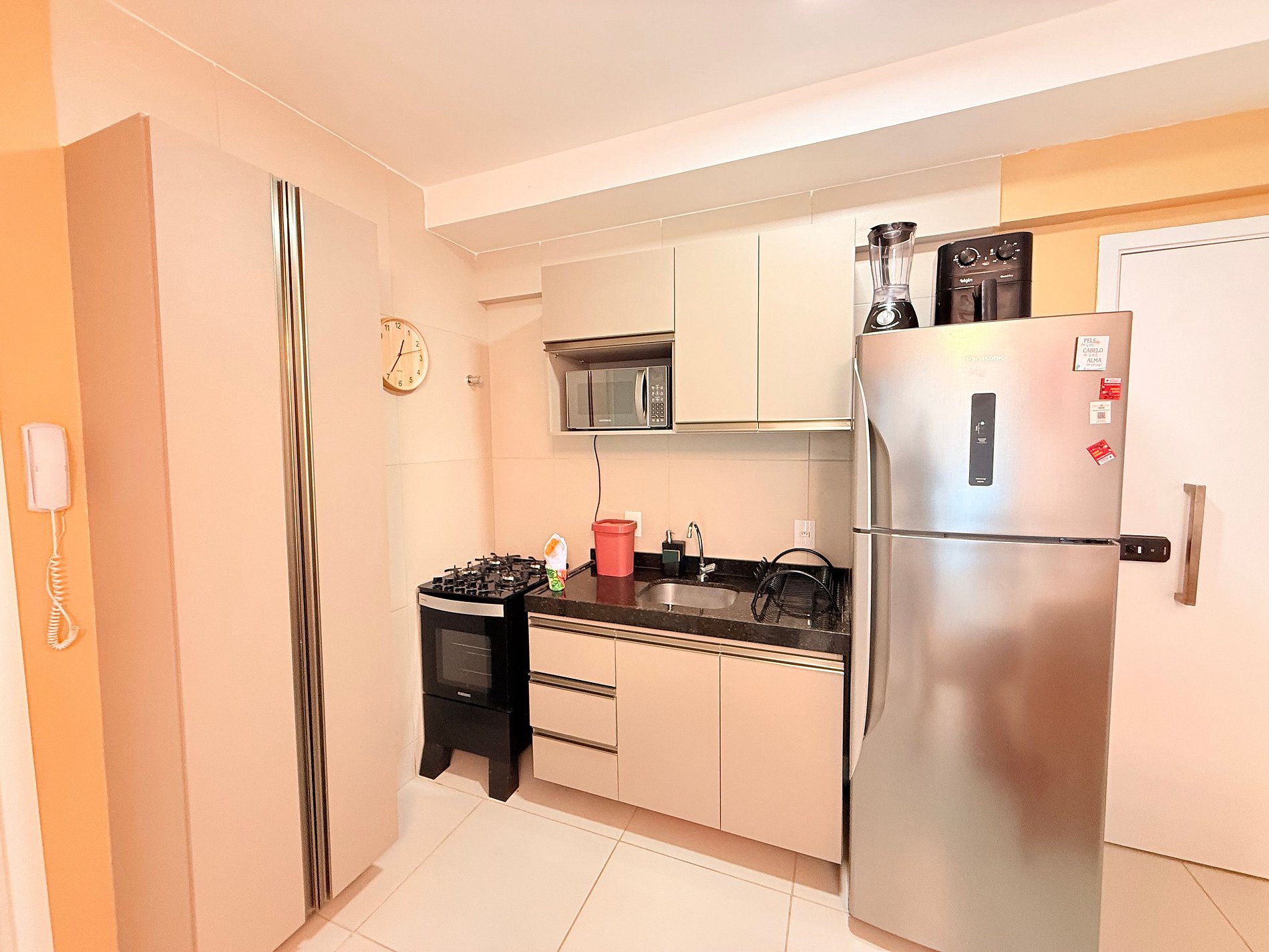 Cozinha totalmente equipada, perfeita para qualquer refeição, com fogão, geladeira, micro-ondas, liquidificador, cafeteira, sanduicheira, além de taças, copos, talheres e todos os utensílios necessários