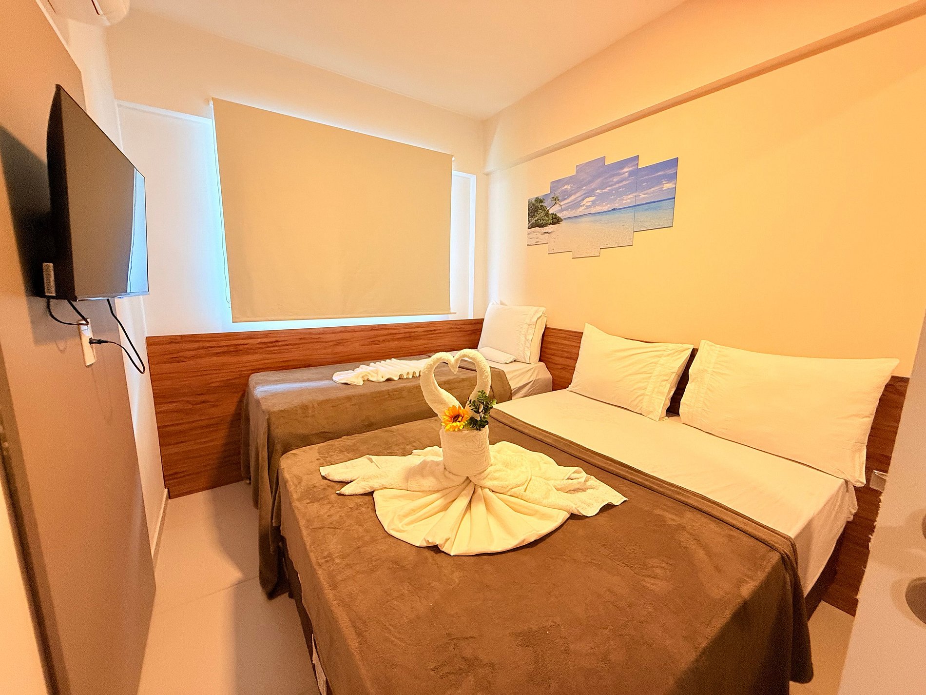 Quarto separado da sala, com 1 cama de casal extremamente confortável e 1 cama de solteiro