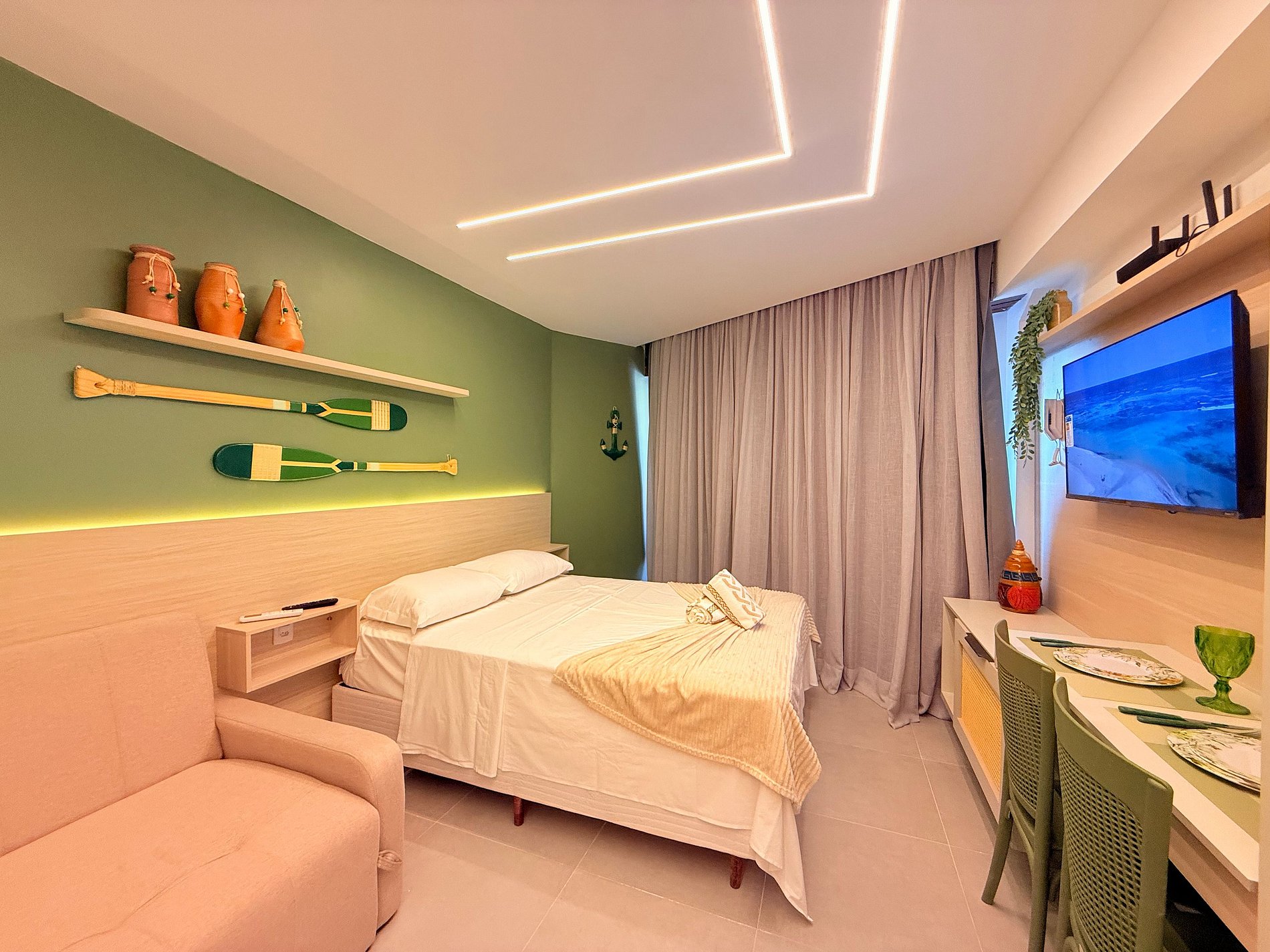O flat oferece um ambiente moderno e acolhedor, perfeito para quem busca descanso e praticidade, seja em uma viagem romântica ou dias de lazer. O espaço foi cuidadosamente planejado para acomodar até 4 pessoas com muito conforto, sendo perfeito para casais, famílias pequenas ou amigos.O estúdio conta com uma cama de casal extremamente confortável e um sofá-cama, garantindo noites de descanso tranquilas após um dia aproveitando o mar de águas calmas e cristalinas. O ambiente é moderno, bem distribuído e acolhedor, proporcionando sensação de bem-estar desde o primeiro momento.
