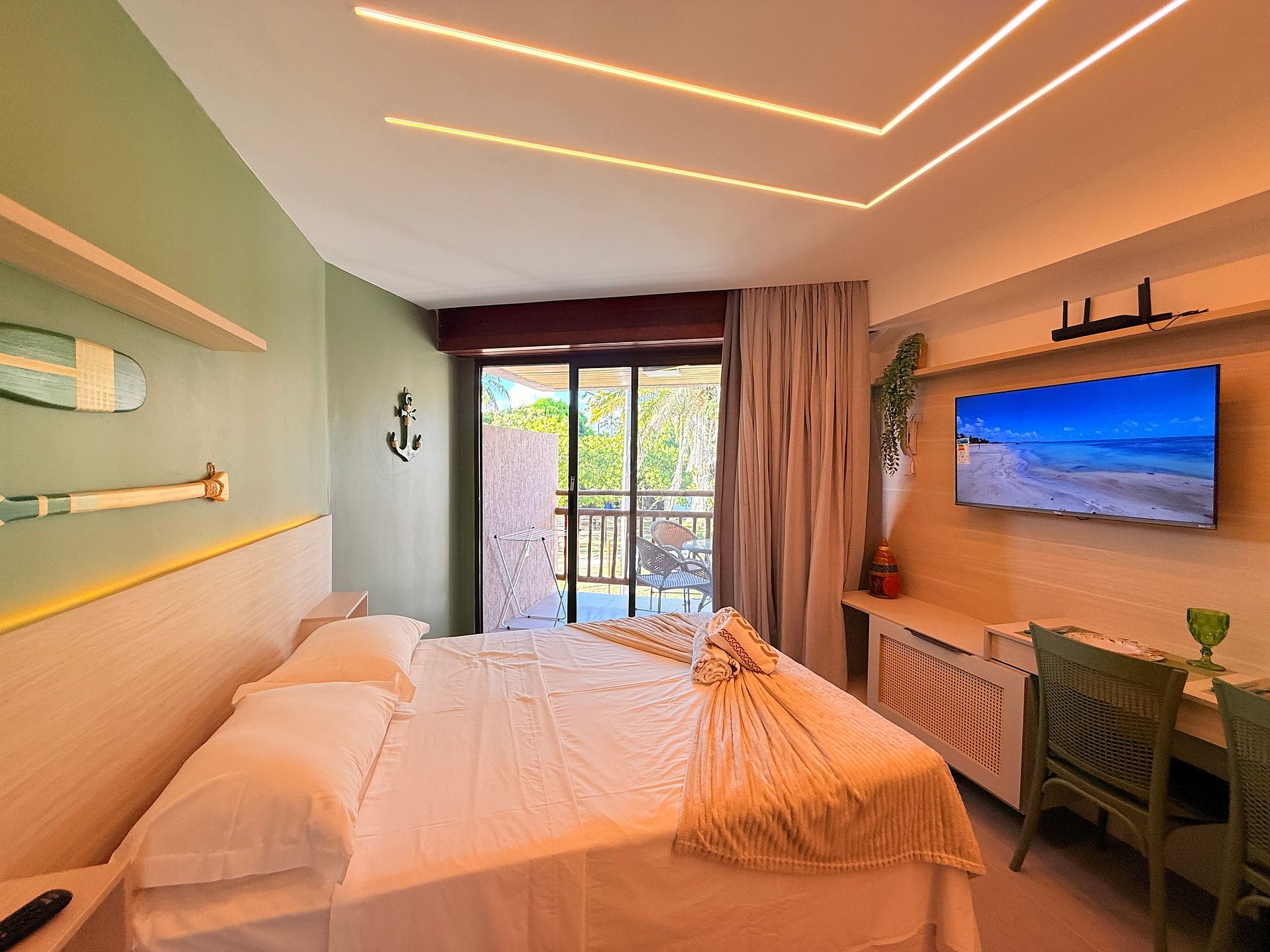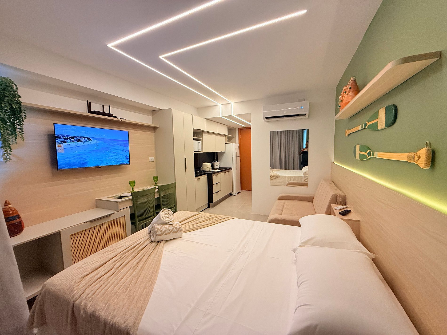 O flat oferece um ambiente moderno e acolhedor, perfeito para quem busca descanso e praticidade, seja em uma viagem romântica ou dias de lazer. O espaço foi cuidadosamente planejado para acomodar até 4 pessoas com muito conforto, sendo perfeito para casais, famílias pequenas ou amigos.O estúdio conta com uma cama de casal extremamente confortável e um sofá-cama, garantindo noites de descanso tranquilas após um dia aproveitando o mar de águas calmas e cristalinas. O ambiente é moderno, bem distribuído e acolhedor, proporcionando sensação de bem-estar desde o primeiro momento.
