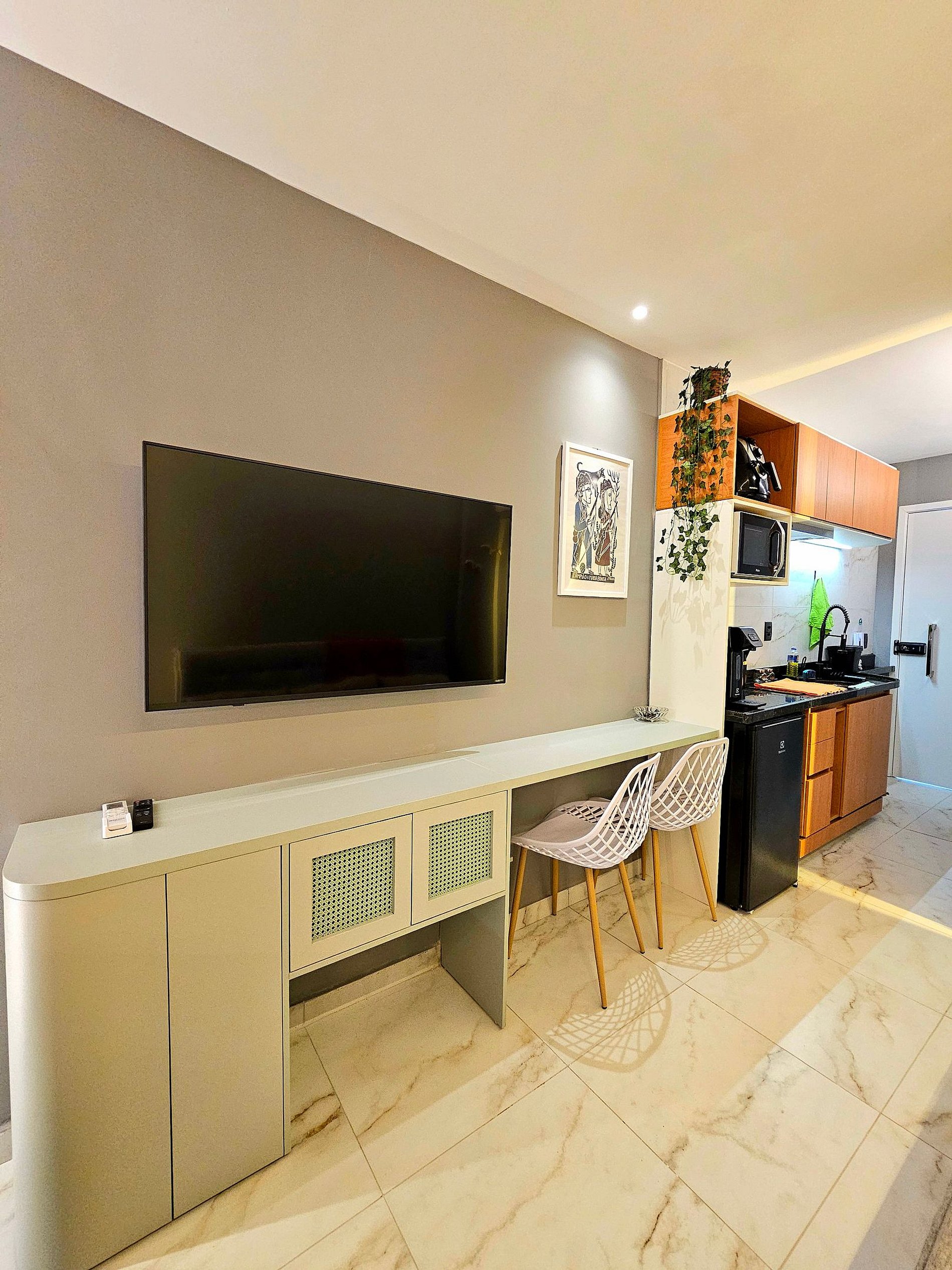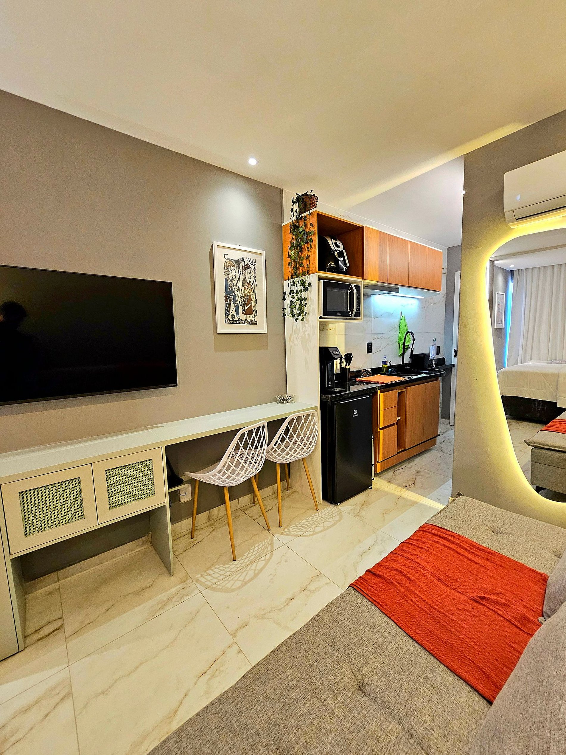 A cozinha é totalmente equipada com eletrodomésticos de alta qualidade, incluindo cooktop, frigobar, micro-ondas, airfryer, sanduicheira, liquidificador, cafeteira e todos os utensílios (panelas, copos, taças, pratos e talheres) para realizar sua refeição.
