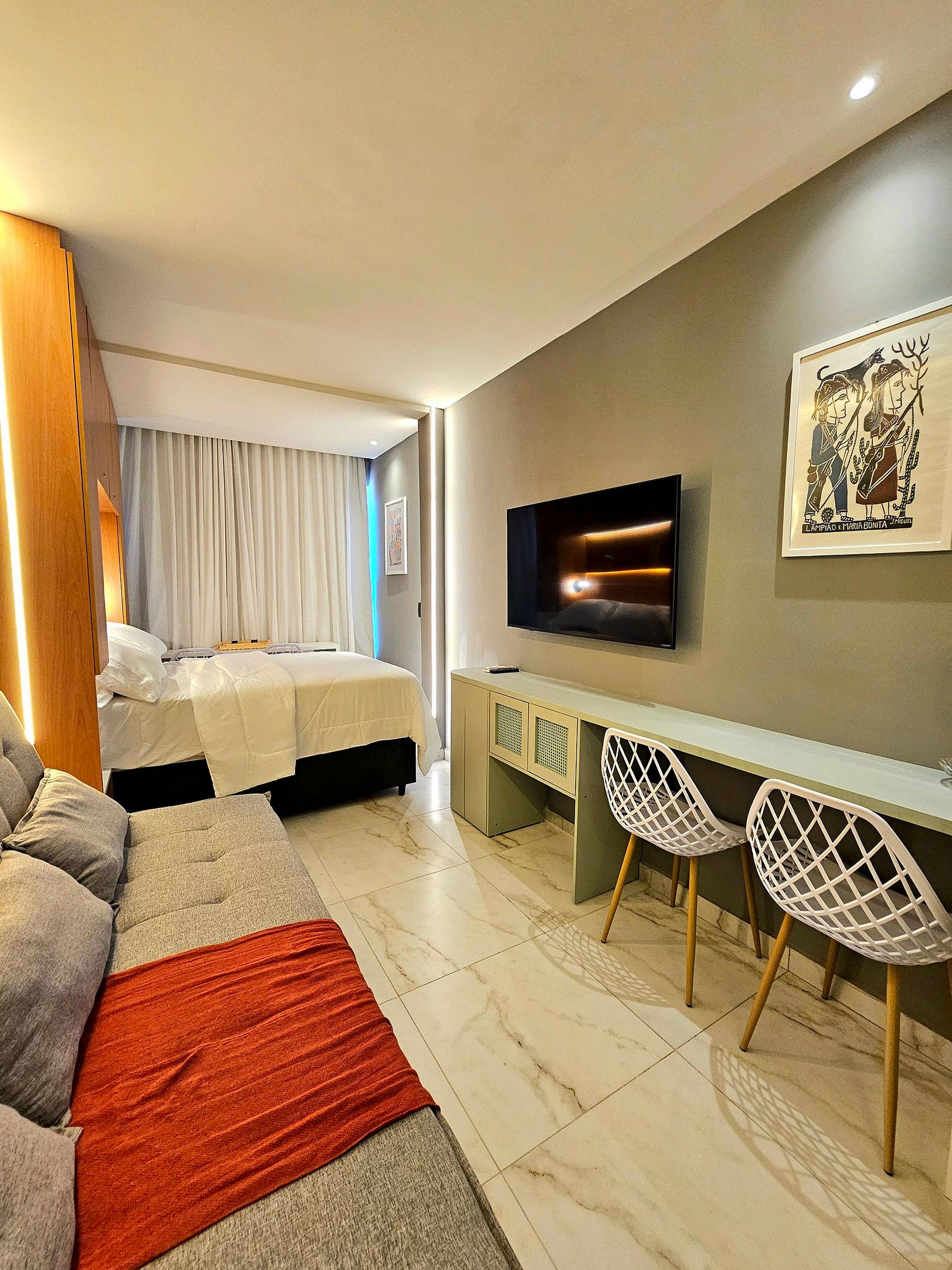 Acomoda bem até 3 hóspedes com uma cama de casal macia e um excelente sofá-cama.