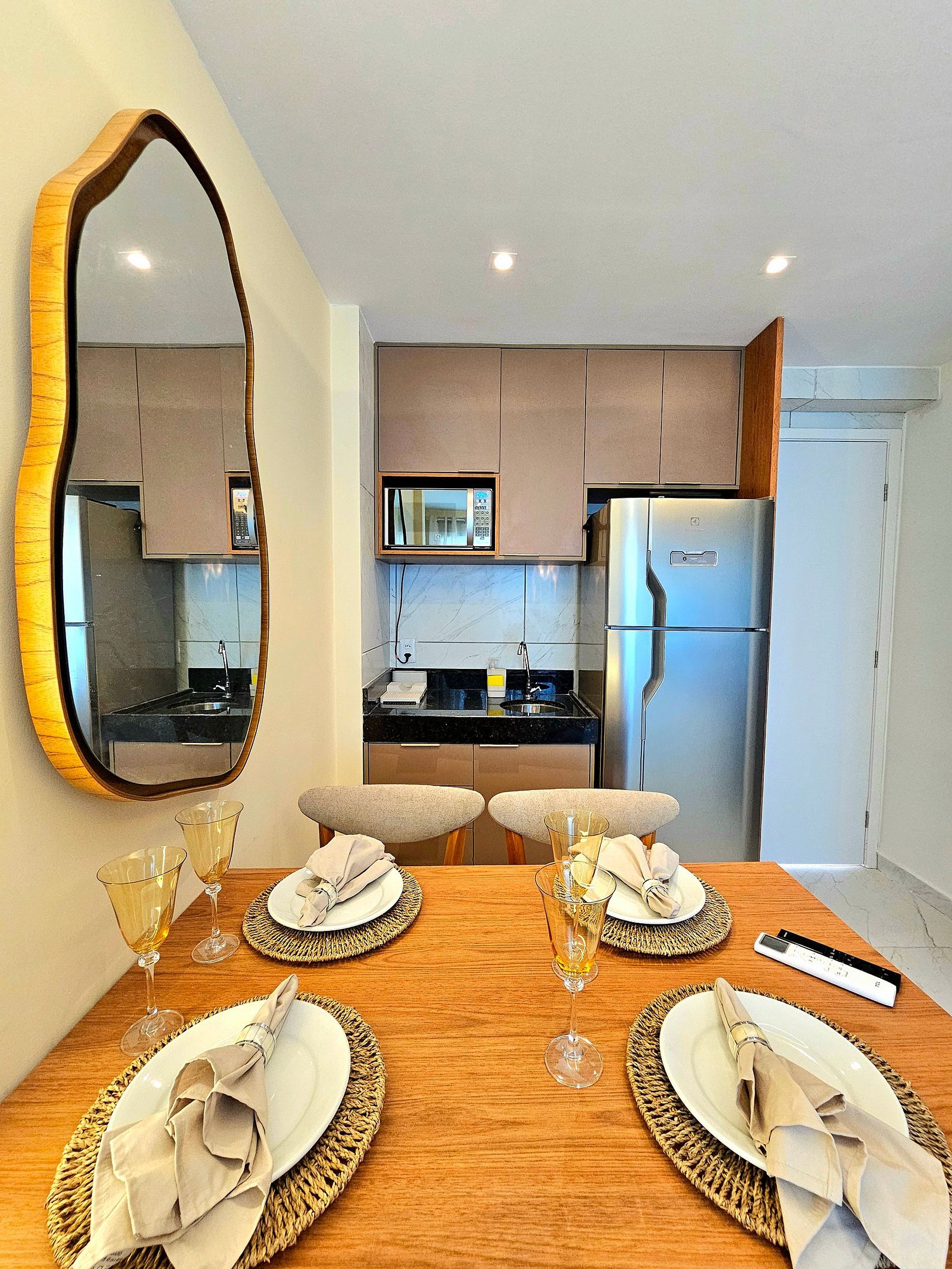 A cozinha é totalmente equipada com eletrodomésticos de alta qualidade, incluindo cooktop, geladeira, micro-ondas, airfryer, sanduicheira, liquidificador, cafeteira e todos os utensílios (panelas, copos, taças, pratos e talheres) para realizar sua refeição.