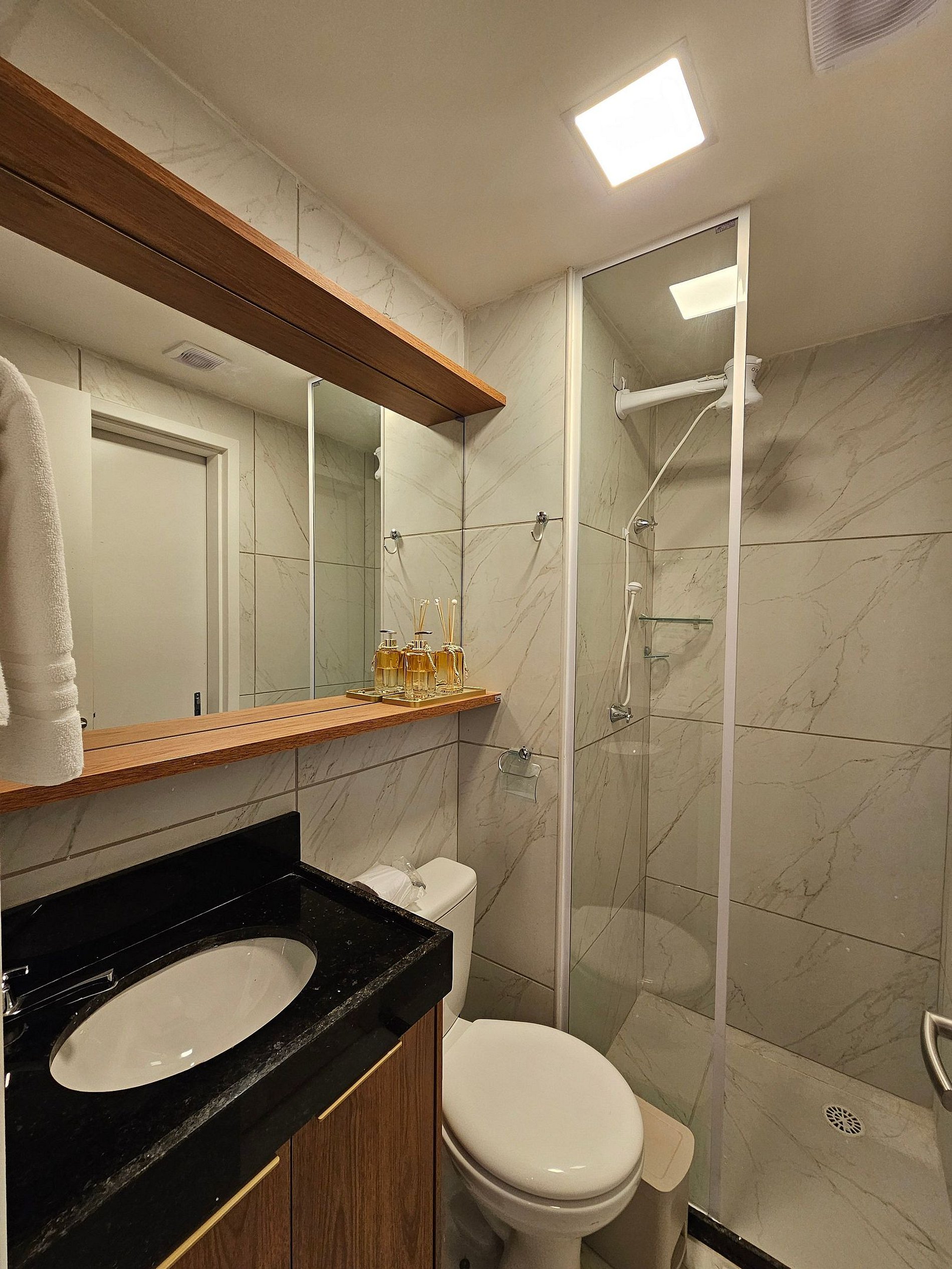 3. Banheiro (Social e faz parte da suíte reversível) com chuveiro elétrico, secador de cabelo e ferro de passar;