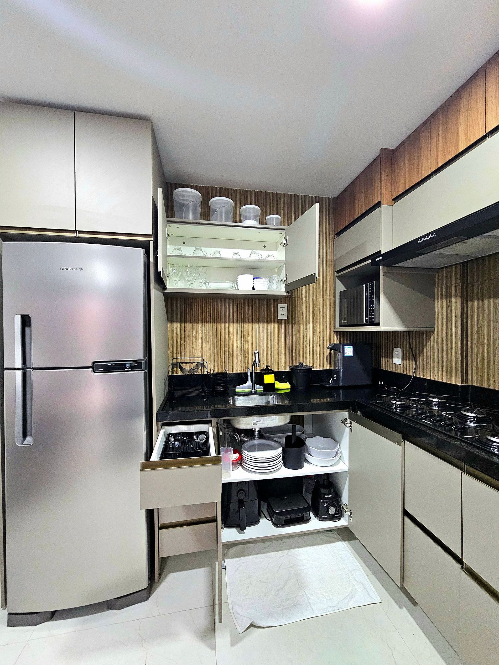 A cozinha completa é equipada com os principais eletrodomésticos, como geladeira, microondas, cooktop, liquidificador, sanduicheira e airfryer, além de todos os utensílios necessários para que você possa preparar suas refeições de maneira prática e confortável.