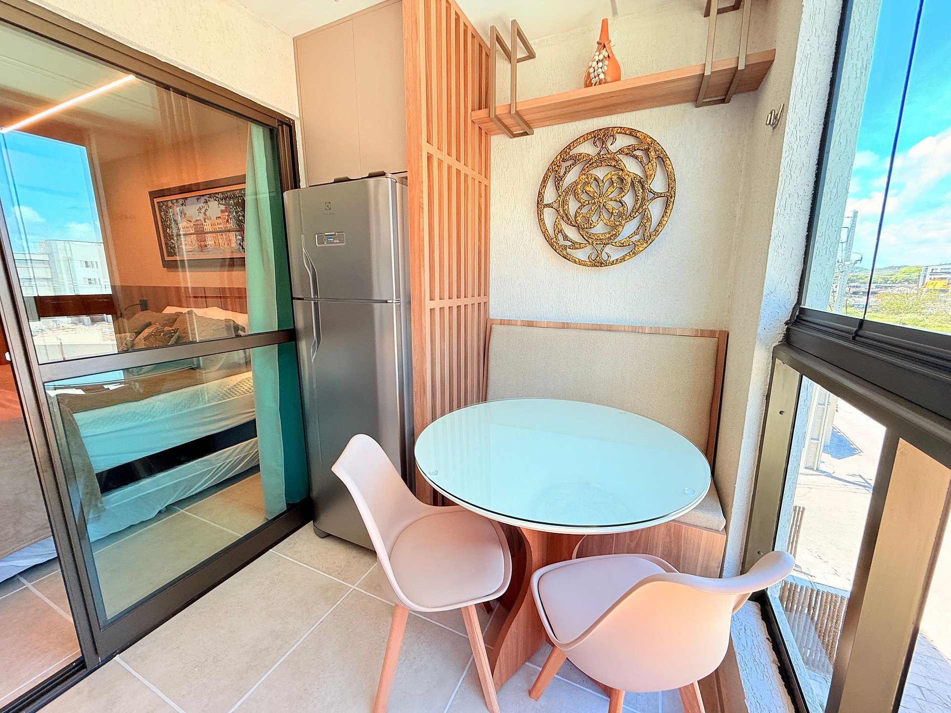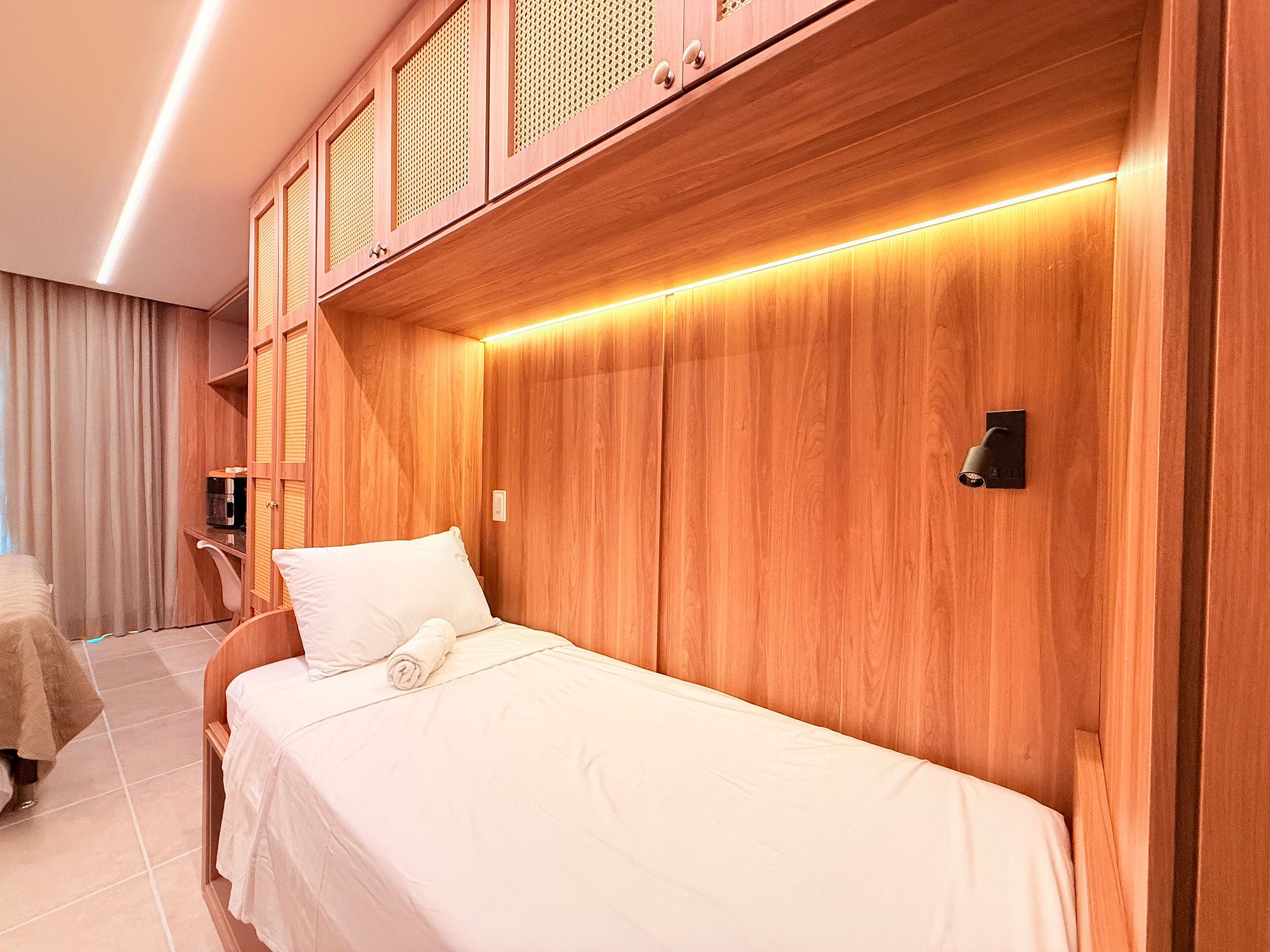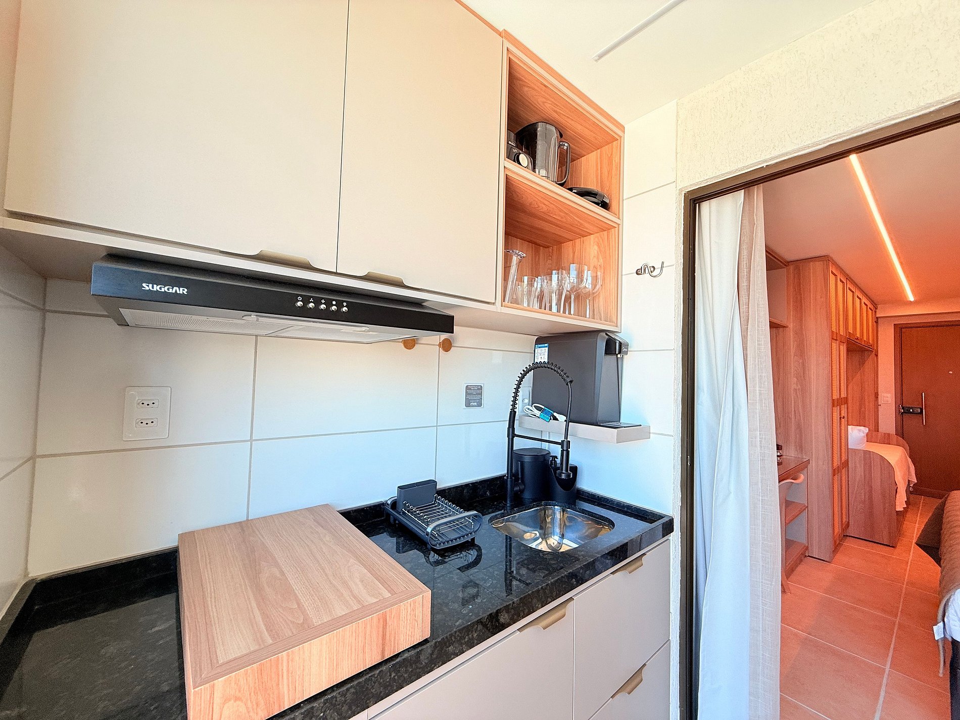 O espaço acomoda confortavelmente até 4 hóspedes com 1 cama de casal queen extremamente confortável com cama auxiliar e 1 cama de solteiro unindo funcionalidade e requinte em ambiente climatizado, bem distribuídos e extremamente aconchegantes — ideais para relaxar com estilo após dias de lazer e praia. A cozinha é totalmente equipada com todos os itens necessários para preparar qualquer refeição incluindo air fryer, cafeteira, geladeira, cooktop, sanduícheira, liquidificador, copos, taças e todos os utensílios de apoio para cozinha.