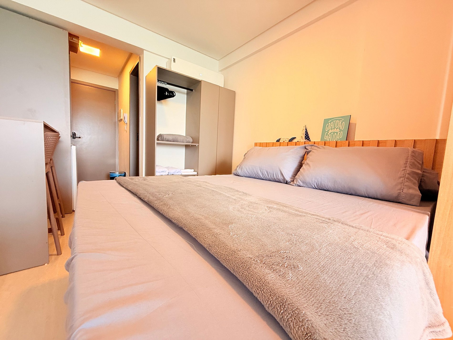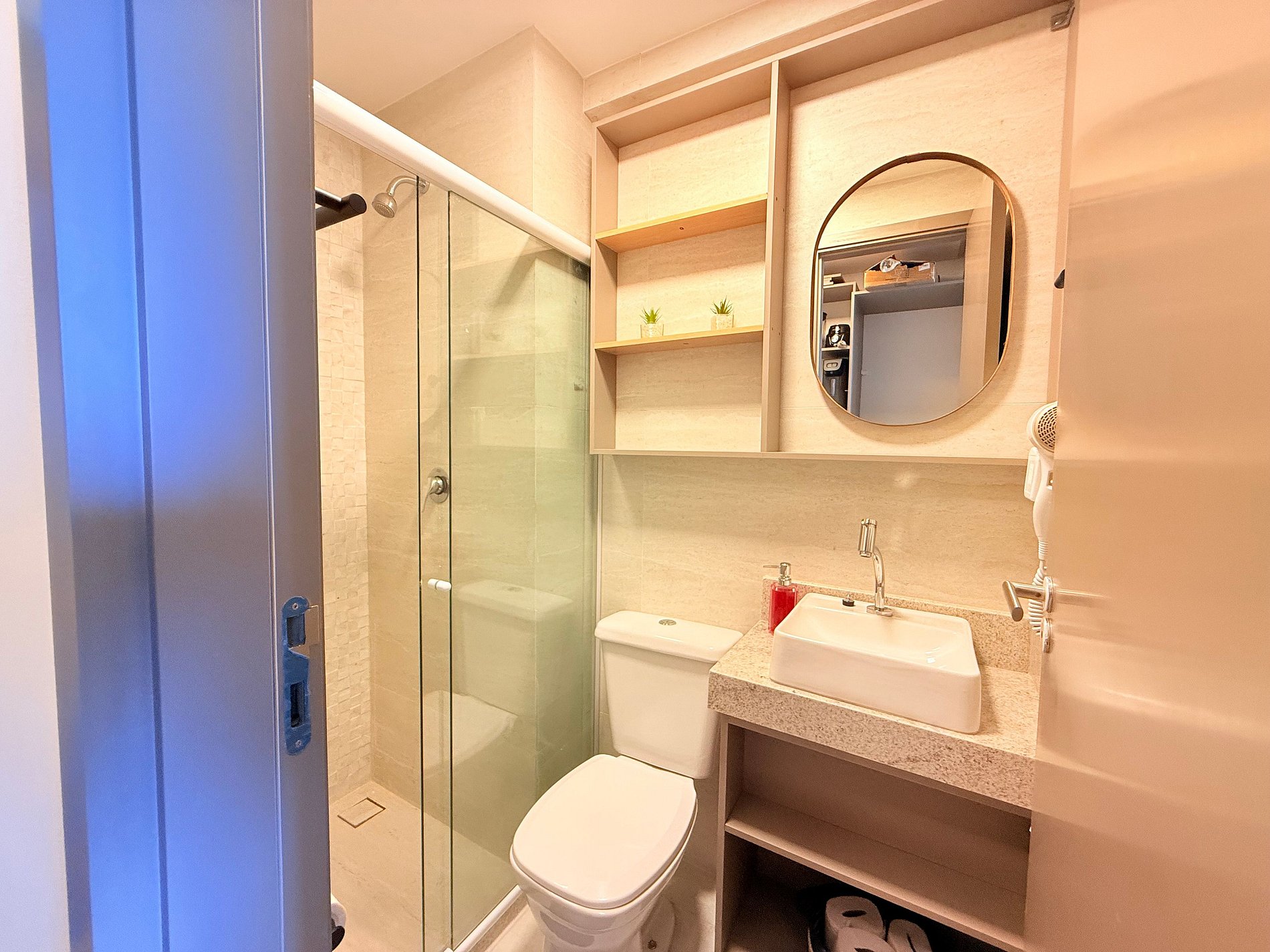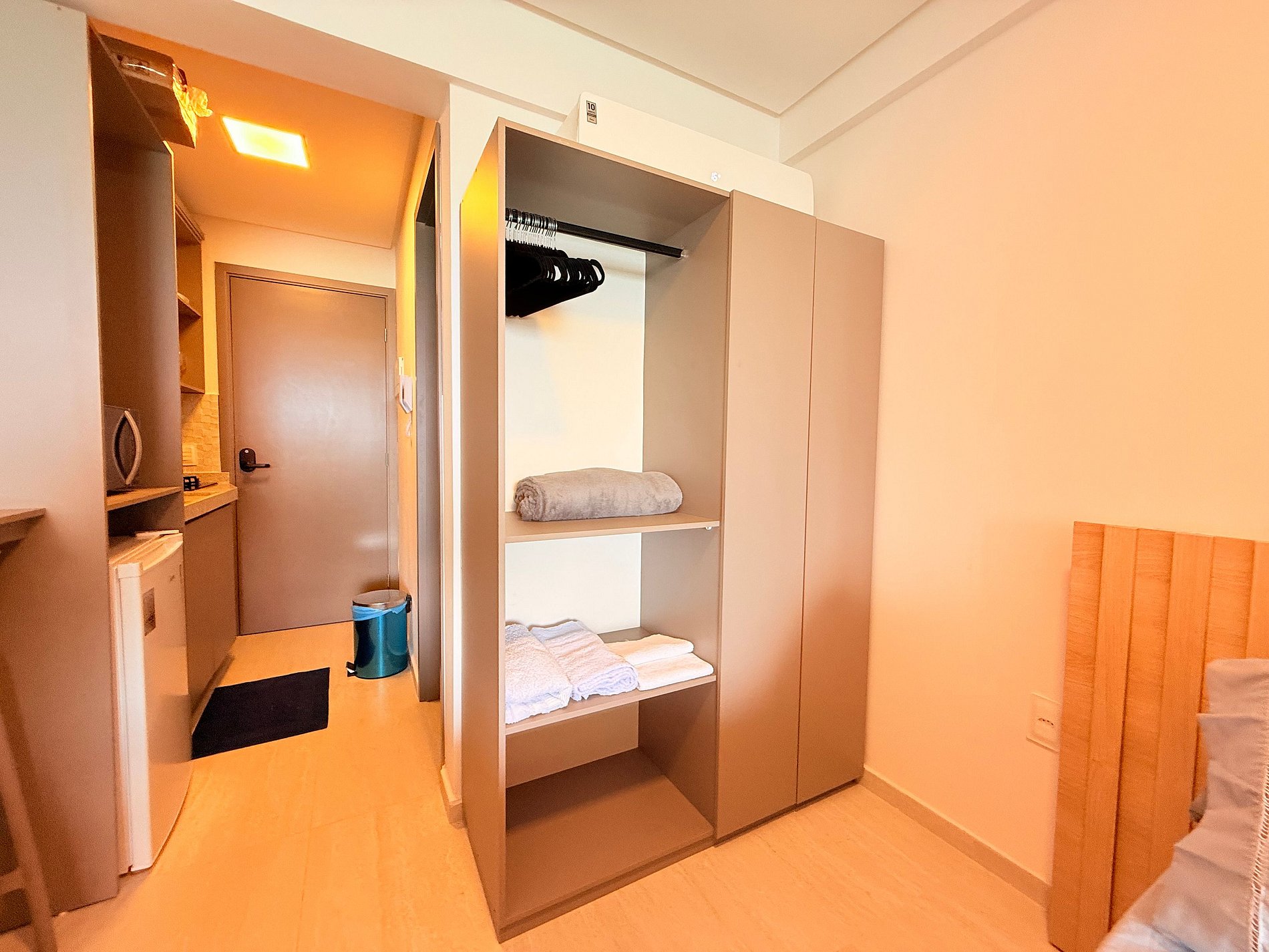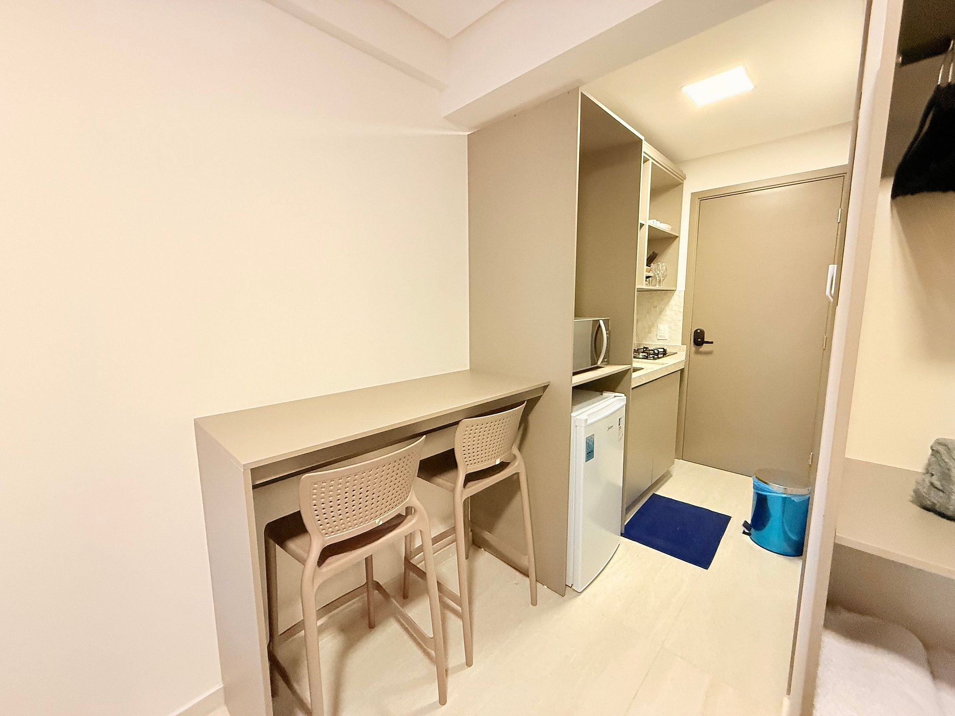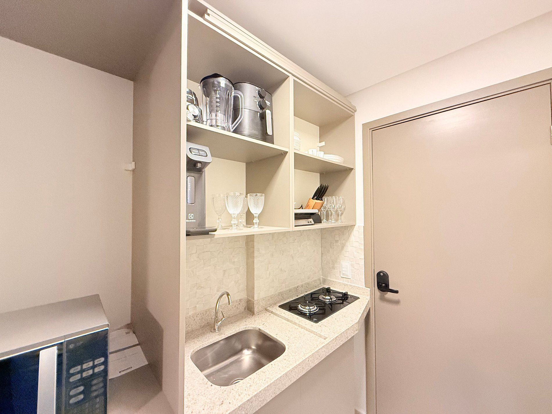 O espaço acomoda confortavelmente até 4 pessoas com 1 cama de casal extremamente confortável e 1 sofá cama, conta com um ambiente novo, moderno e totalmente equipado. A cozinha é completa com liquidificador, airfryer, purificador, sanduicheira, cooktop, micro-ondas, frigobar e todos os utensílios necessários para uma estadia perfeita, oferecendo funcionalidade e conforto tanto para estadias curtas quanto prolongadas.