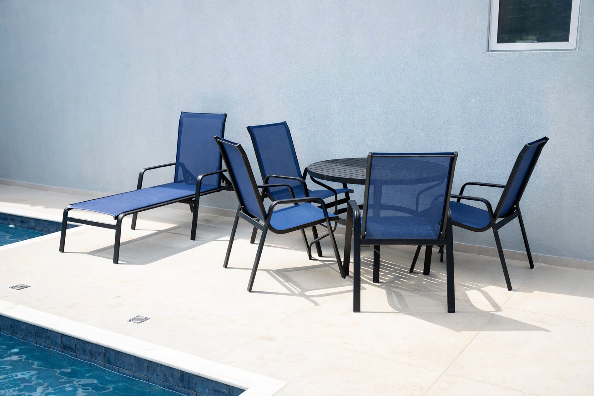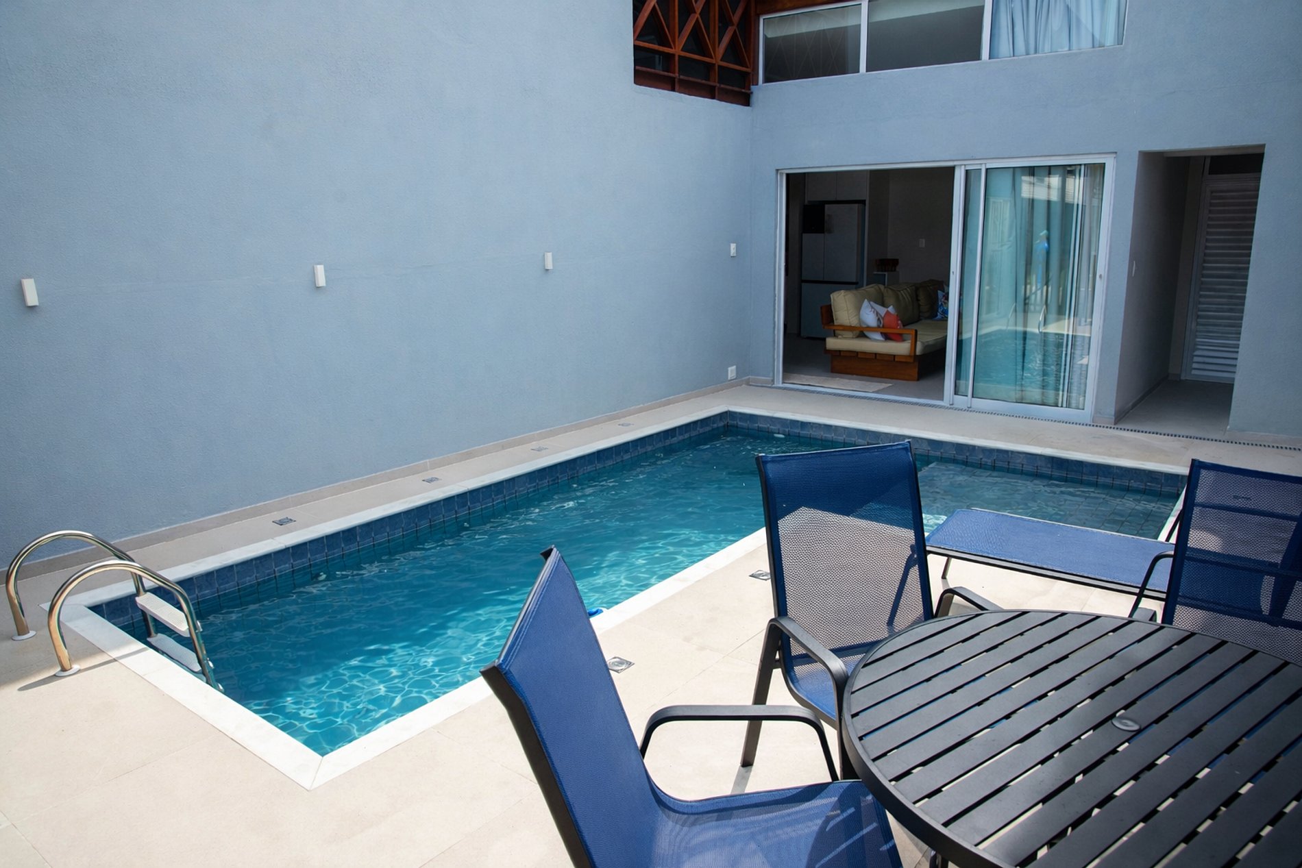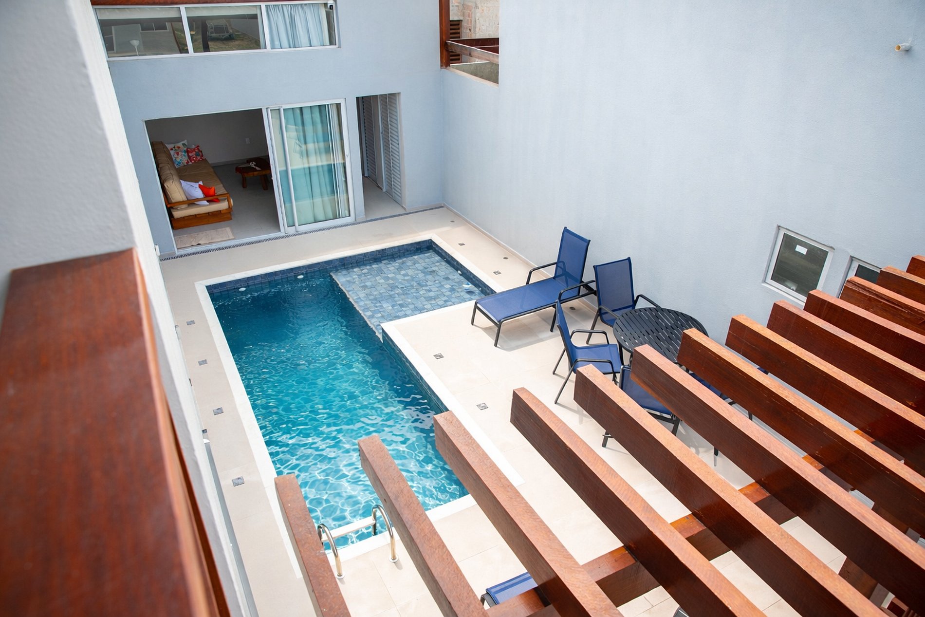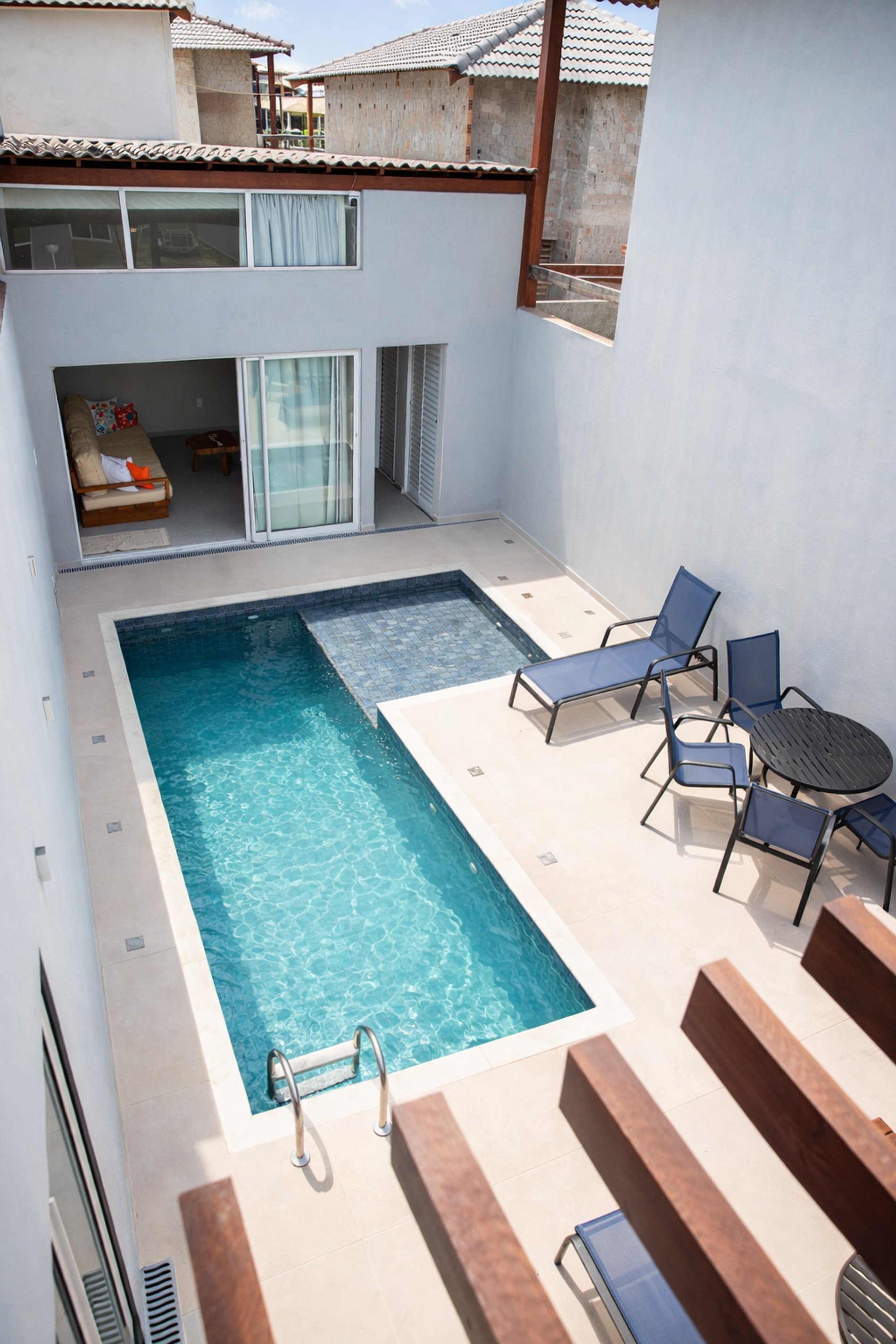 A área de lazer da casa é um verdadeiro convite ao descanso com uma piscina privativa, espreguiçadeiras muito confortáveis e cadeiras e mesas, perfeita para aproveitar o sol, relaxar e curtir momentos únicos com total privacidade.