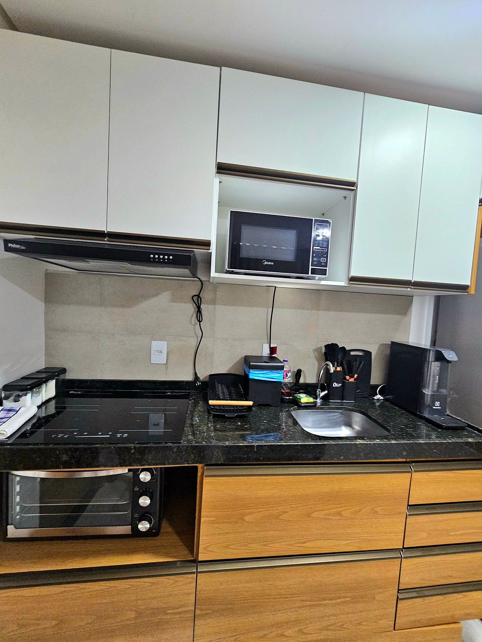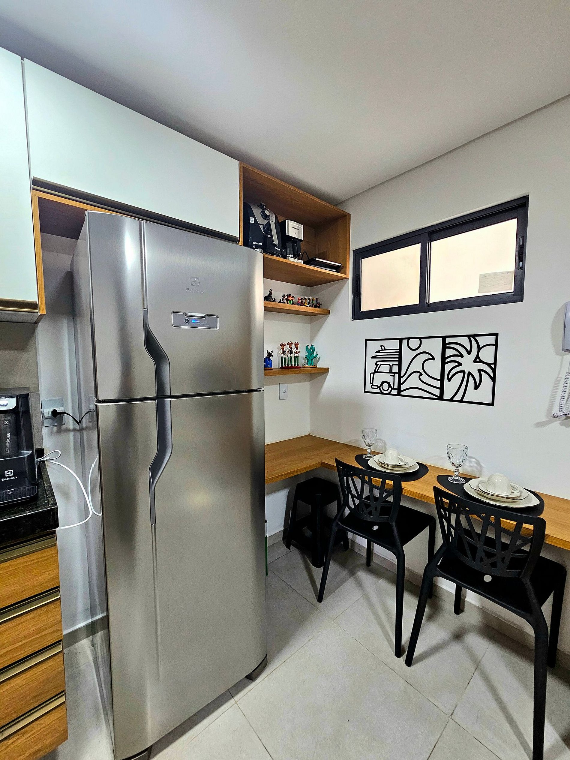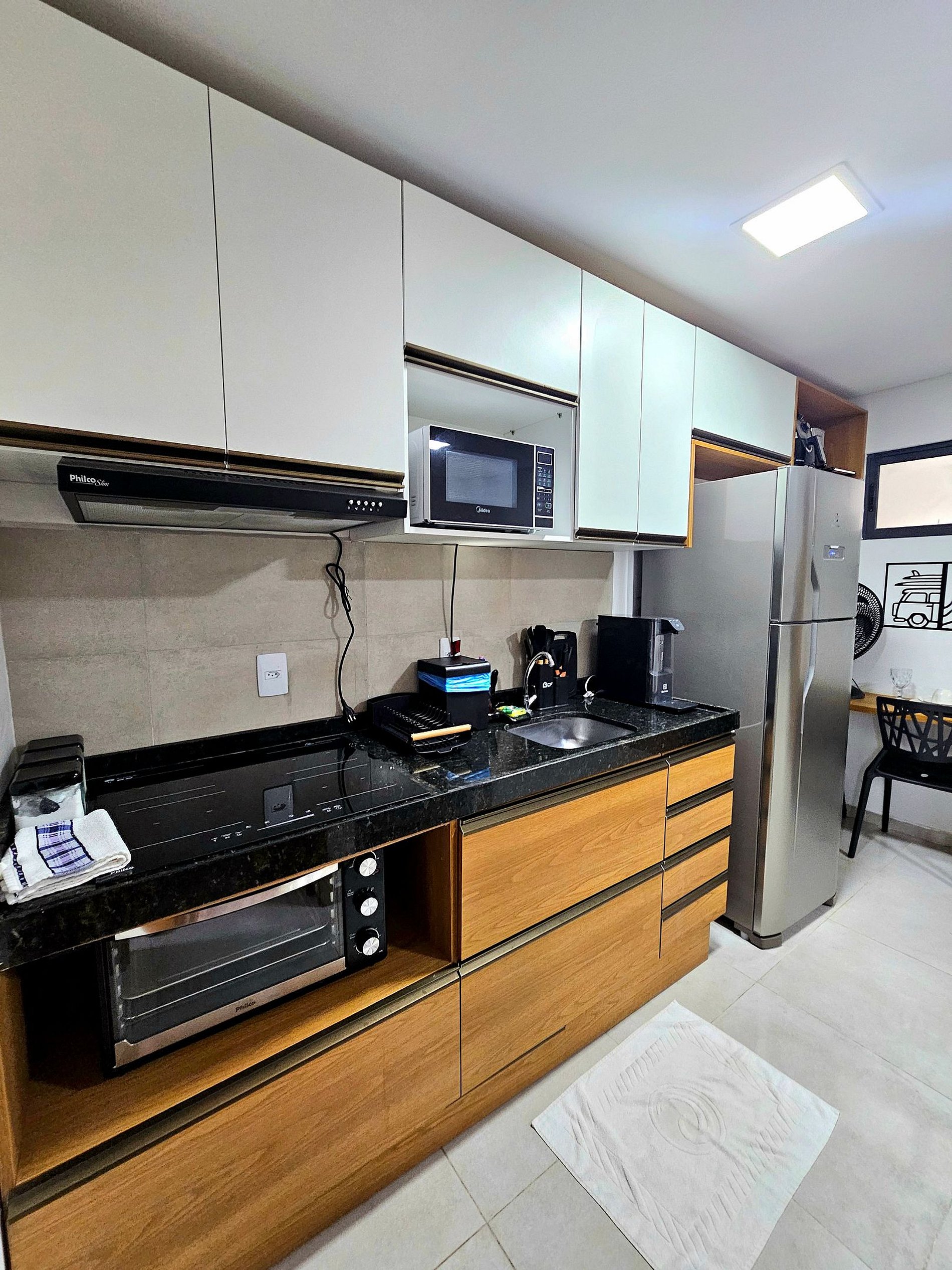 A cozinha é totalmente equipada com eletrodomésticos de alta qualidade, incluindo geladeira, micro-ondas, airfryer, sanduicheira, liquidificador, cafeteira, Forninho, Filtro de água e todos os utensílios (panelas, copos, taças, pratos e talheres) para realizar sua refeição.