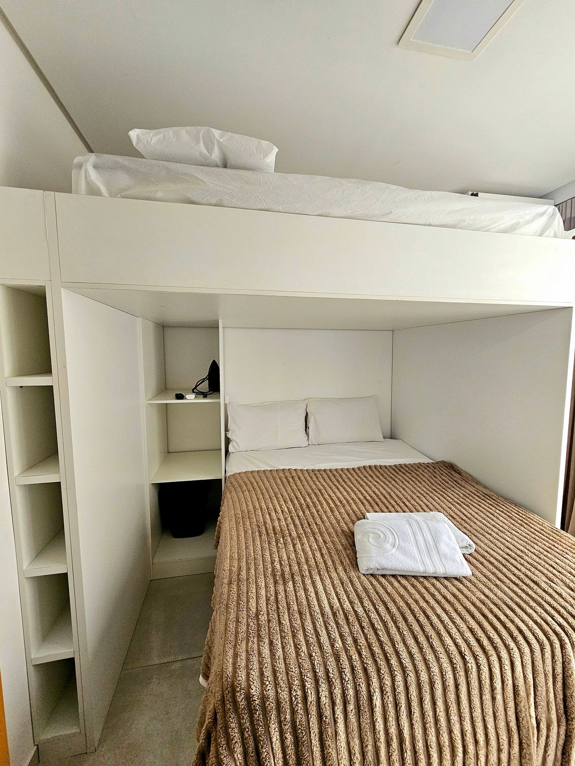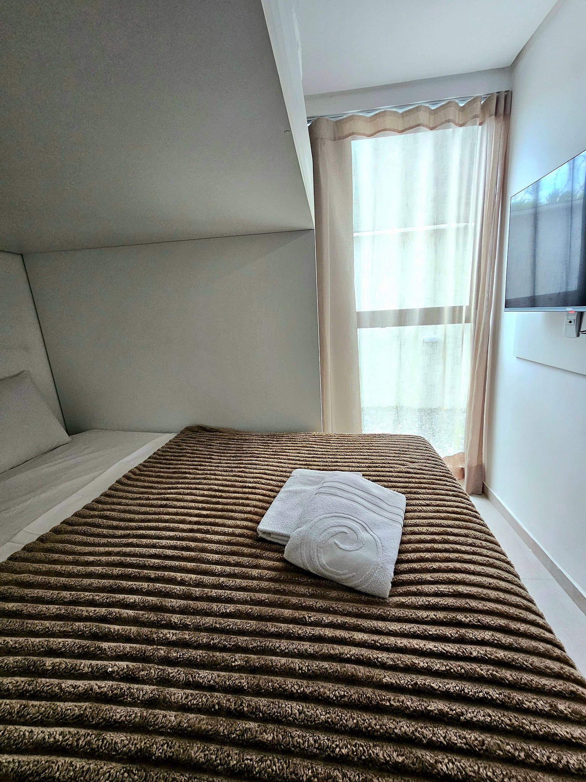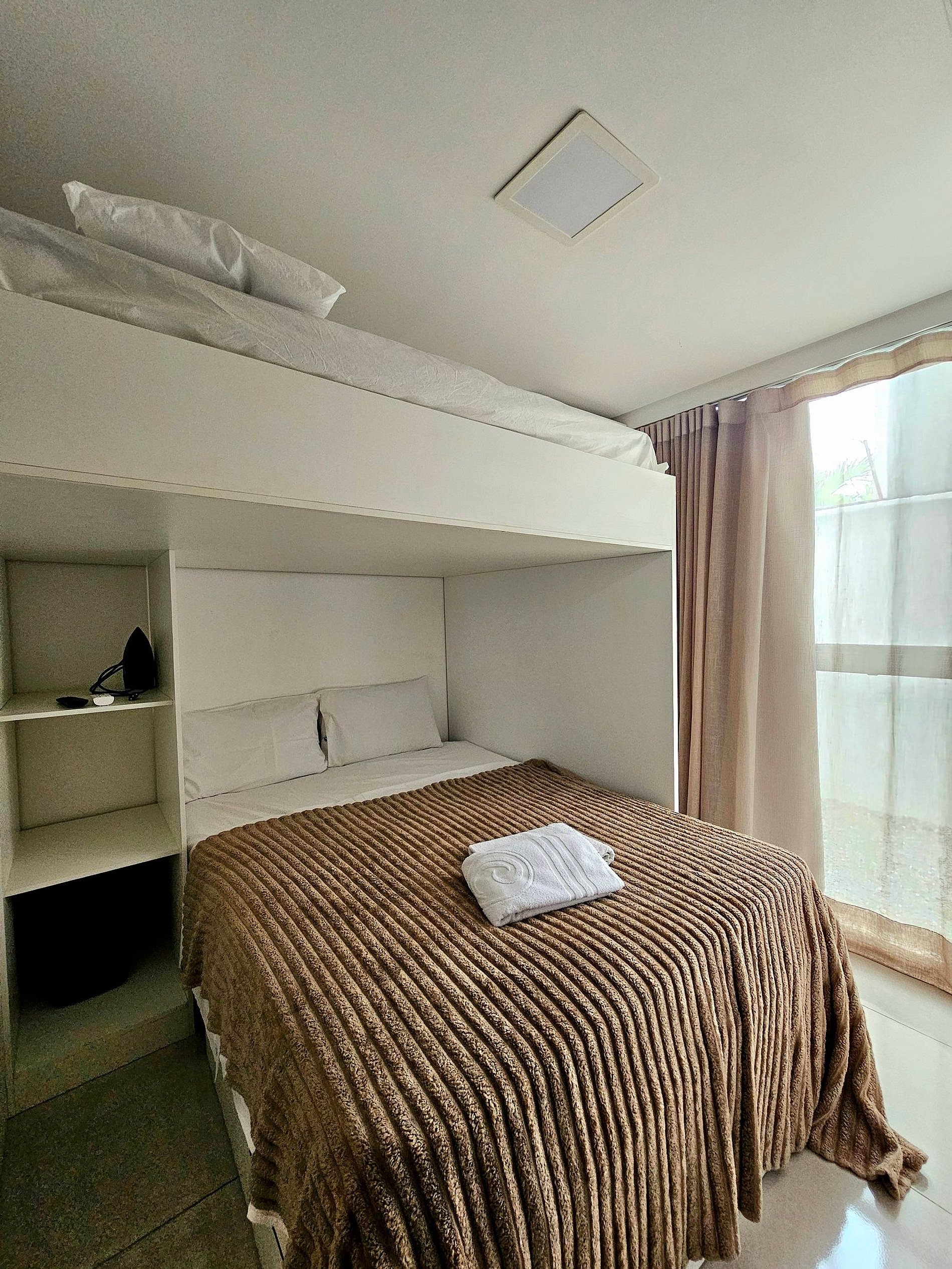 Acomoda bem até 3 hóspedes com uma cama de casal de excelente qualidade e uma cama de solteiro (Beliche) em cima da cama de casal (apenas o quarto é climatizado)
