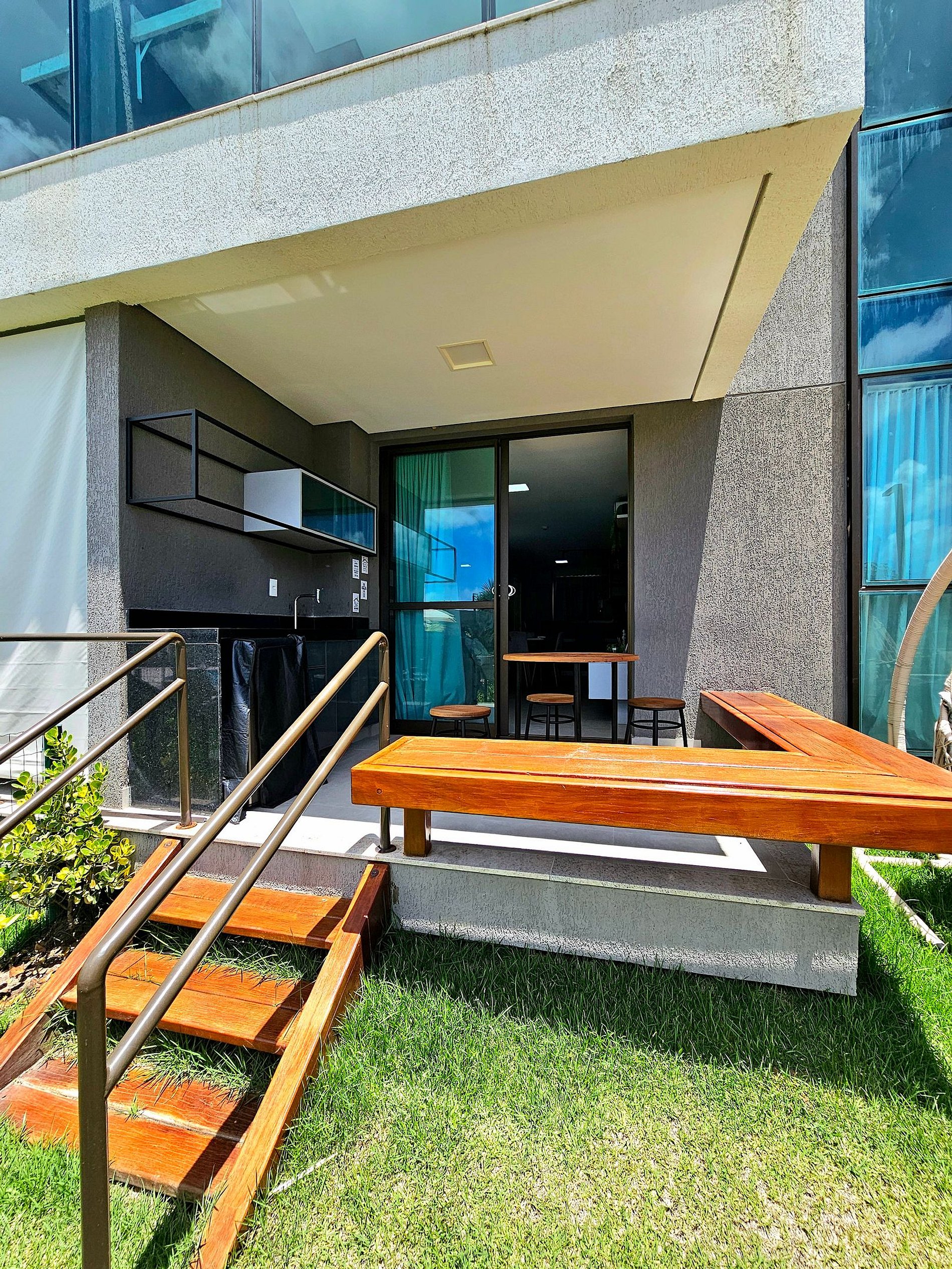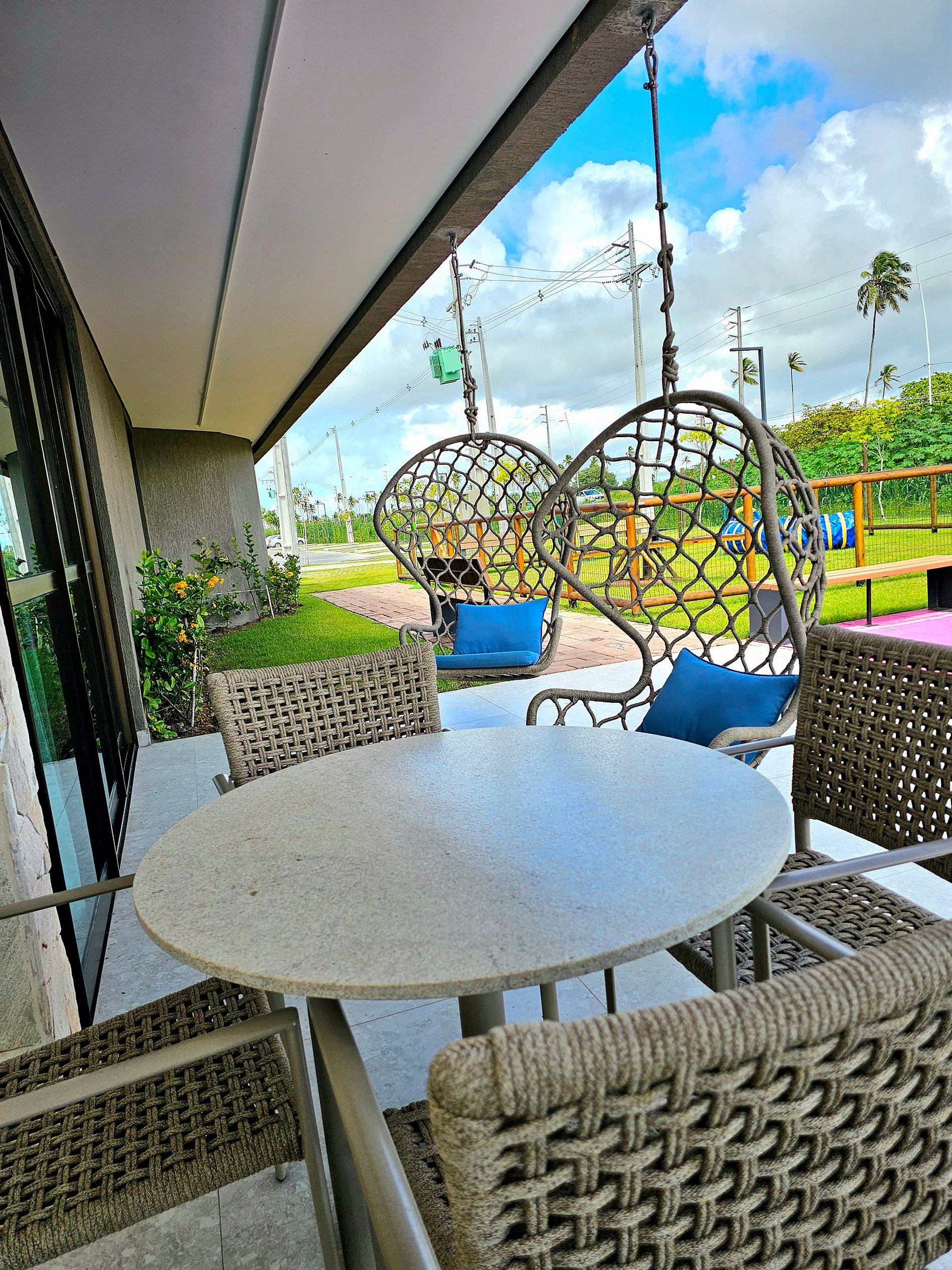 A Cereja do Bolo é nossa varanda gourmet com uma ótima mesa, confortável e moderna para refeições e vista para o complexo aquático do empreendimento.