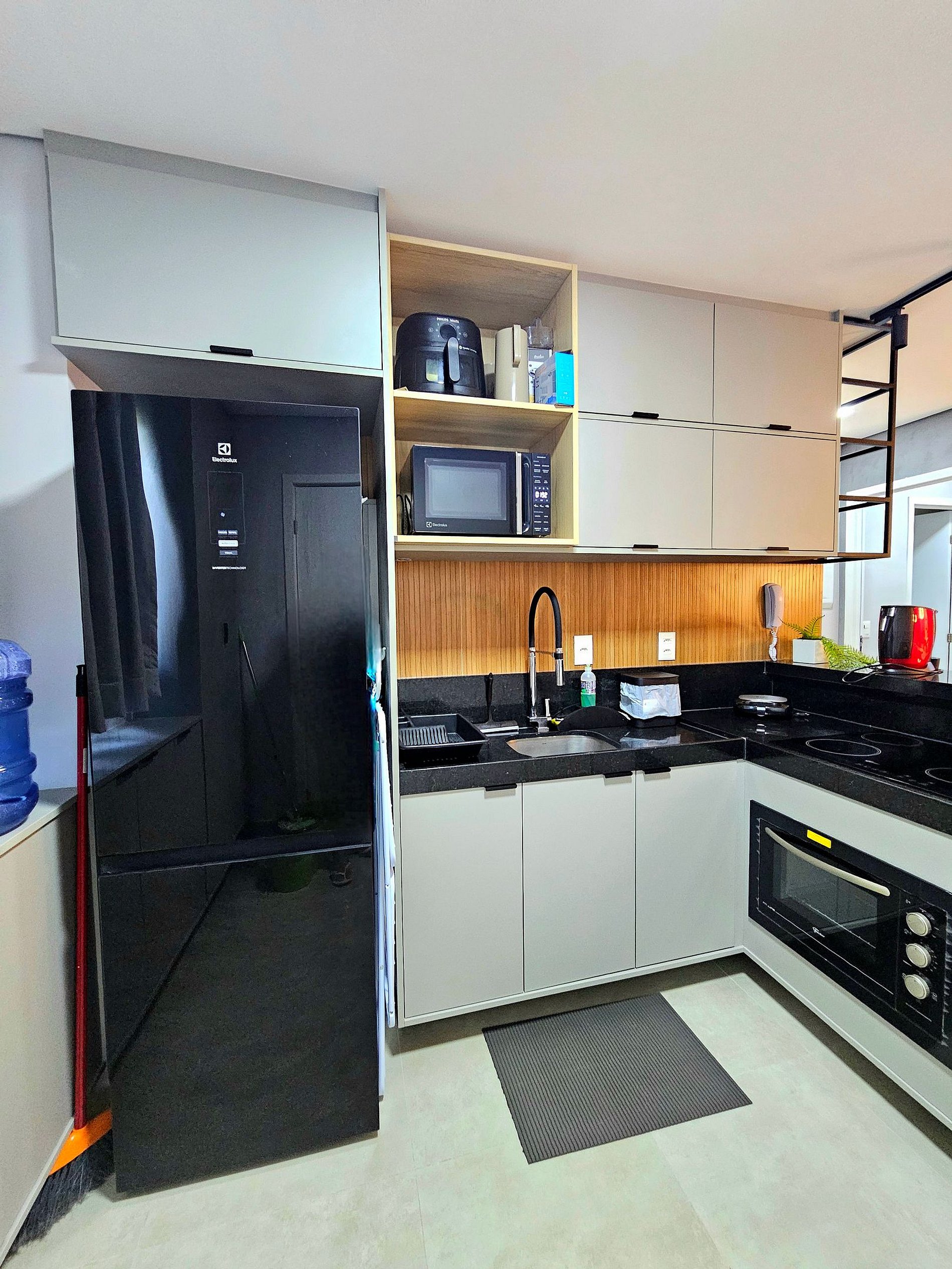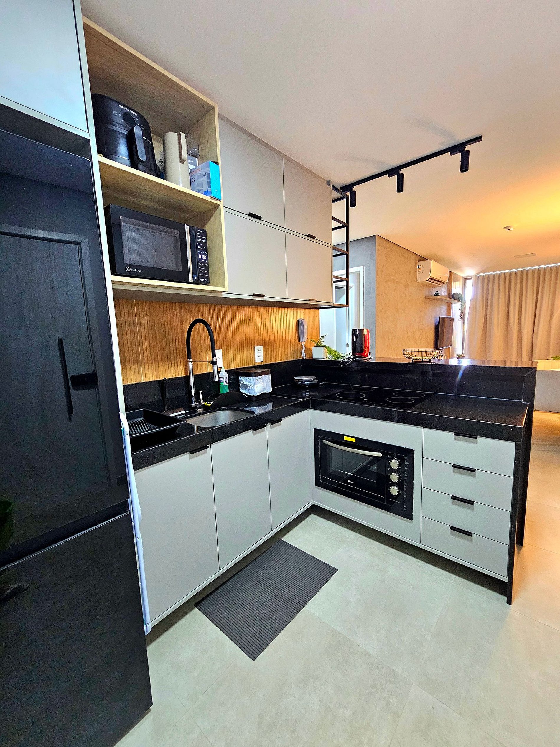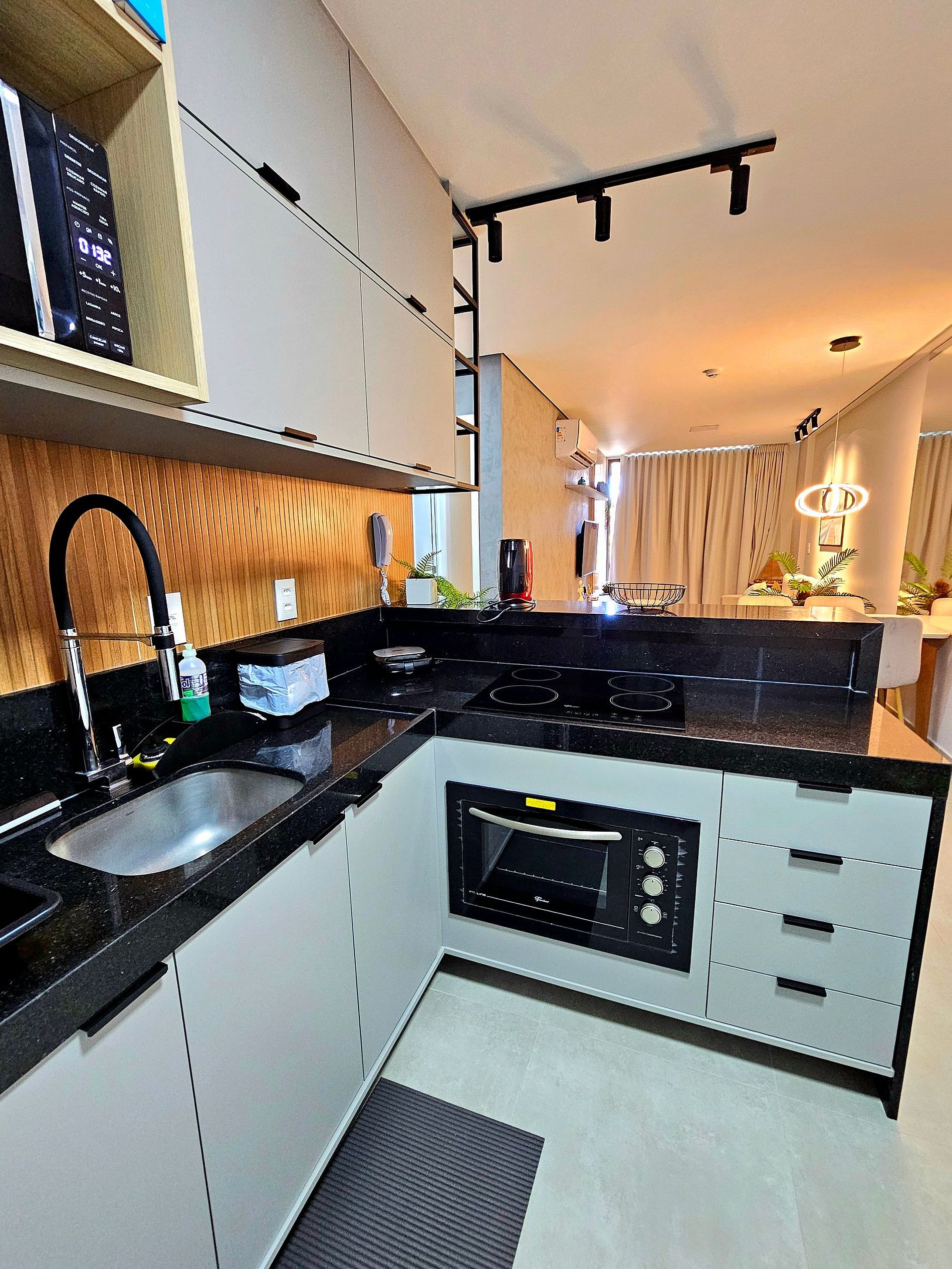 A cozinha completa é equipada com os principais eletrodomésticos, como geladeira duplex, microondas, cooktop, cafeteira, liquidificador, sanduicheira e airfryer, além de todos os utensílios necessários para que você possa preparar suas refeições de maneira prática e confortável.