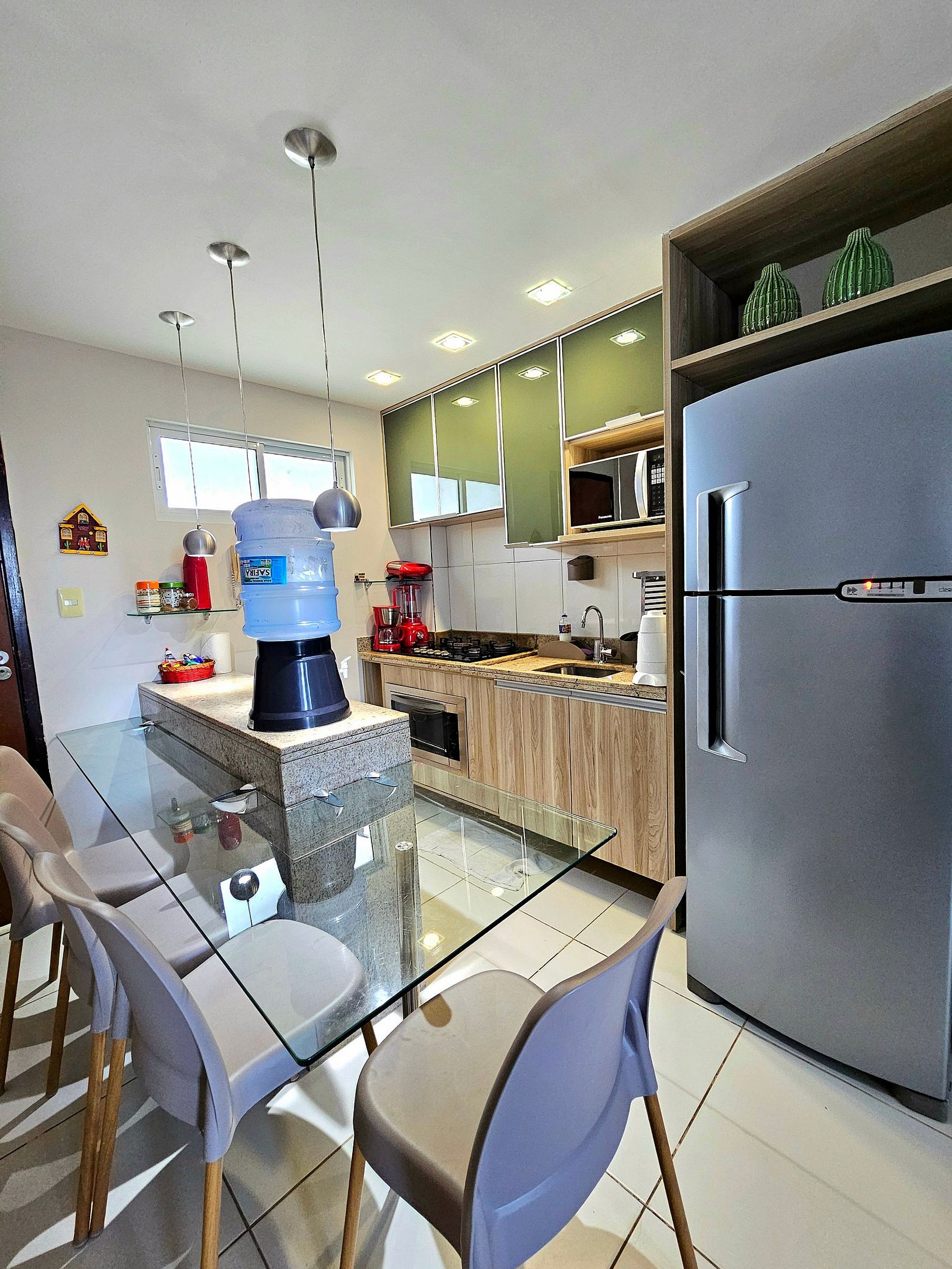 Nossa cozinha completa é equipada com os principais eletrodomésticos, como geladeira, microondas, cooktop, forno, cafeteira, liquidificador, sanduicheira e airfryer, além de todos os utensílios necessários para que você possa preparar suas refeições de maneira prática e confortável.