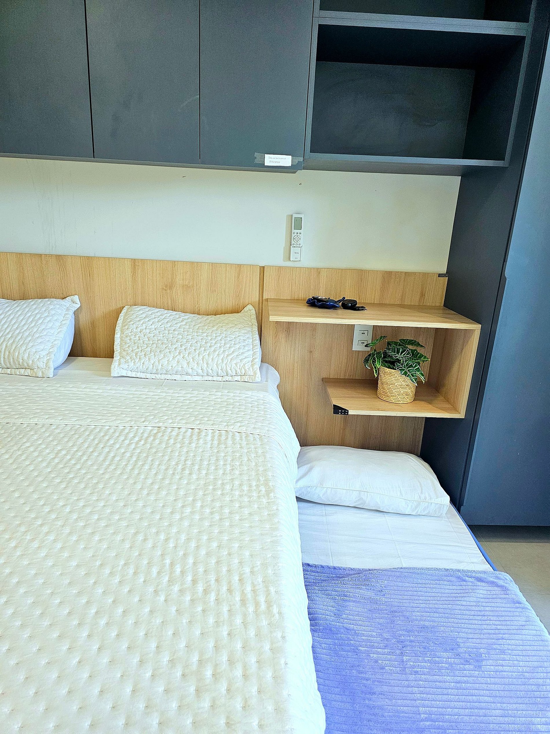 Studio com 1 cama de casal e 2 camas de solteiro embaixo, a cozinha possui os principais eletrodomésticos (cooktop 2 bocas, microondas, cafeteira, saduicheira, Frigobar, conjunto de panelas, refratários, etc..) possuímos a incrível varanda com mesa e 4 cadeiras e a exclusiva piscina privativa ( não é aquecida ), a maior da região que é perfeita para um fim de tarde!