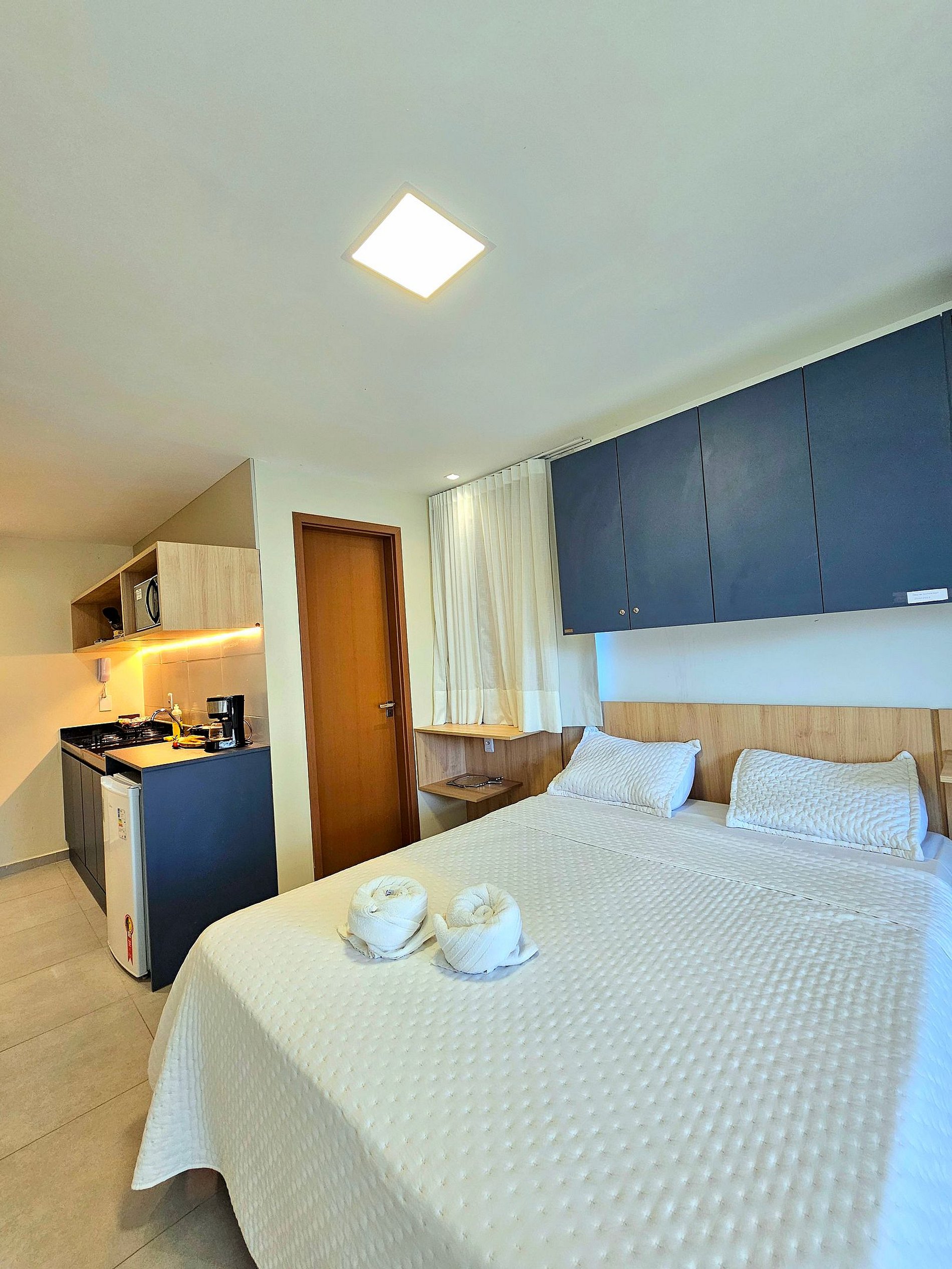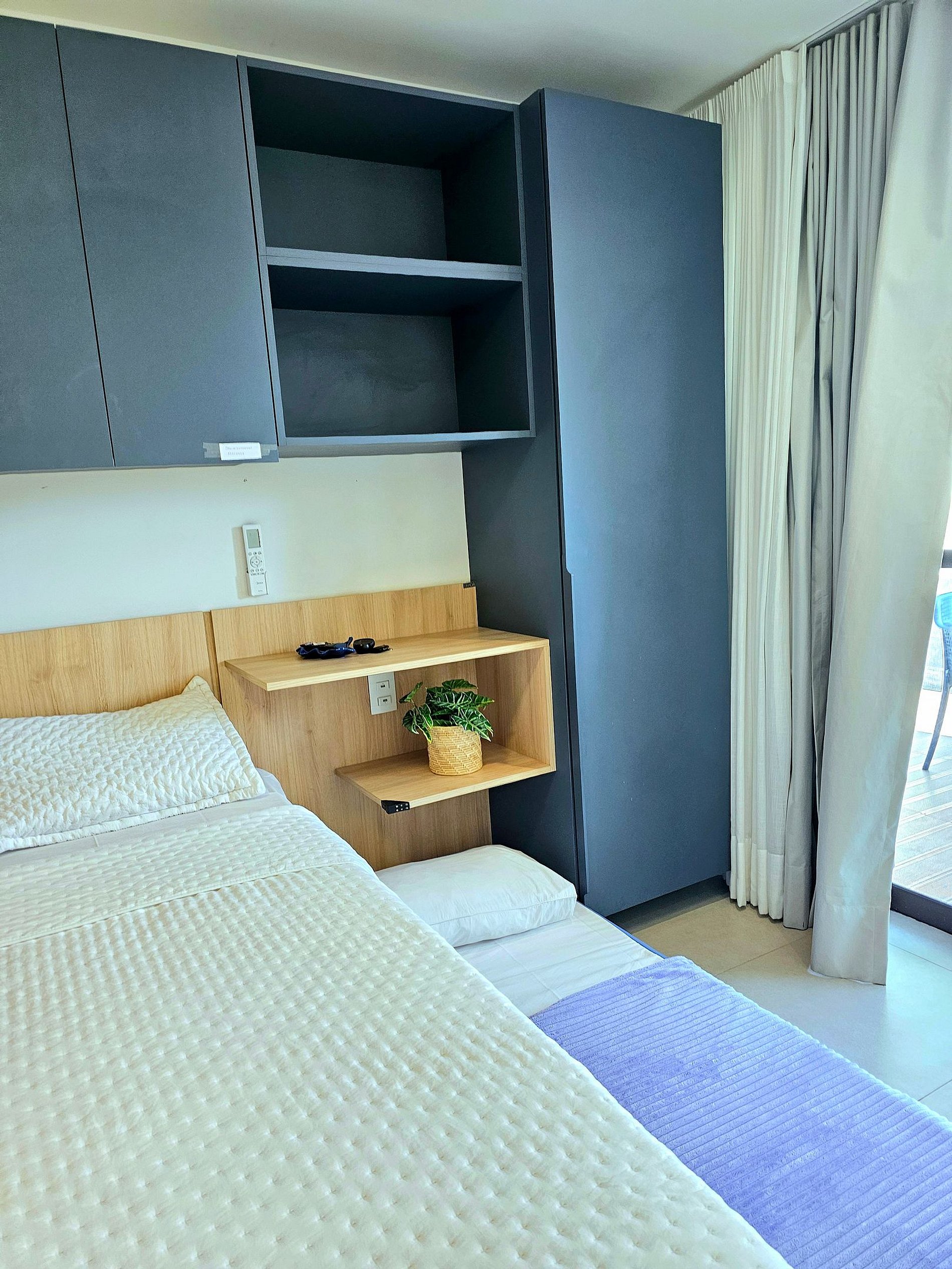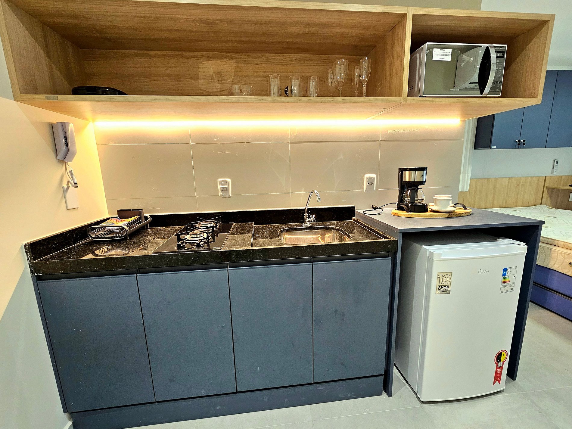 Studio com 1 cama de casal e 2 camas de solteiro embaixo, a cozinha possui os principais eletrodomésticos (cooktop 2 bocas, microondas, cafeteira, saduicheira, Frigobar, conjunto de panelas, refratários, etc..) possuímos a incrível varanda com mesa e 4 cadeiras e a exclusiva piscina privativa ( não é aquecida ), a maior da região que é perfeita para um fim de tarde!