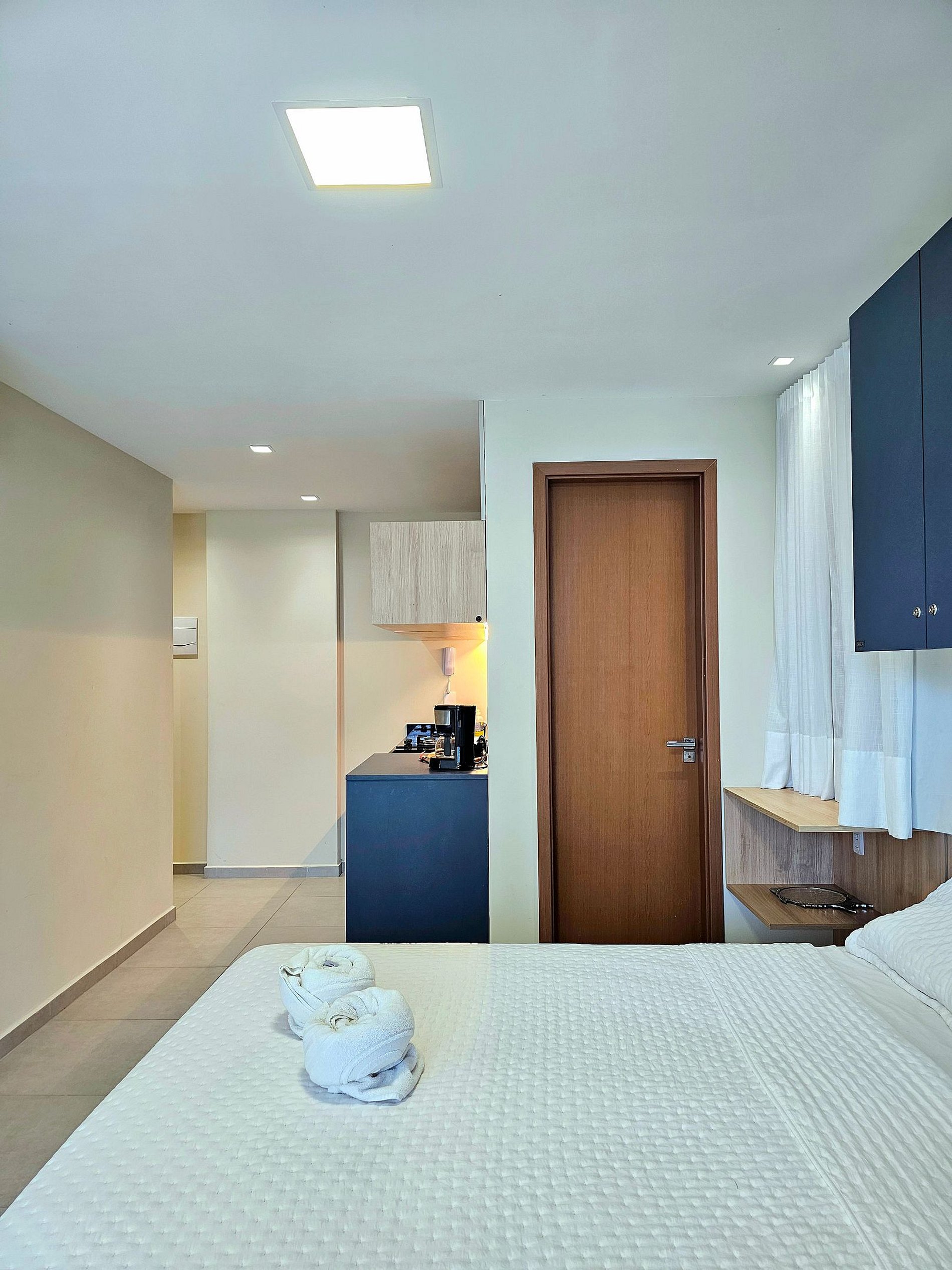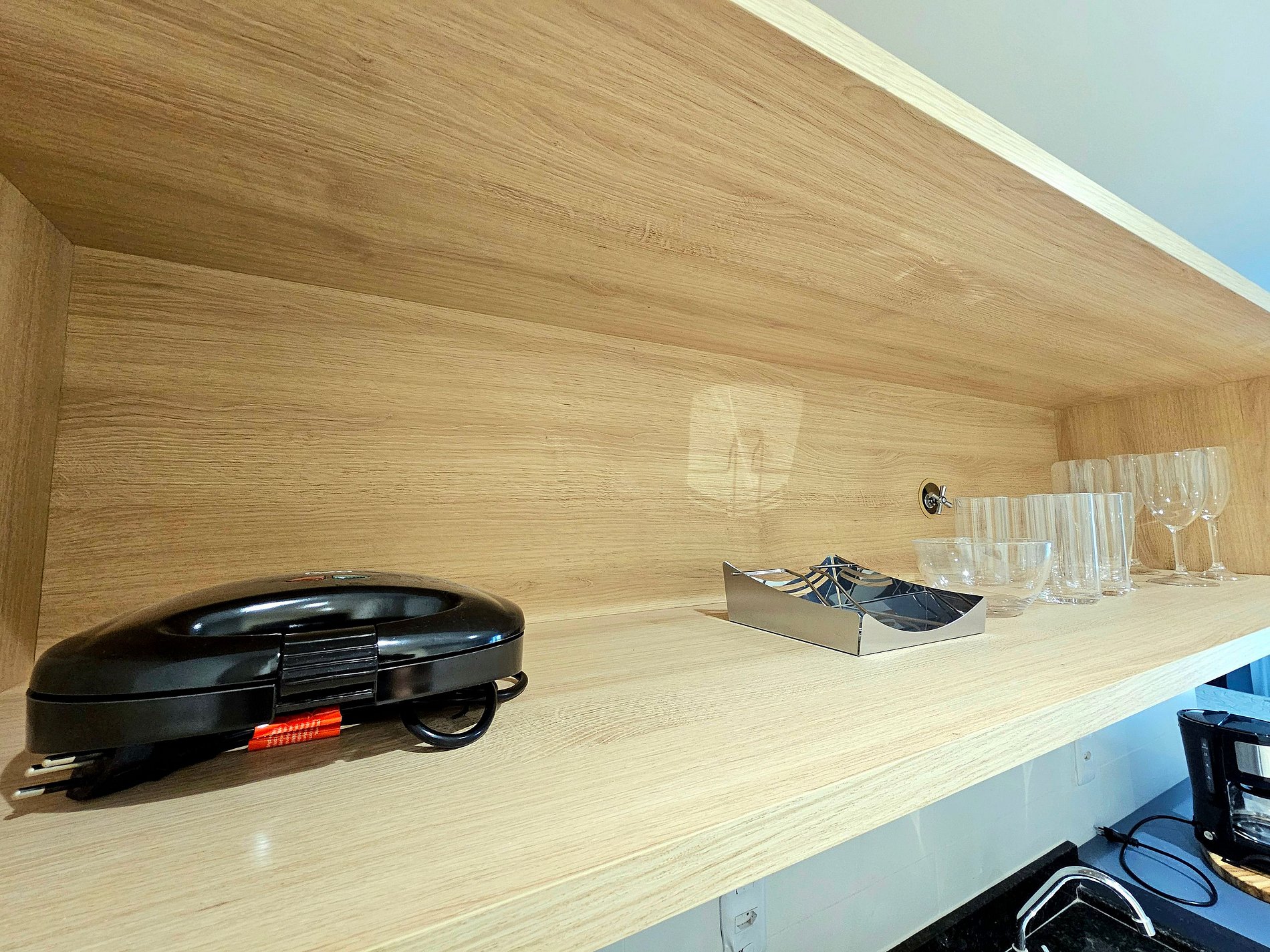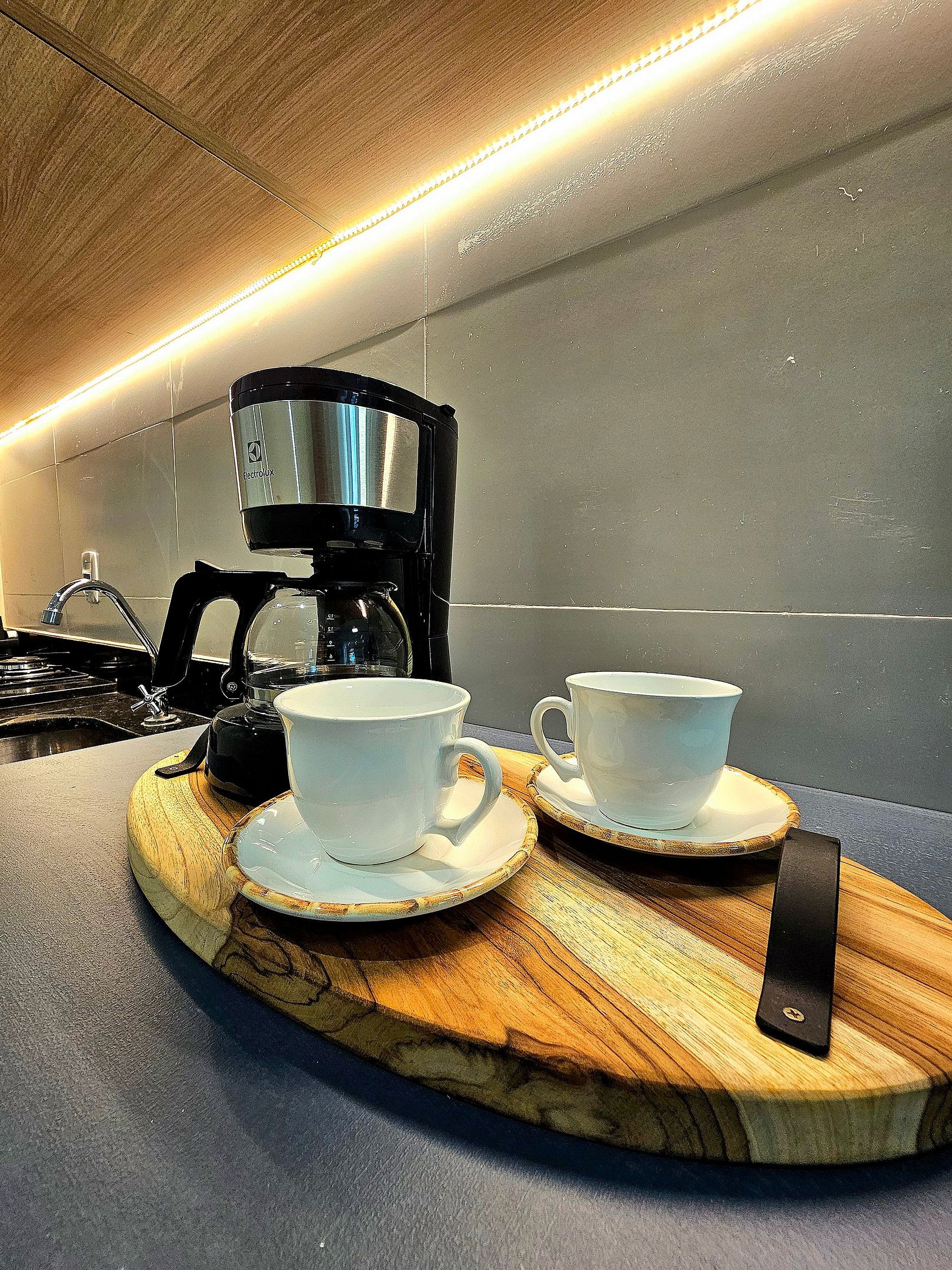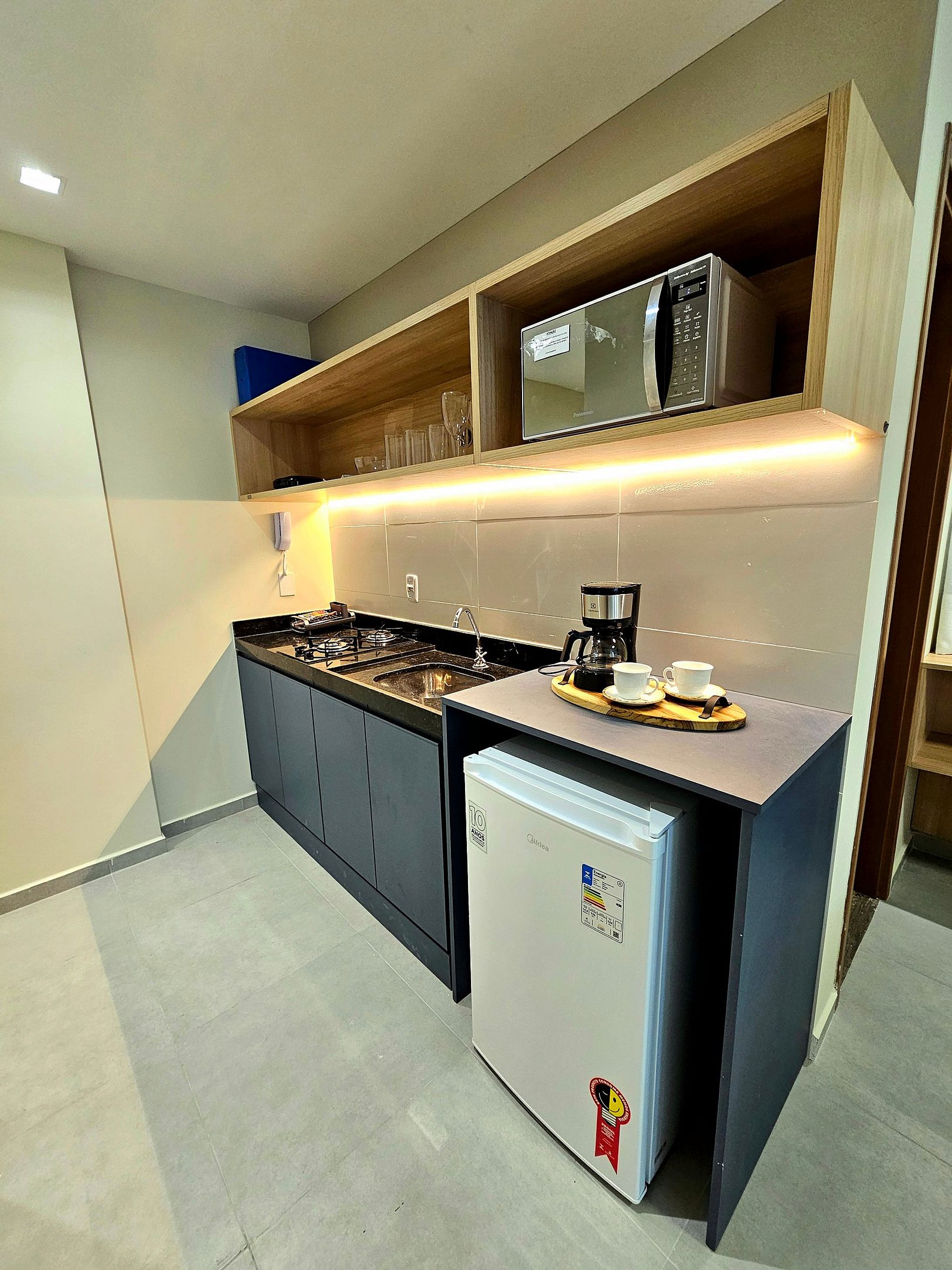 Studio com 1 cama de casal e 2 camas de solteiro embaixo, a cozinha possui os principais eletrodomésticos (cooktop 2 bocas, microondas, cafeteira, saduicheira, Frigobar, conjunto de panelas, refratários, etc..) possuímos a incrível varanda com mesa e 4 cadeiras e a exclusiva piscina privativa ( não é aquecida ), a maior da região que é perfeita para um fim de tarde!