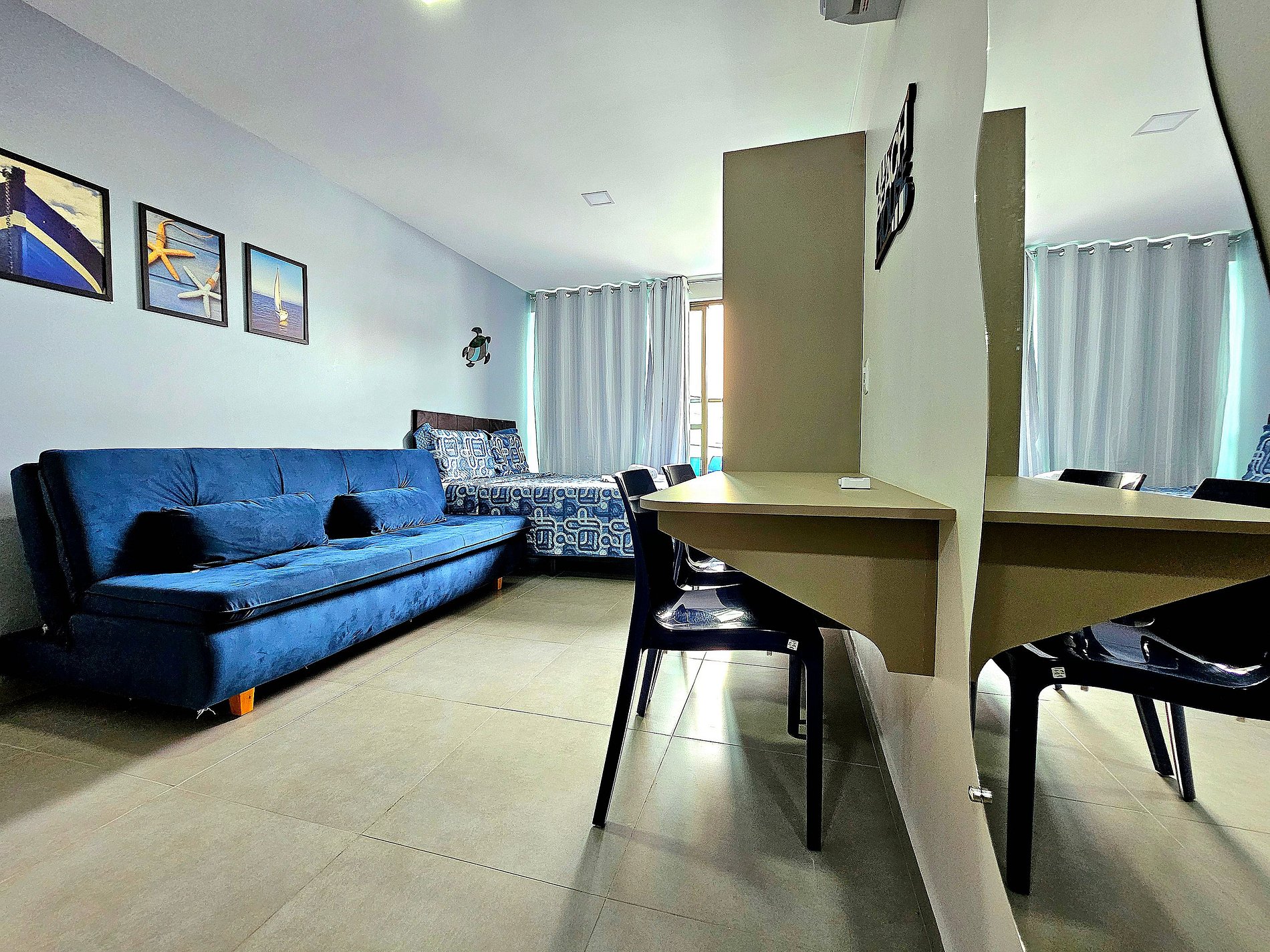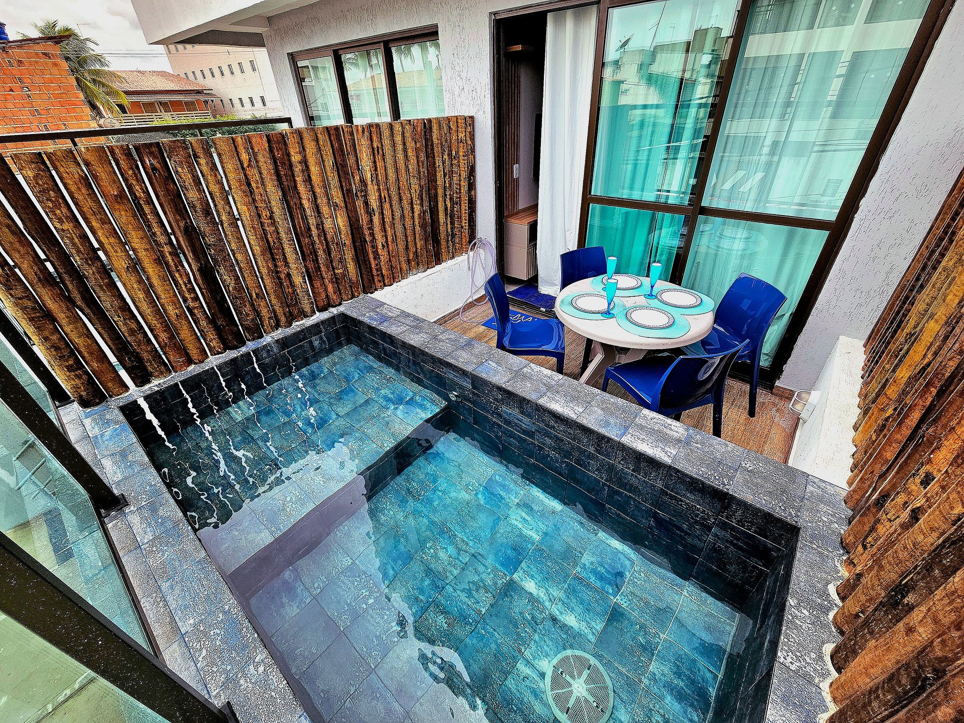 Studio com 1 cama de casal e 1 sofá cama, a cozinha possui os principais eletrodomésticos (cooktop 2 bocas, airfryer, microondas, cafeteira, saduicheira, liquidificador, geladeira com freezer, conjunto de panelas, travessas para servir, etc..) possuímos a incrível varanda com mesa e 4 cadeiras e a exclusiva piscina privativa ( não é aquecida ) que é perfeita para um fim de tarde!