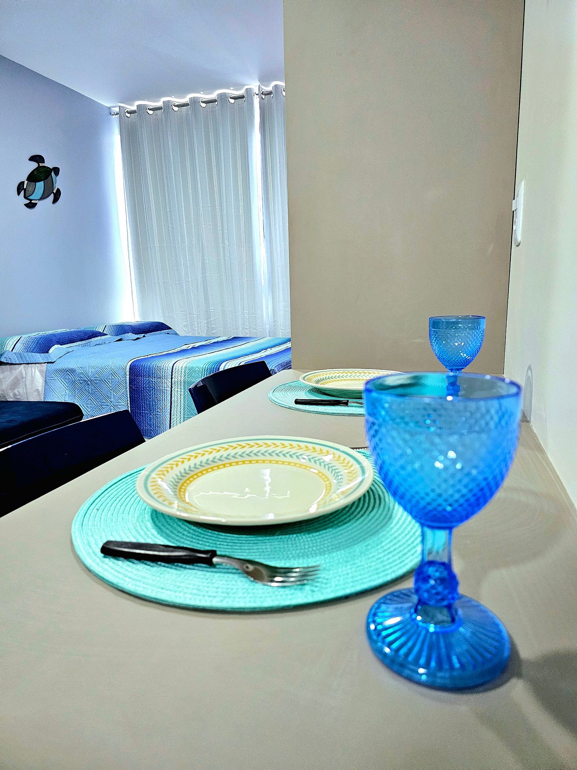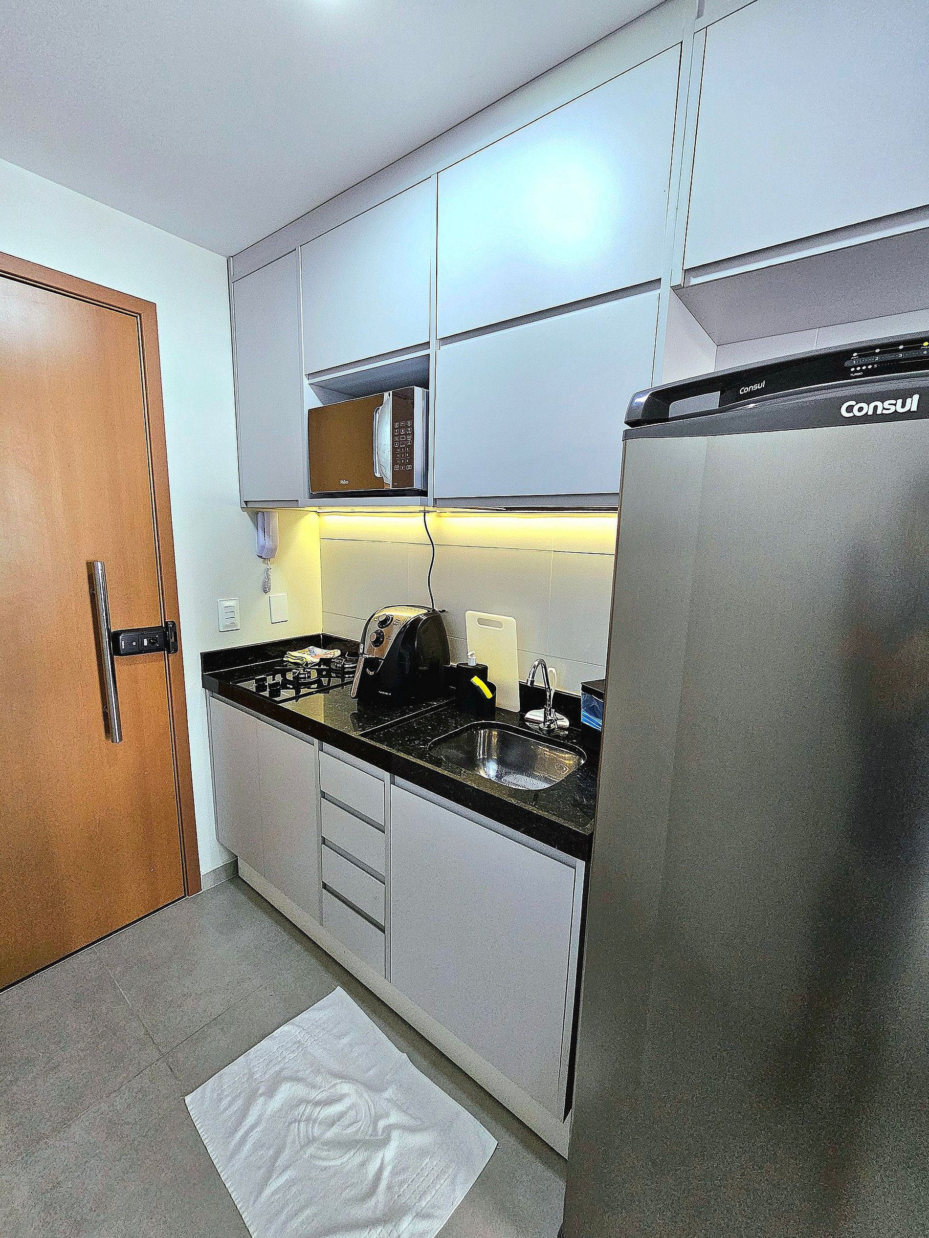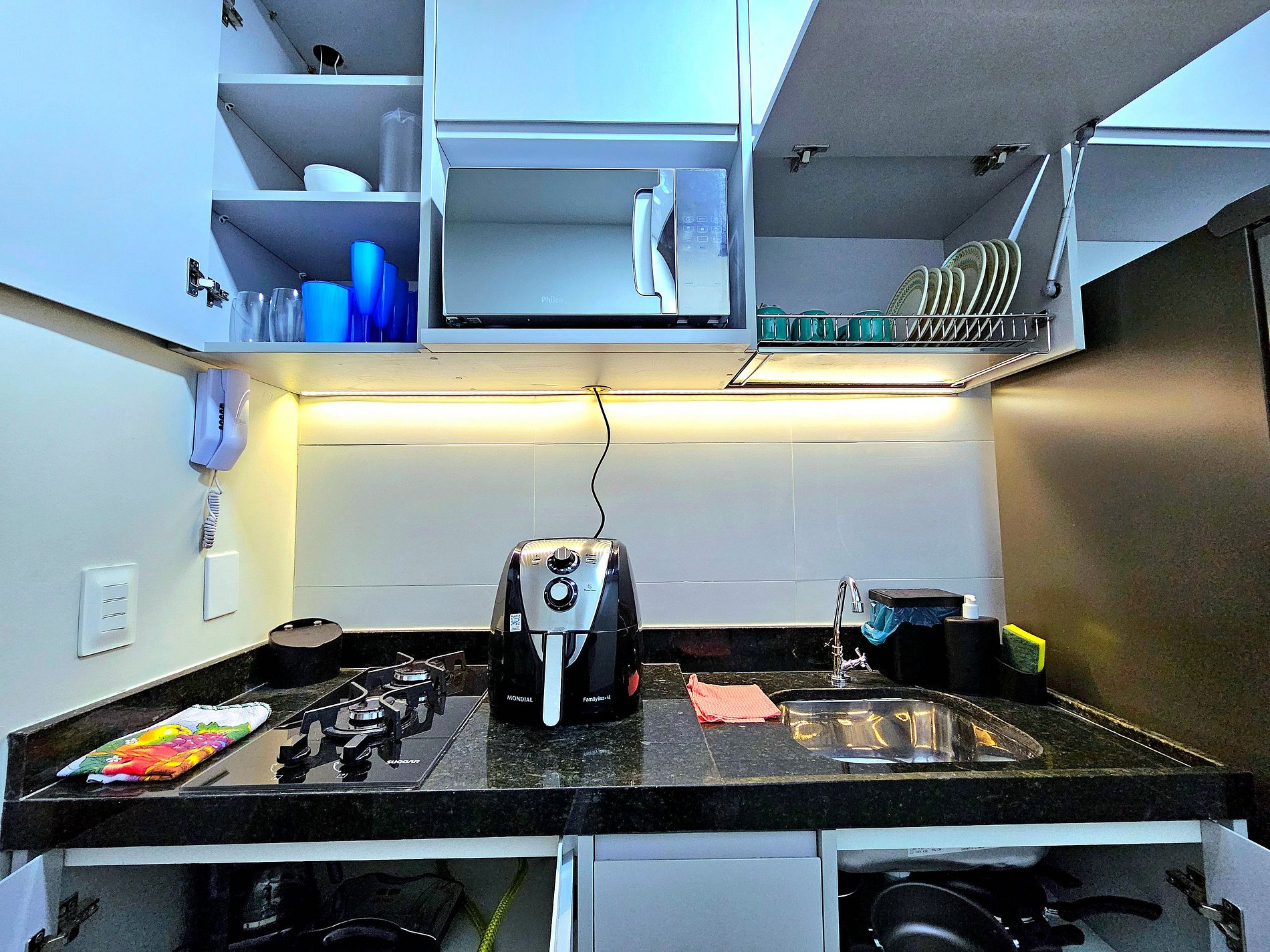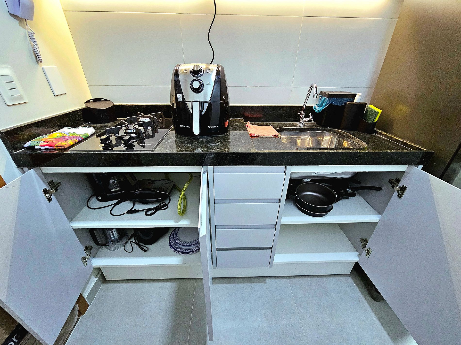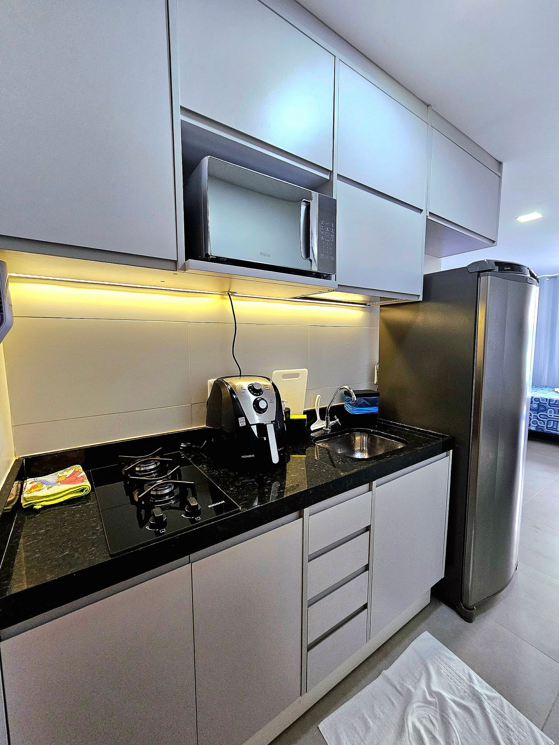 Studio com 1 cama de casal e 1 sofá cama, a cozinha possui os principais eletrodomésticos (cooktop 2 bocas, airfryer, microondas, cafeteira, saduicheira, liquidificador, geladeira com freezer, conjunto de panelas, travessas para servir, etc..) possuímos a incrível varanda com mesa e 4 cadeiras e a exclusiva piscina privativa ( não é aquecida ) que é perfeita para um fim de tarde!