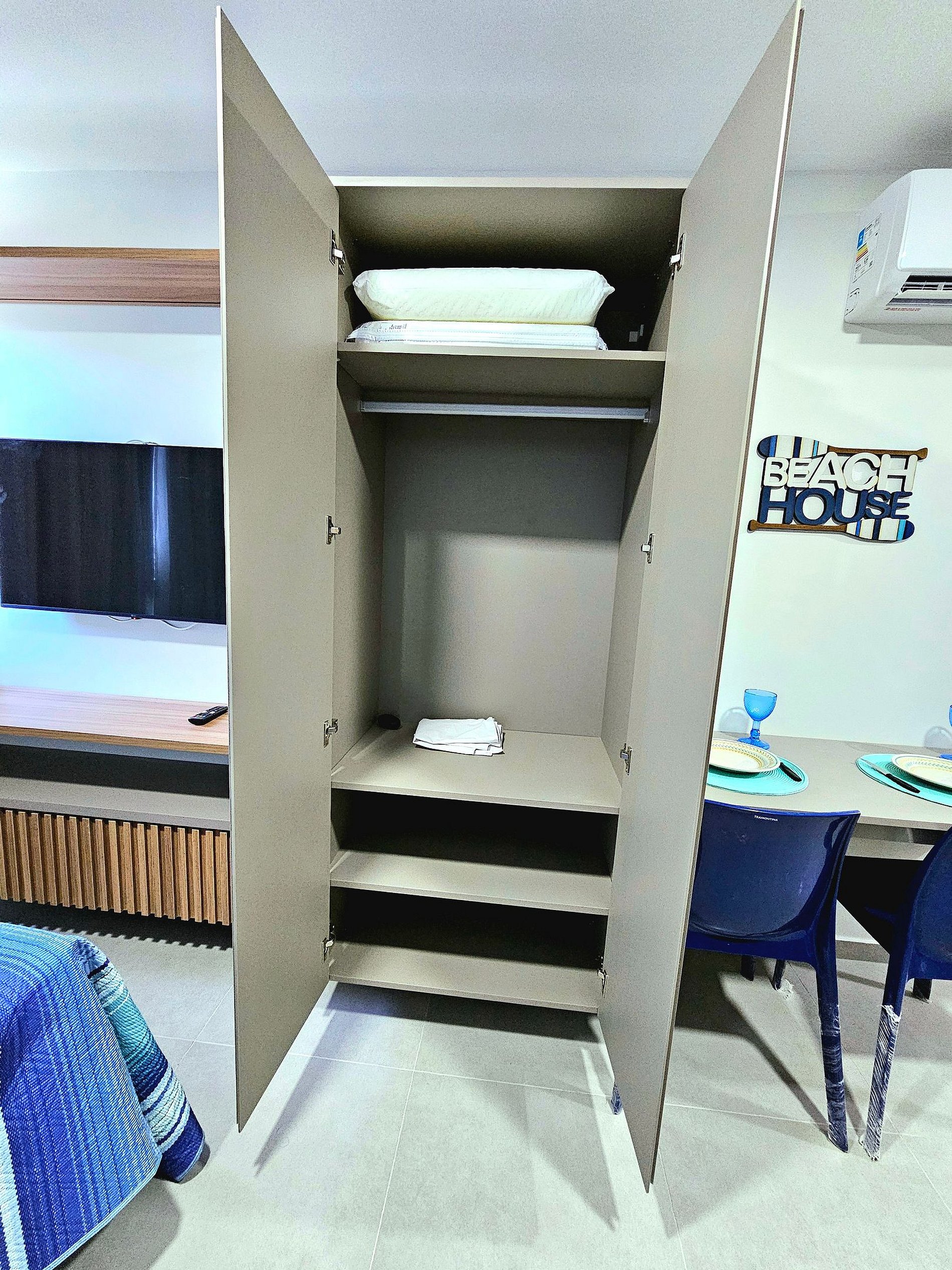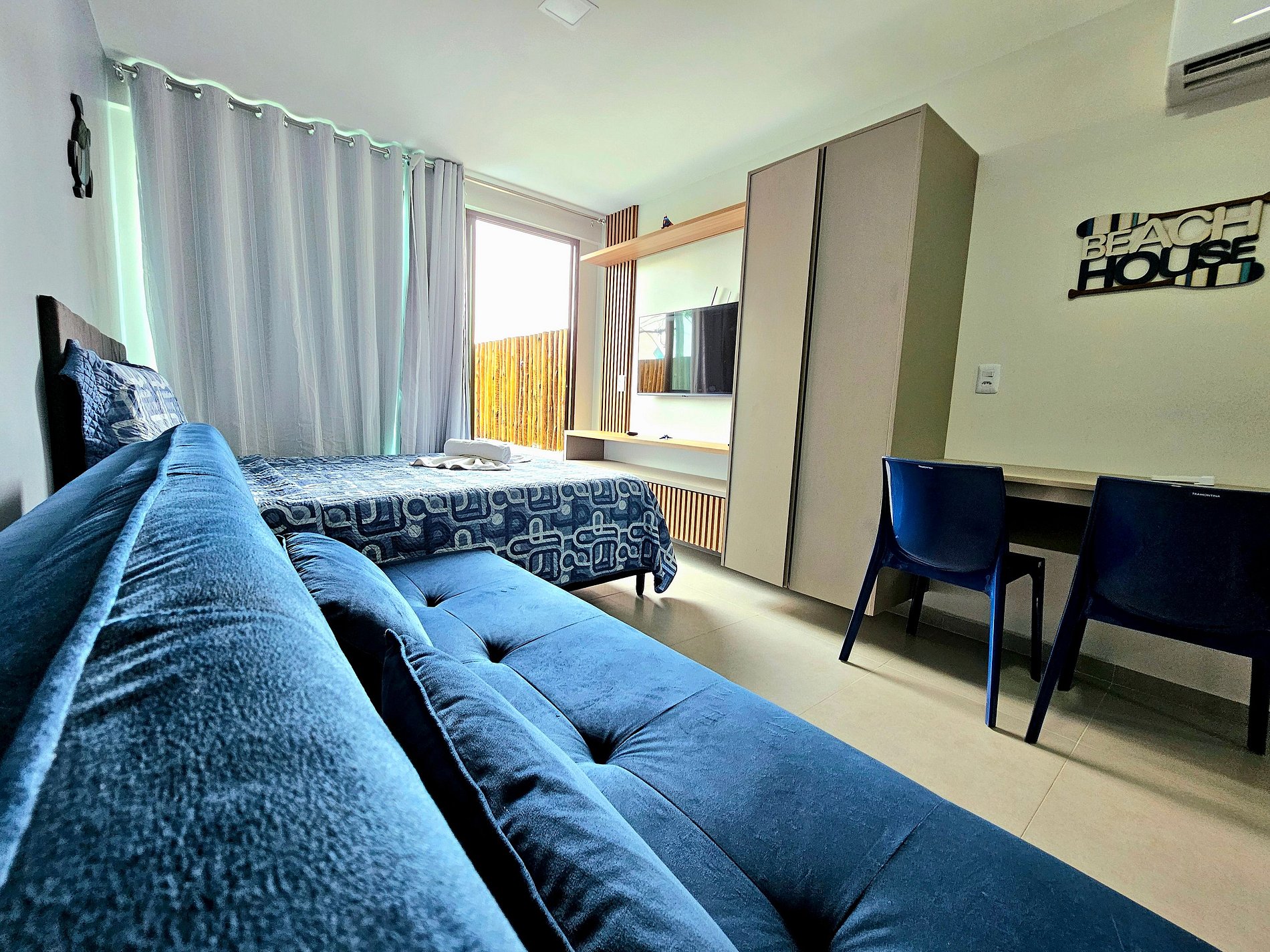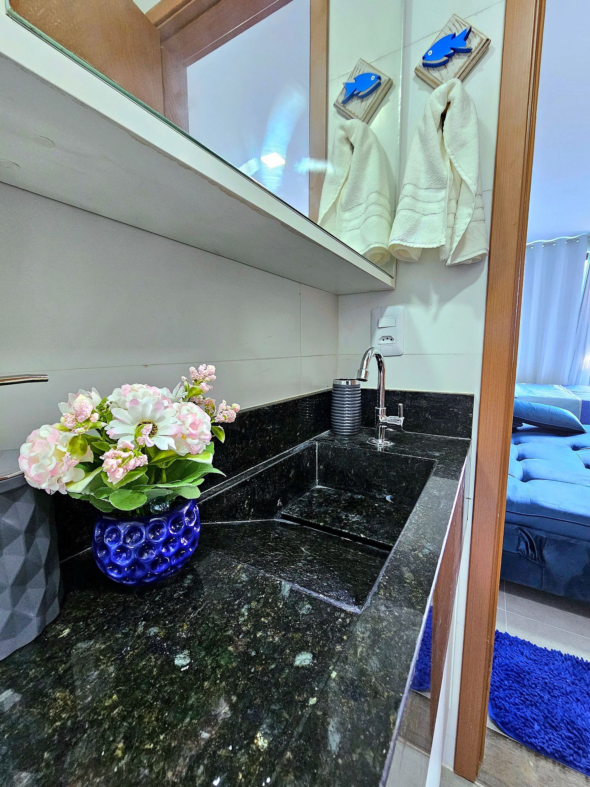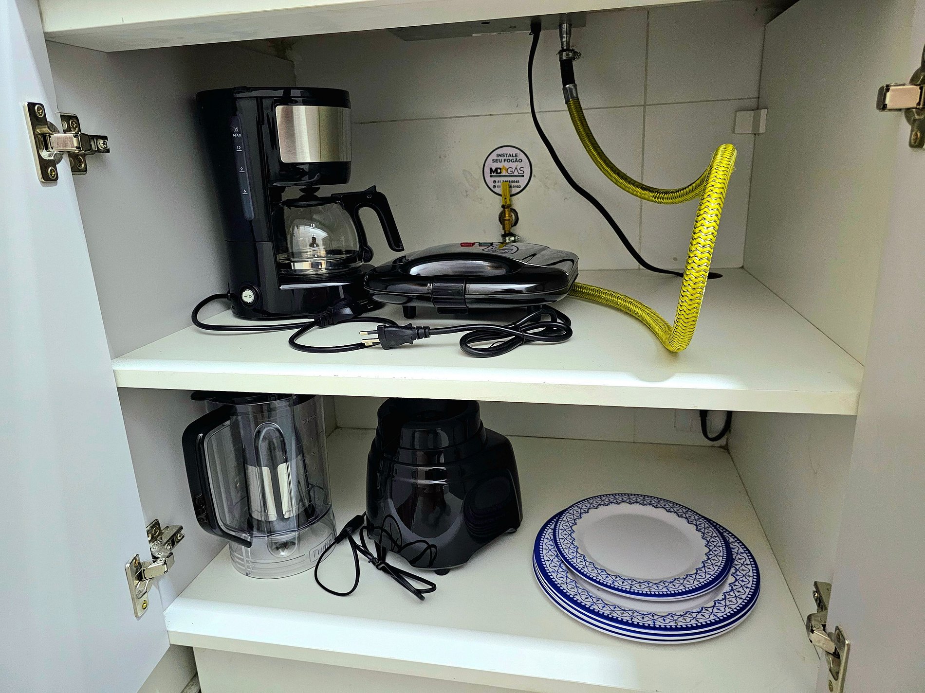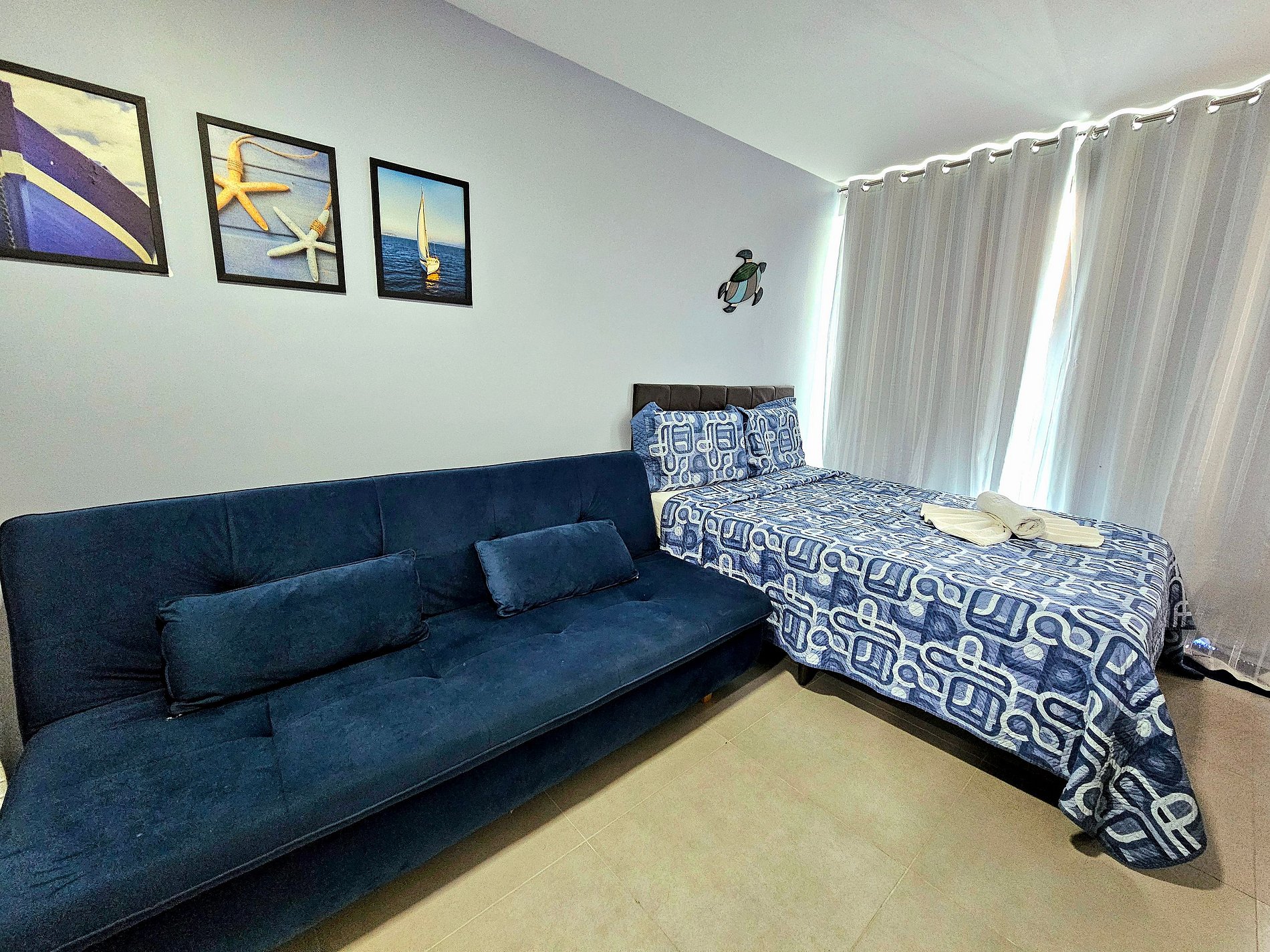 Studio com 1 cama de casal e 1 sofá cama, a cozinha possui os principais eletrodomésticos (cooktop 2 bocas, airfryer, microondas, cafeteira, saduicheira, liquidificador, geladeira com freezer, conjunto de panelas, travessas para servir, etc..) possuímos a incrível varanda com mesa e 4 cadeiras e a exclusiva piscina privativa ( não é aquecida ) que é perfeita para um fim de tarde!