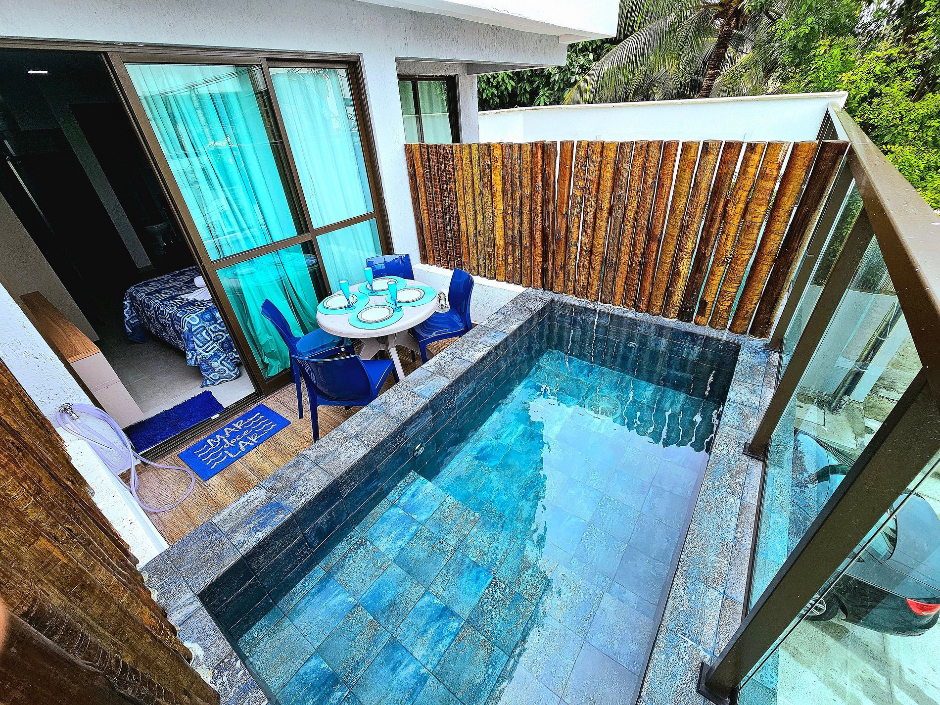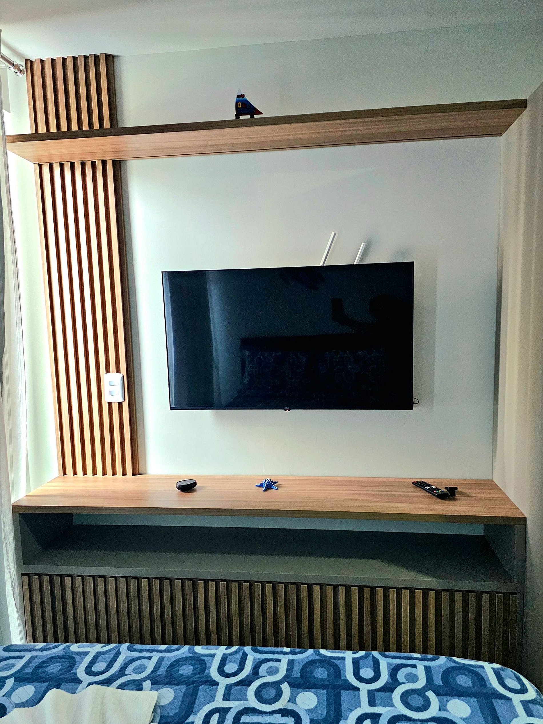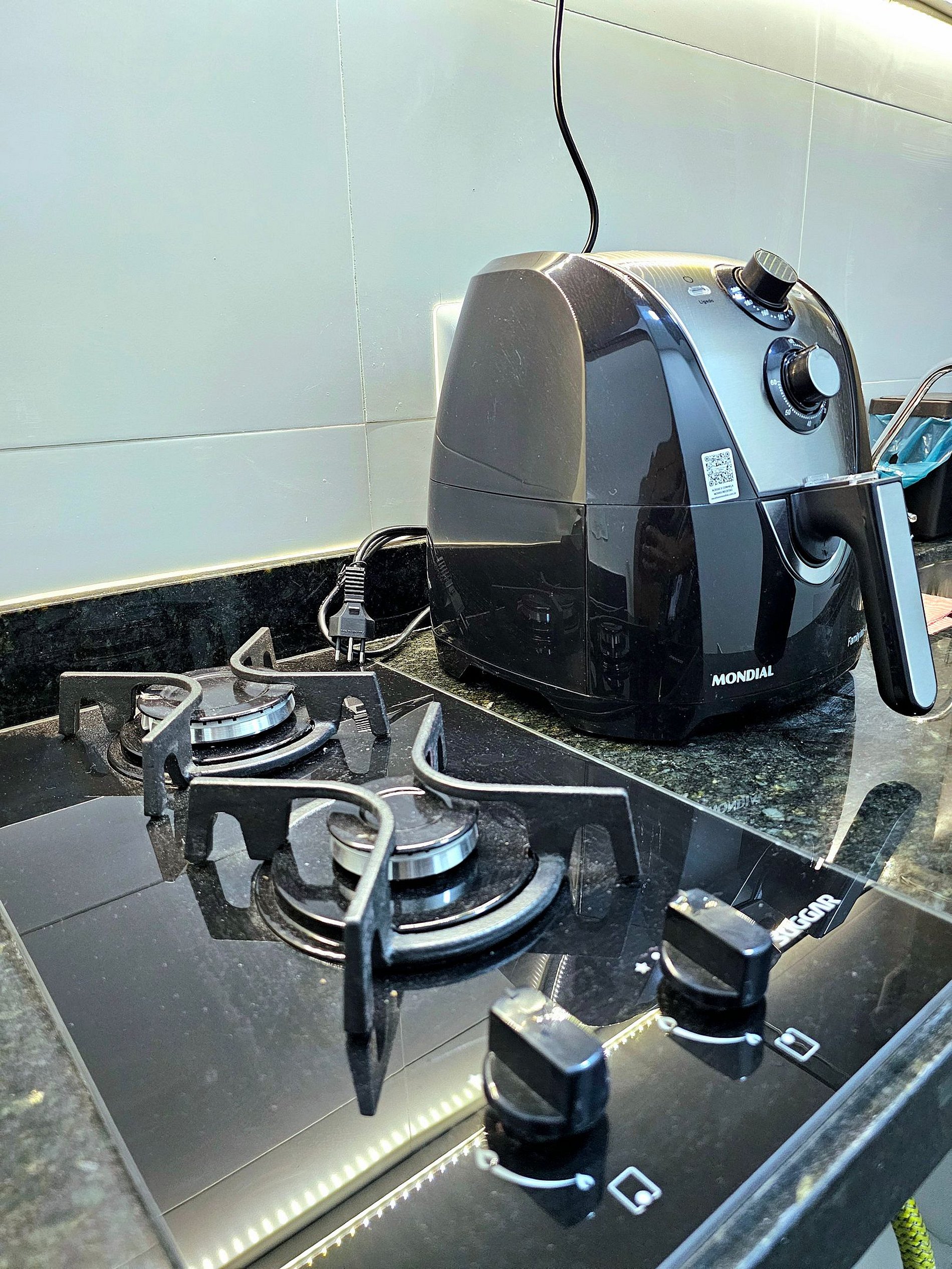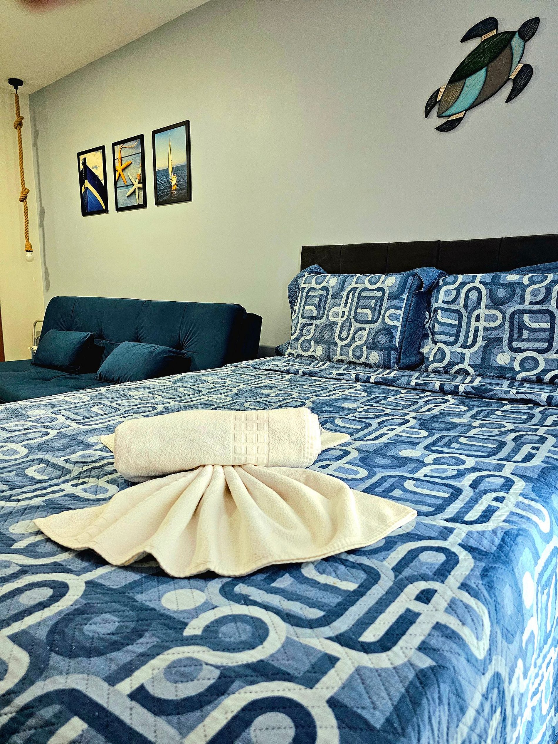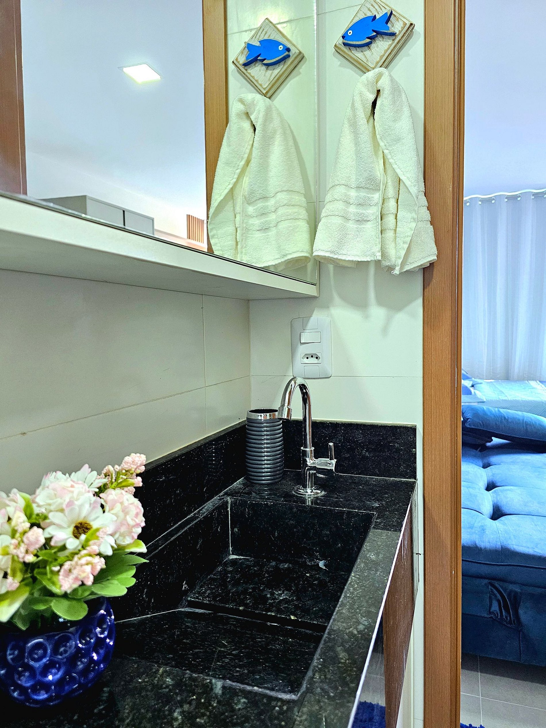 Studio com 1 cama de casal e 1 sofá cama, a cozinha possui os principais eletrodomésticos (cooktop 2 bocas, airfryer, microondas, cafeteira, saduicheira, liquidificador, geladeira com freezer, conjunto de panelas, travessas para servir, etc..) possuímos a incrível varanda com mesa e 4 cadeiras e a exclusiva piscina privativa ( não é aquecida ) que é perfeita para um fim de tarde!