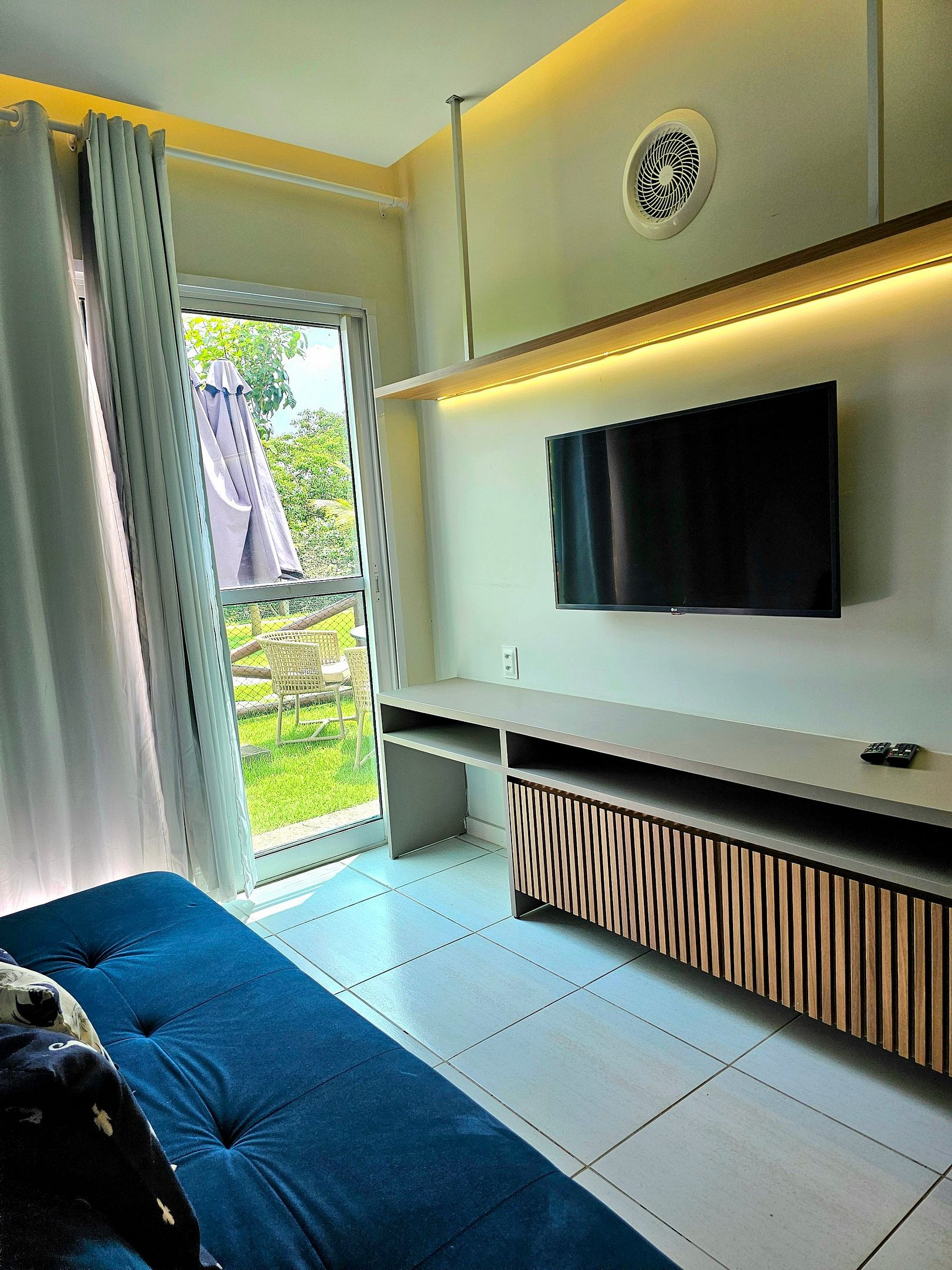 Lindo flat com Garden luxo (Com um conjunto de mesas e cadeiras em corda náutica muito confortável) e a melhor vista do condomínio (virado pra área verde e área de preservação) Cozinha completa e equipada com os principais utensílios e eletrodomésticos (Geladeira, Microondas, Sanduicheira, cafeteira, airfryer, liquidificador...). Acomoda bem até 5 pessoas com uma excelente cama de casal, 1 colchão extra de solteiro e o sofá-cama casal na sala. Possui ar-condicionado grande no quarto e exaustor para conseguir refrigerar todo o apartamento. Nosso flat foi finamente mobiliado para oferecer o máximo de conforto em sua estadia, temos também para maior comodidade dos nossos hóspedes: Ferro de passar e secador de cabelos.