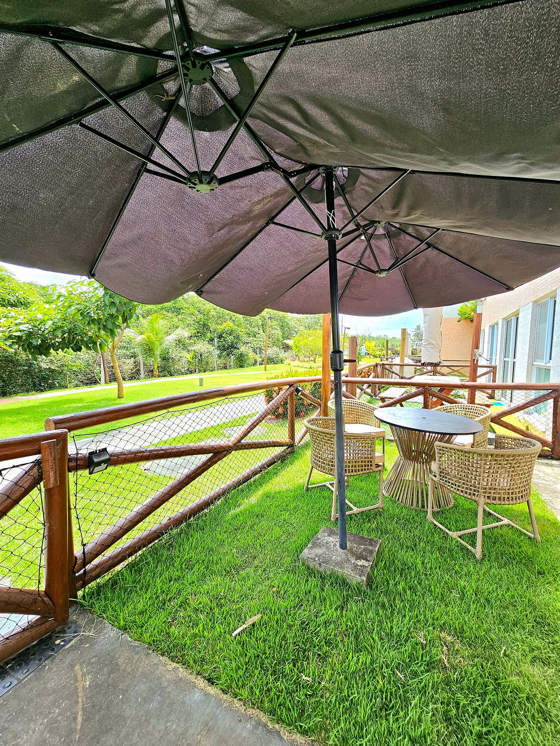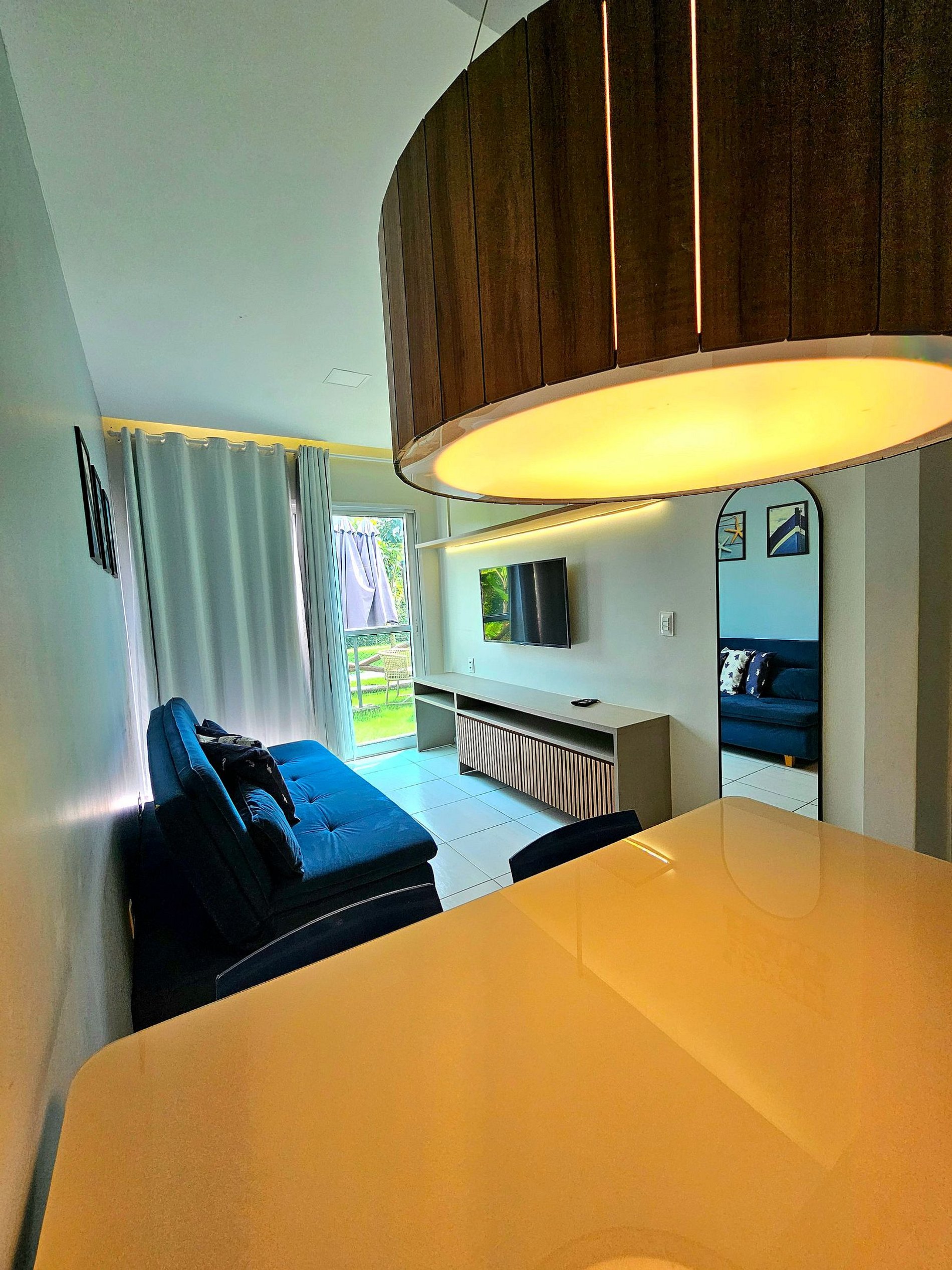 Lindo flat com Garden luxo (Com um conjunto de mesas e cadeiras em corda náutica muito confortável) e a melhor vista do condomínio (virado pra área verde e área de preservação) Cozinha completa e equipada com os principais utensílios e eletrodomésticos (Geladeira, Microondas, Sanduicheira, cafeteira, airfryer, liquidificador...). Acomoda bem até 5 pessoas com uma excelente cama de casal, 1 colchão extra de solteiro e o sofá-cama casal na sala. Possui ar-condicionado grande no quarto e exaustor para conseguir refrigerar todo o apartamento. Nosso flat foi finamente mobiliado para oferecer o máximo de conforto em sua estadia, temos também para maior comodidade dos nossos hóspedes: Ferro de passar e secador de cabelos.