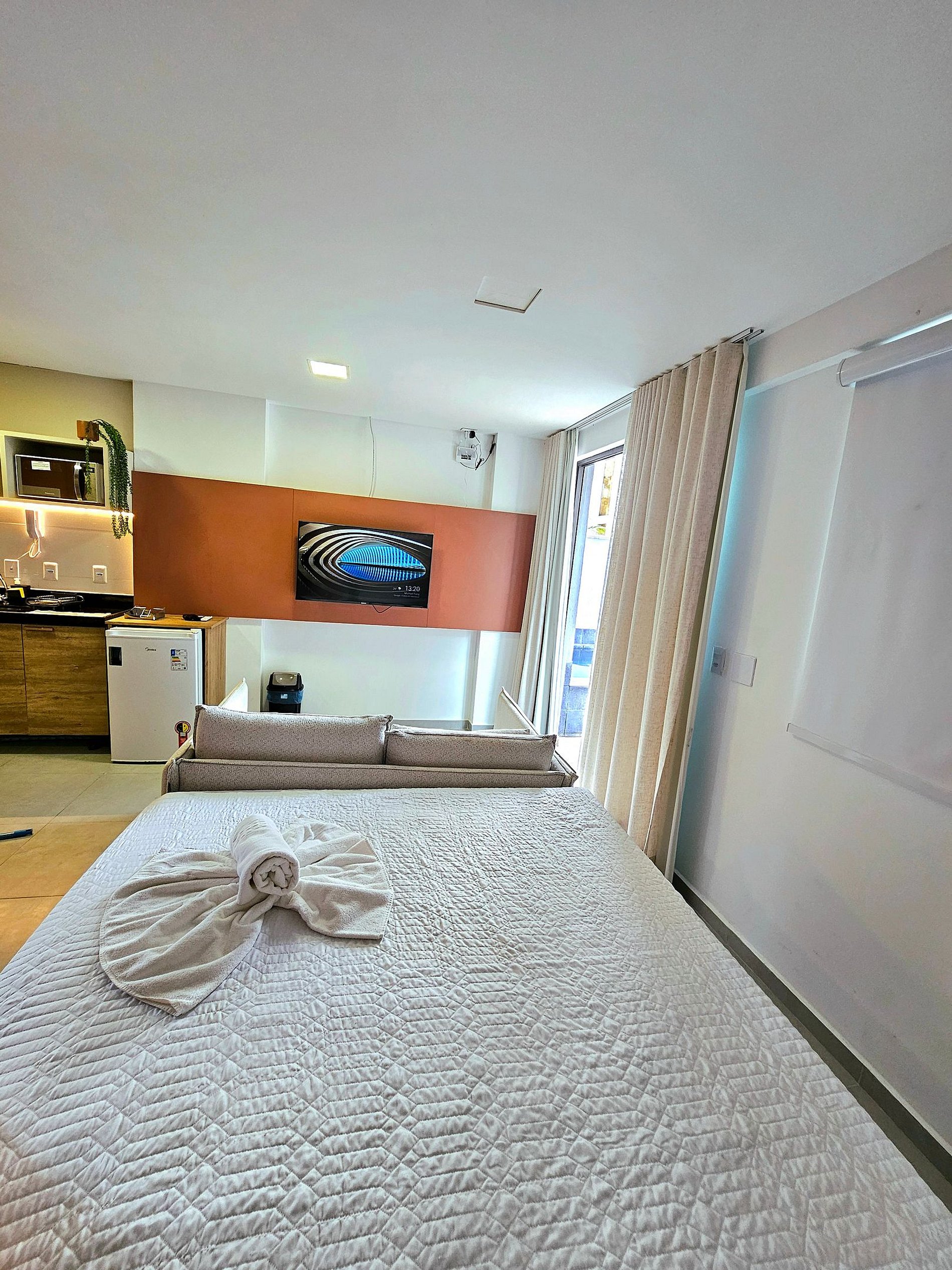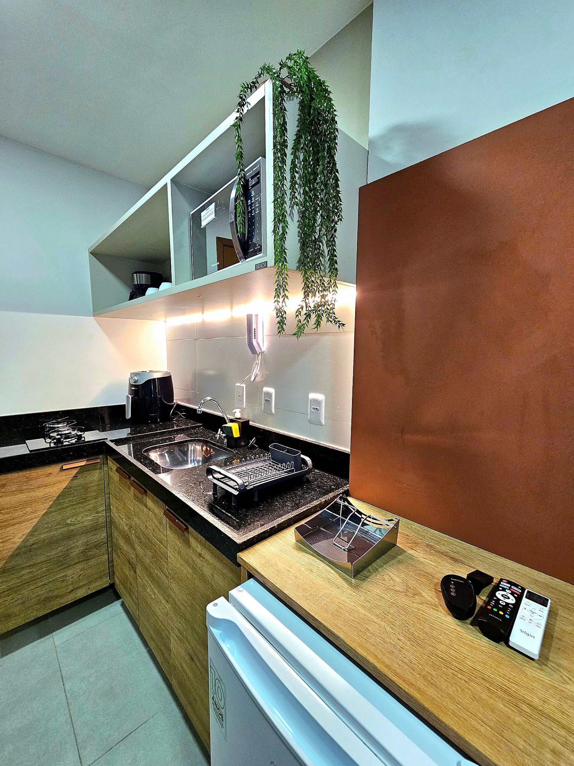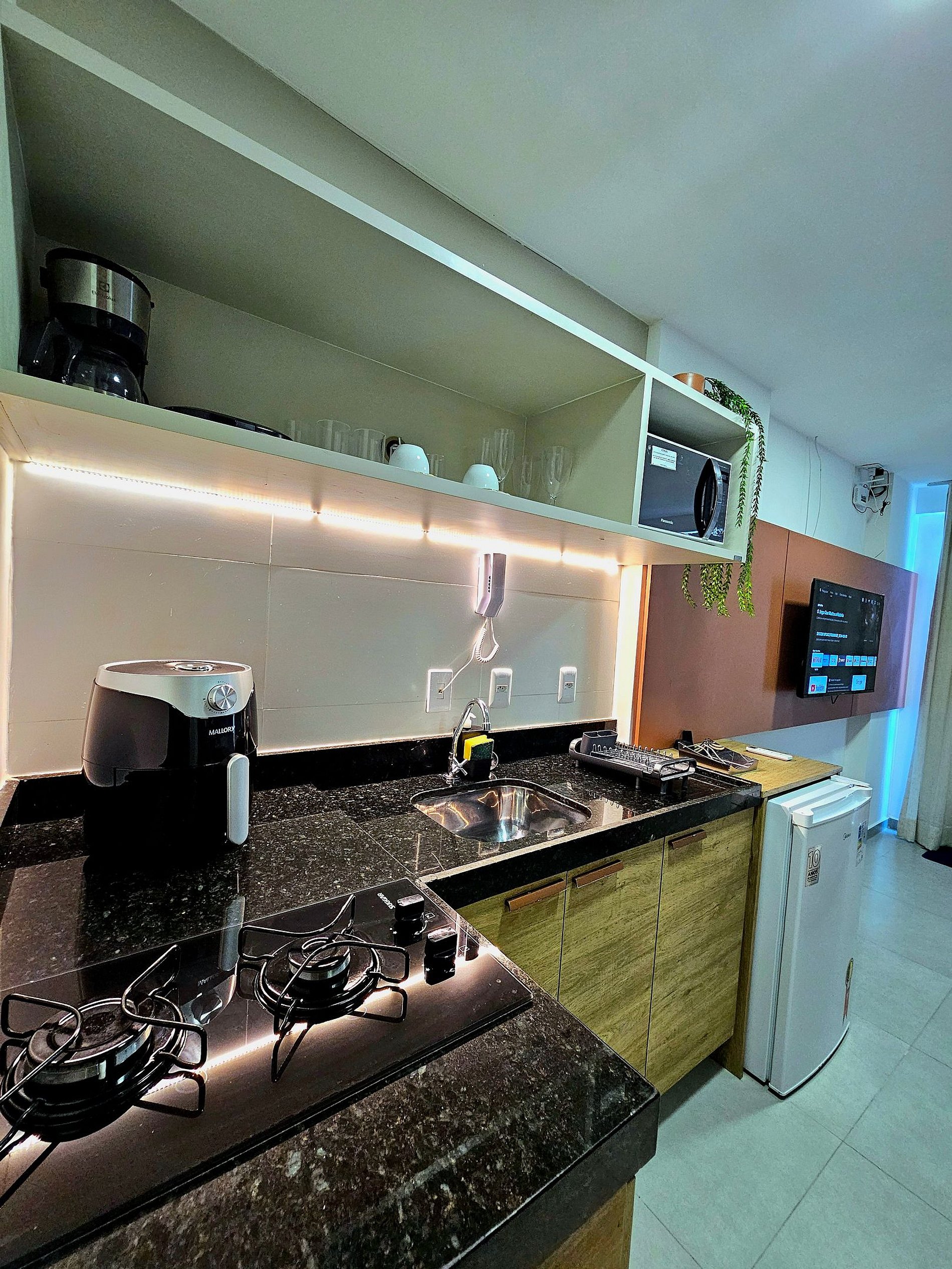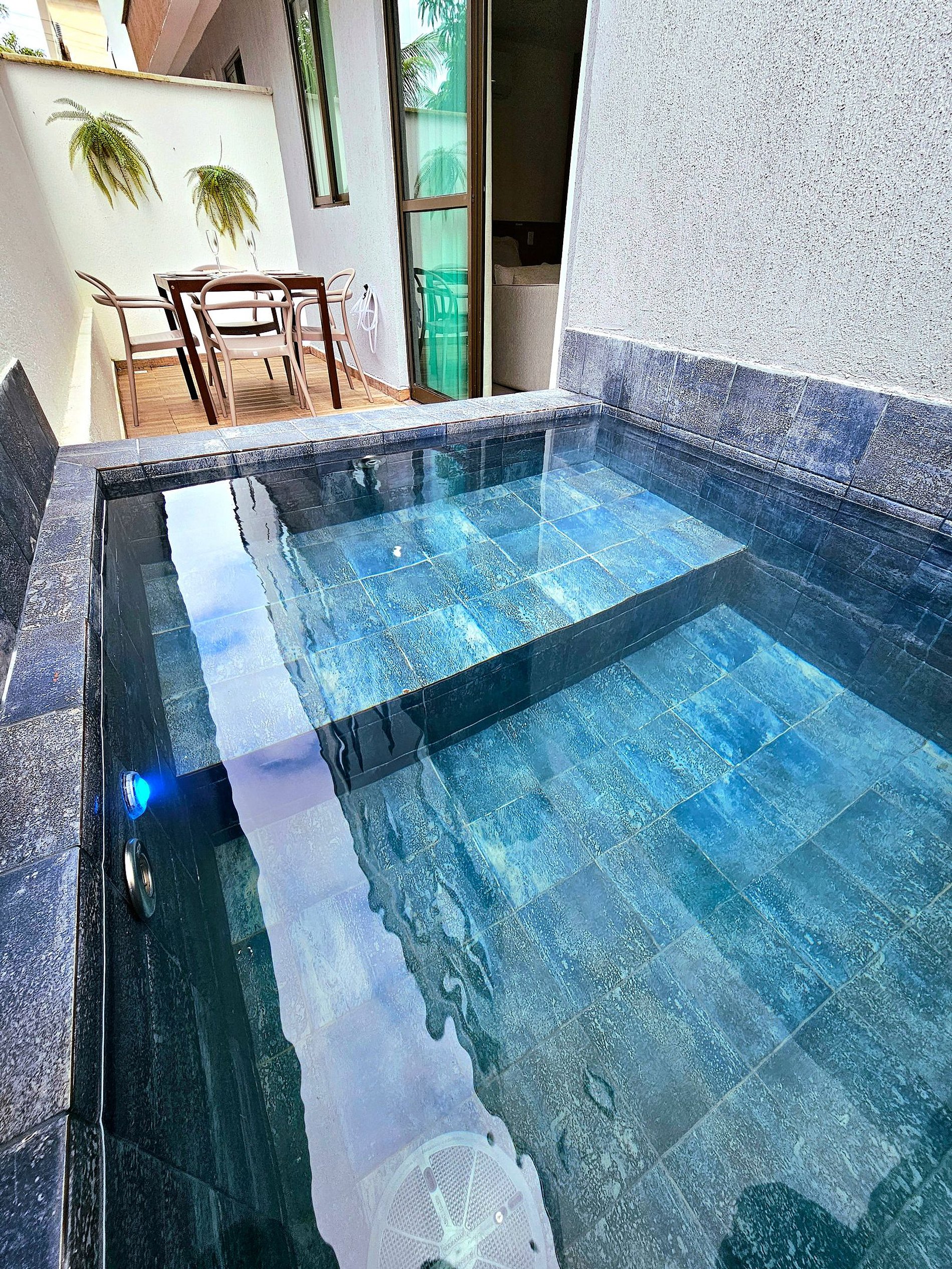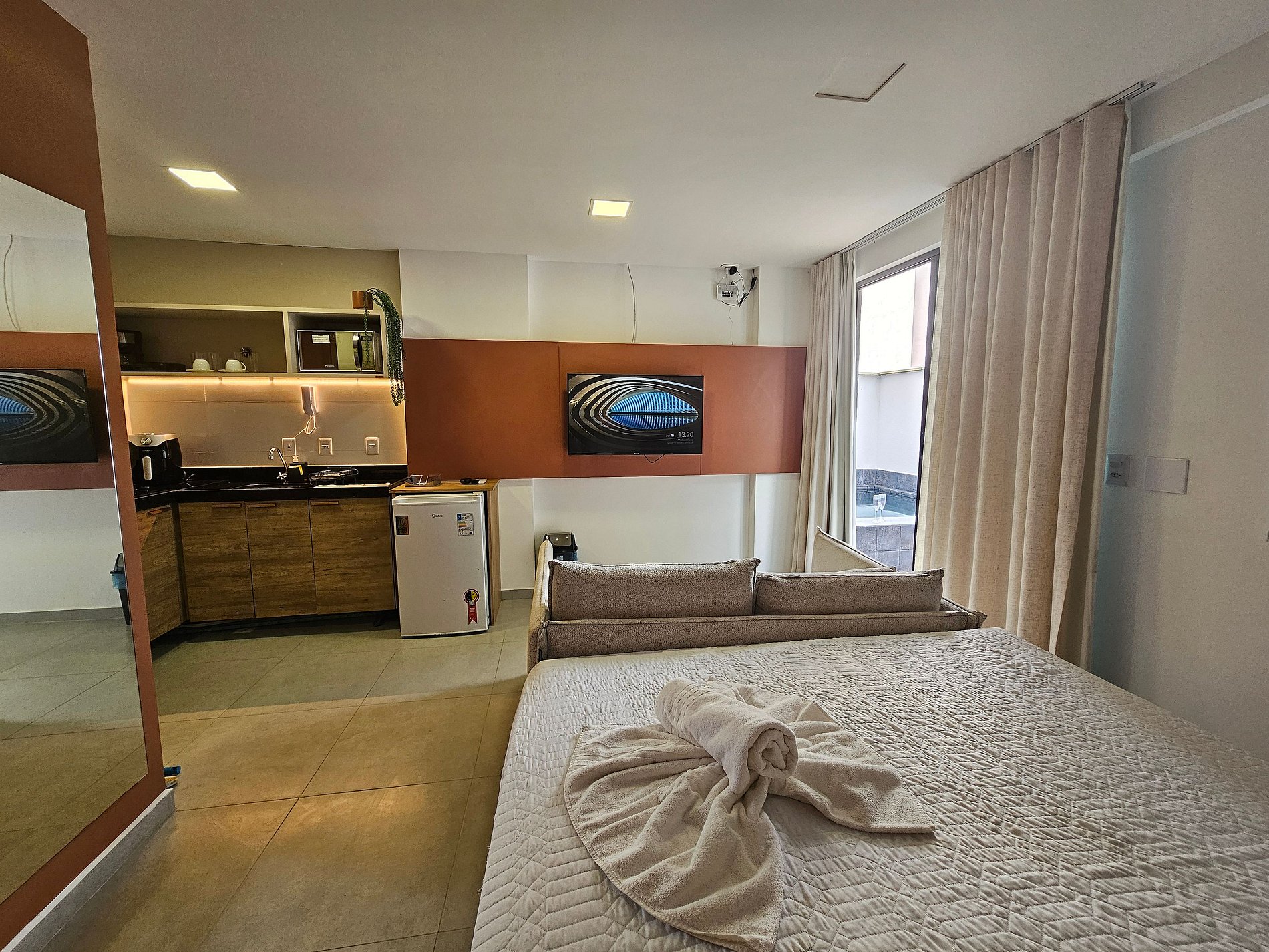 Studio com 1 cama de casal e 1 sofá cama, a cozinha possui os principais eletrodomésticos (cooktop 2 bocas, airfryer, microondas, cafeteira, saduicheira, liquidificador, frigobar com freezer, conjunto de panelas, travessas para servir, etc...) possuímos a incrível varanda com mesa e 4 cadeiras e a exclusiva piscina privativa 🤽♂️ que é perfeita para um fim de tarde! 🌇