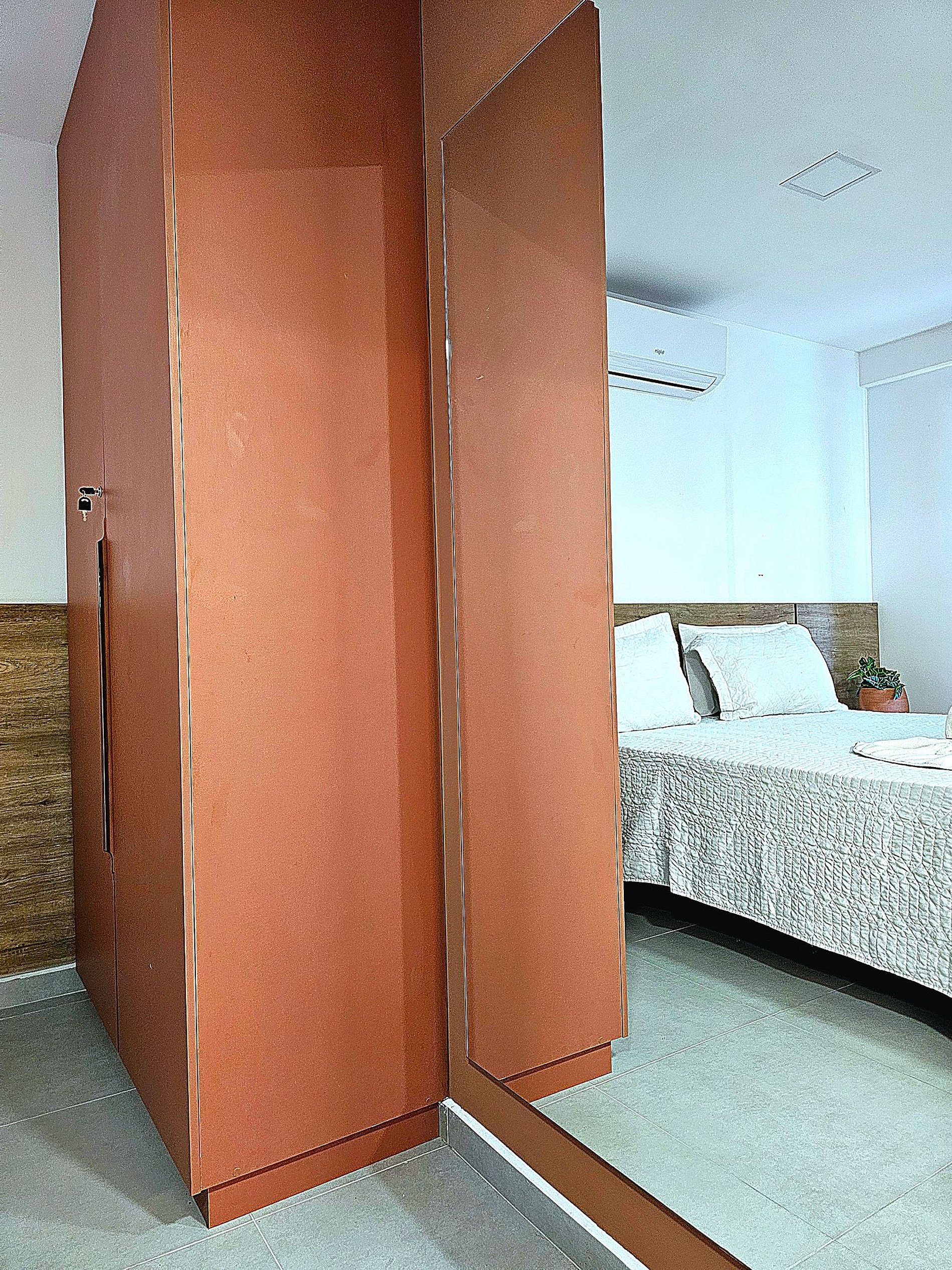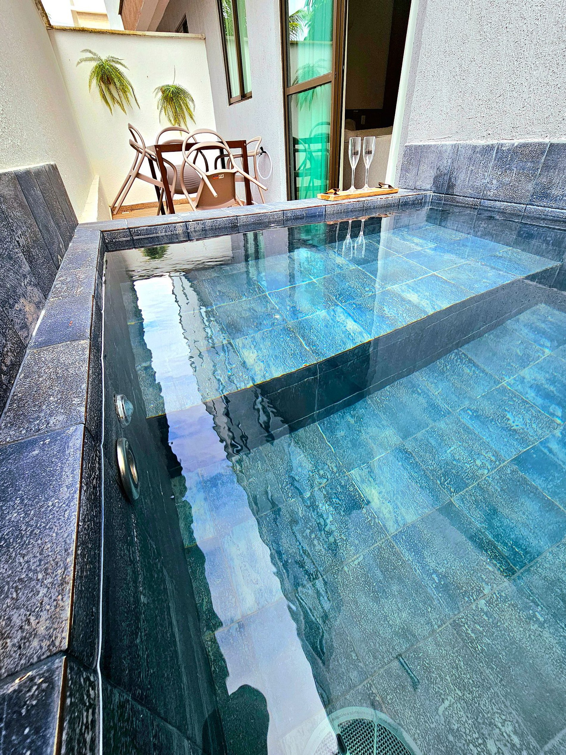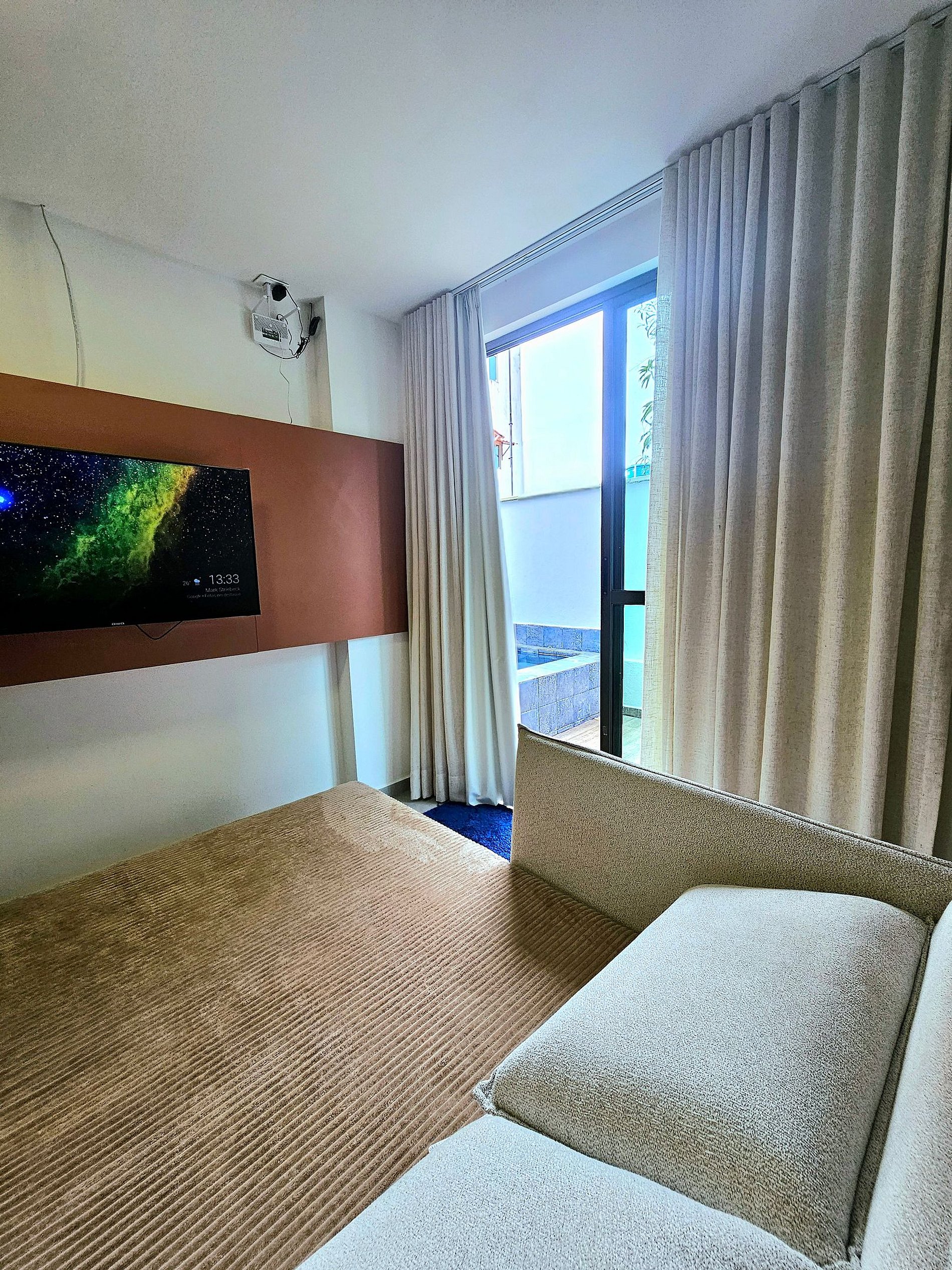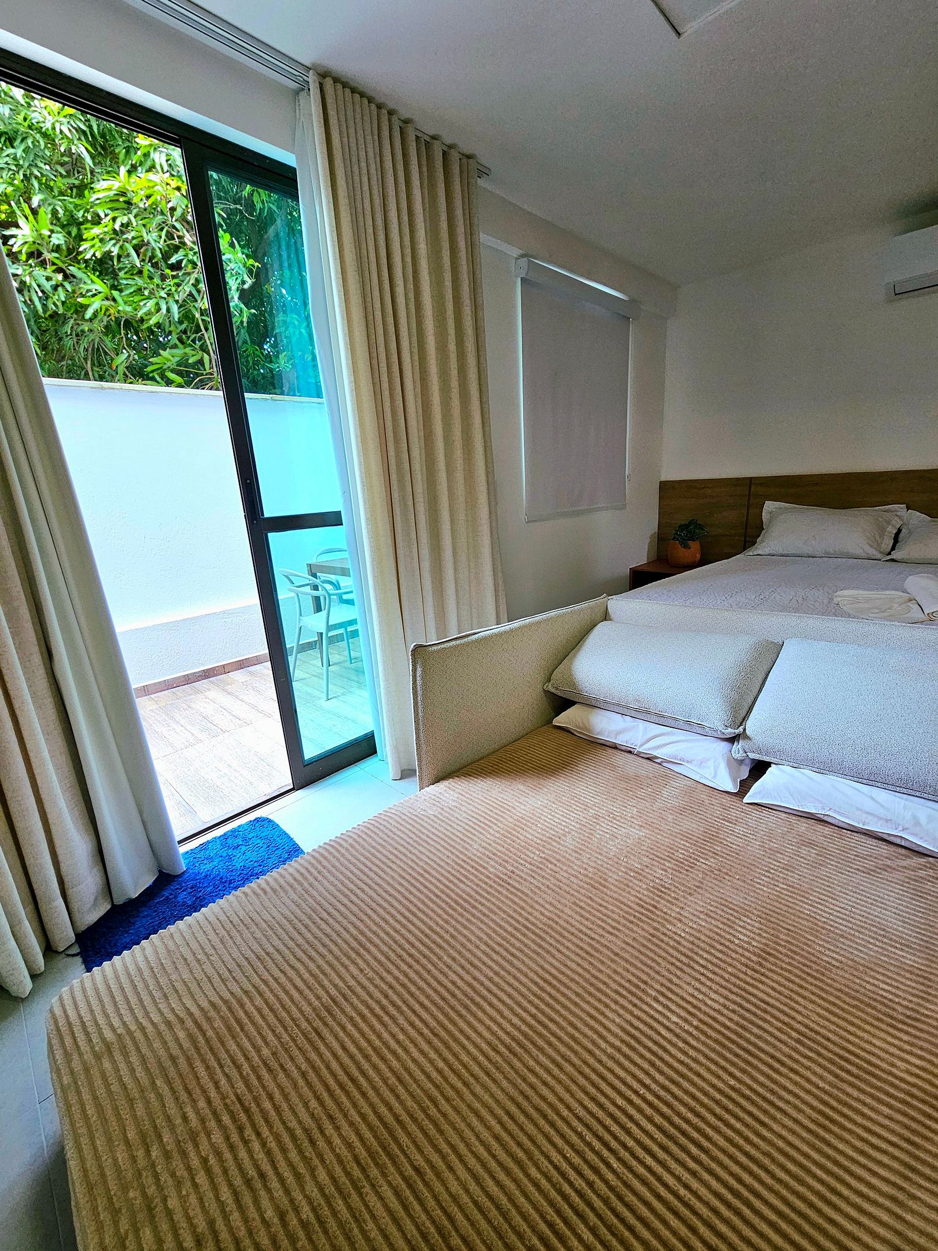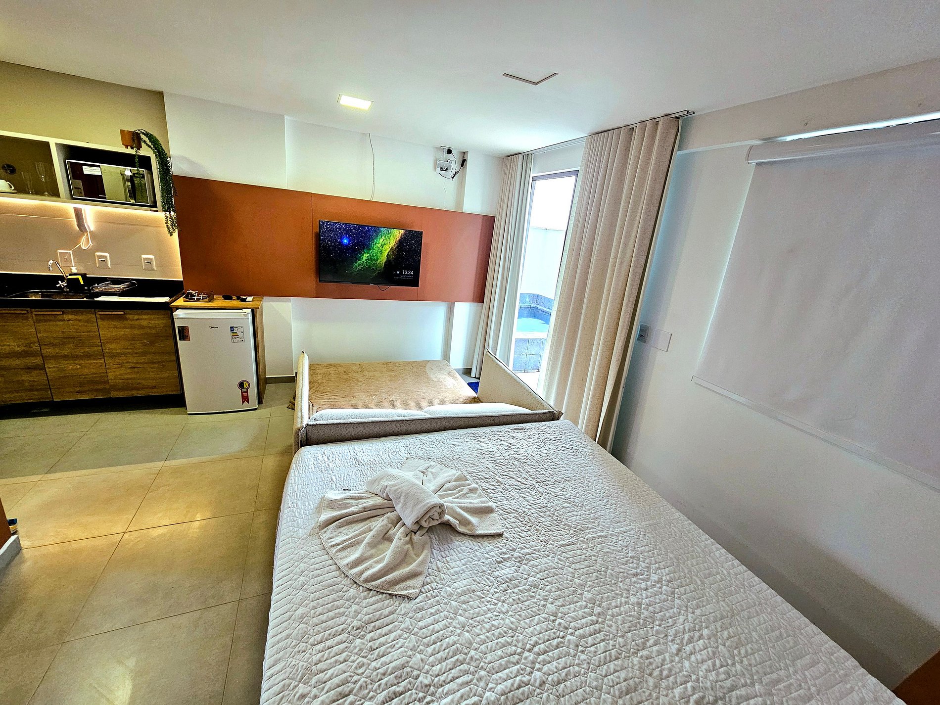 Studio com 1 cama de casal e 1 sofá cama, a cozinha possui os principais eletrodomésticos (cooktop 2 bocas, airfryer, microondas, cafeteira, saduicheira, liquidificador, frigobar com freezer, conjunto de panelas, travessas para servir, etc...) possuímos a incrível varanda com mesa e 4 cadeiras e a exclusiva piscina privativa 🤽♂️ que é perfeita para um fim de tarde! 🌇