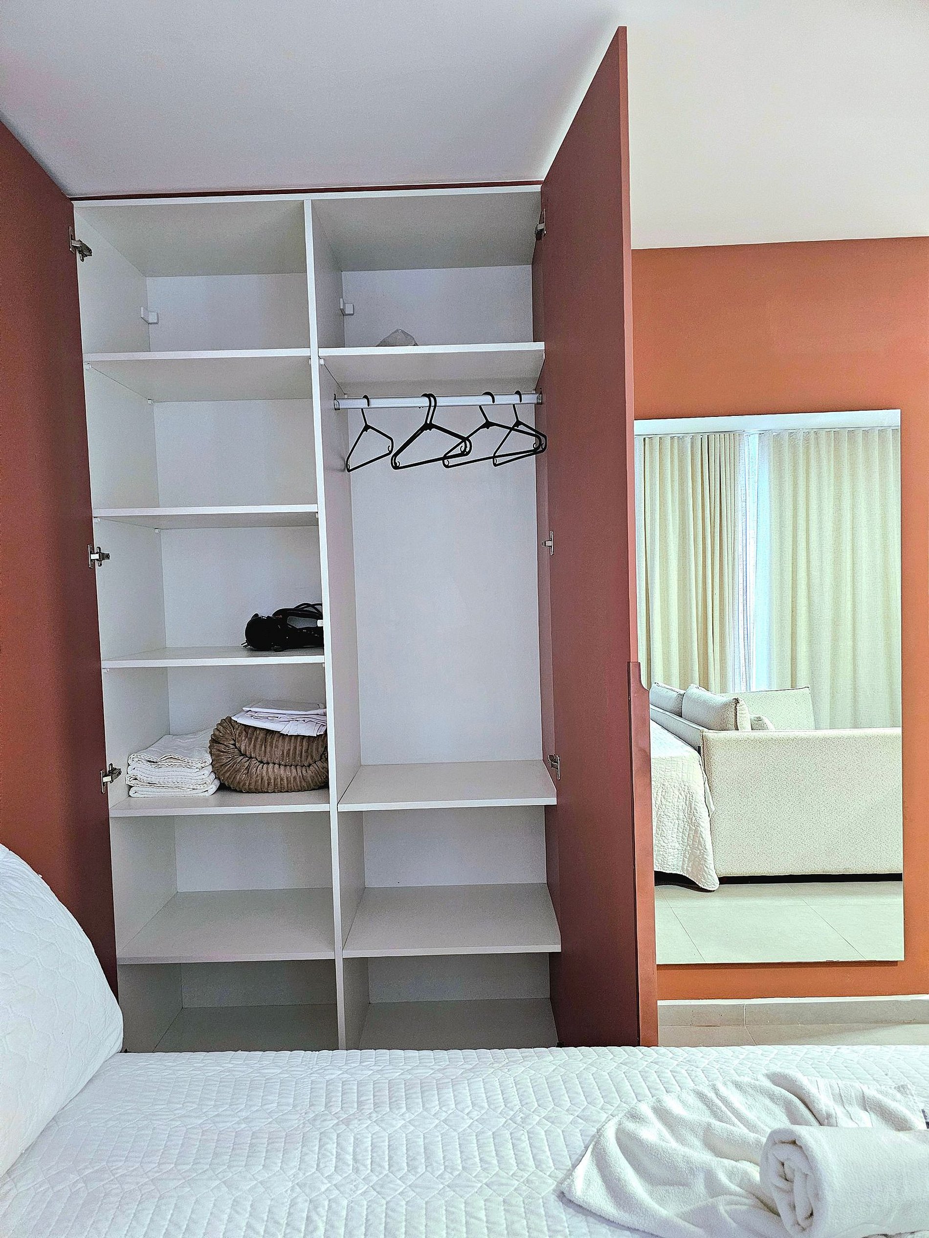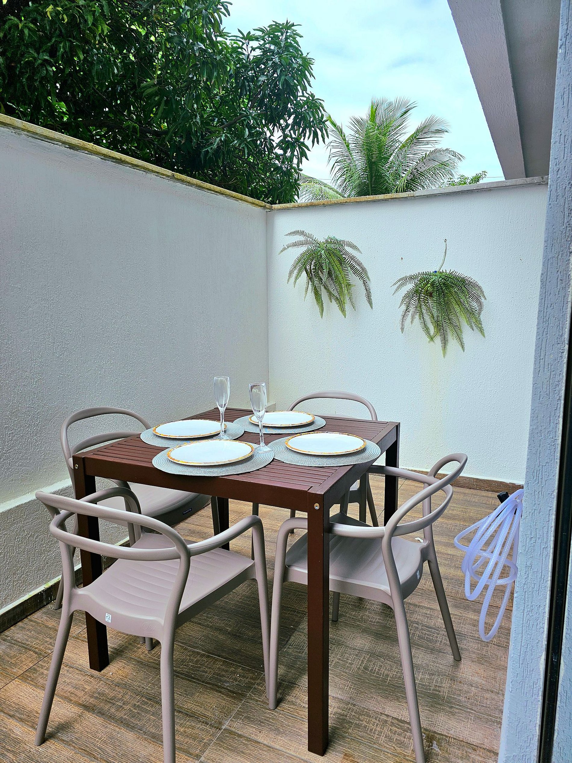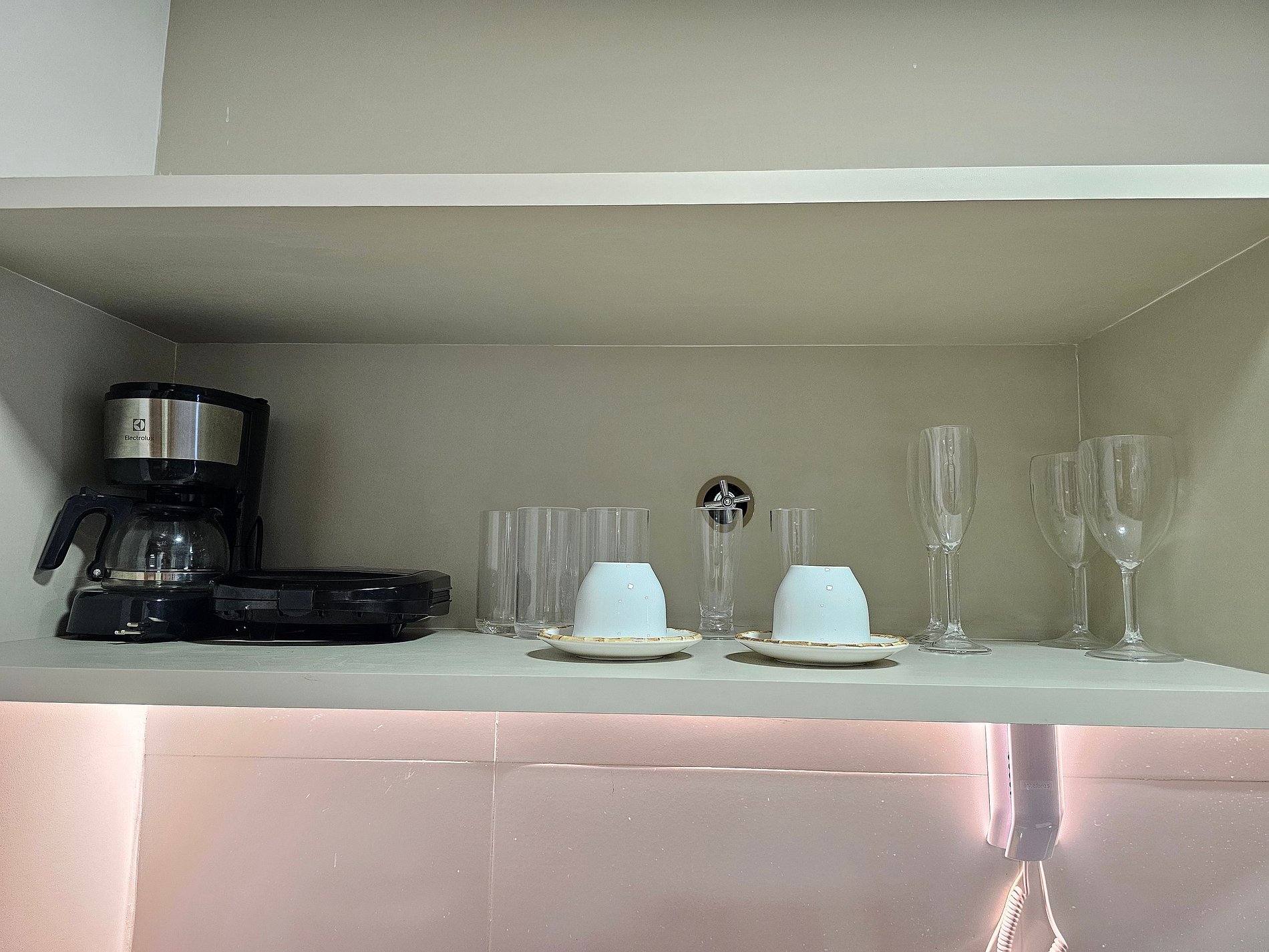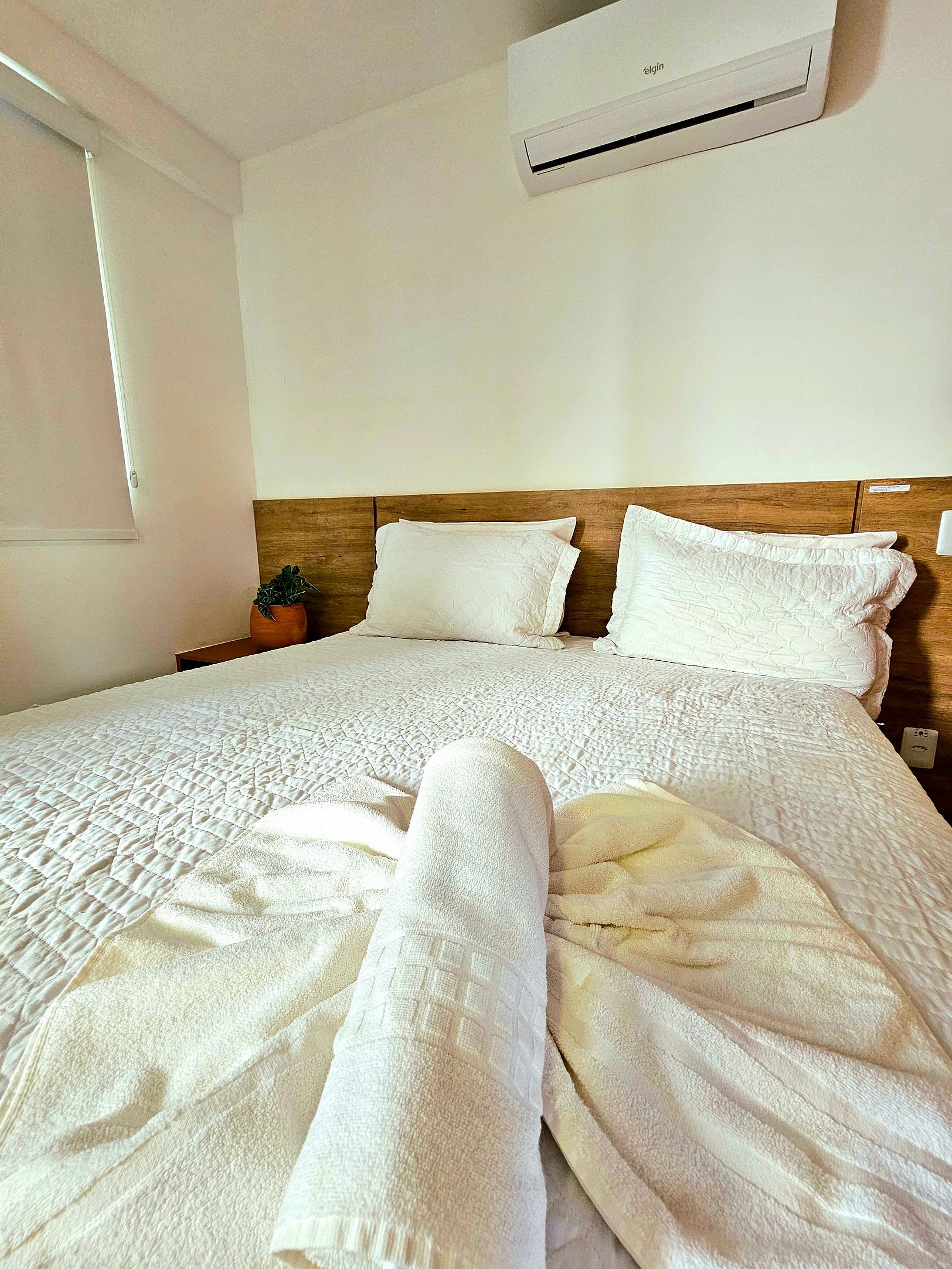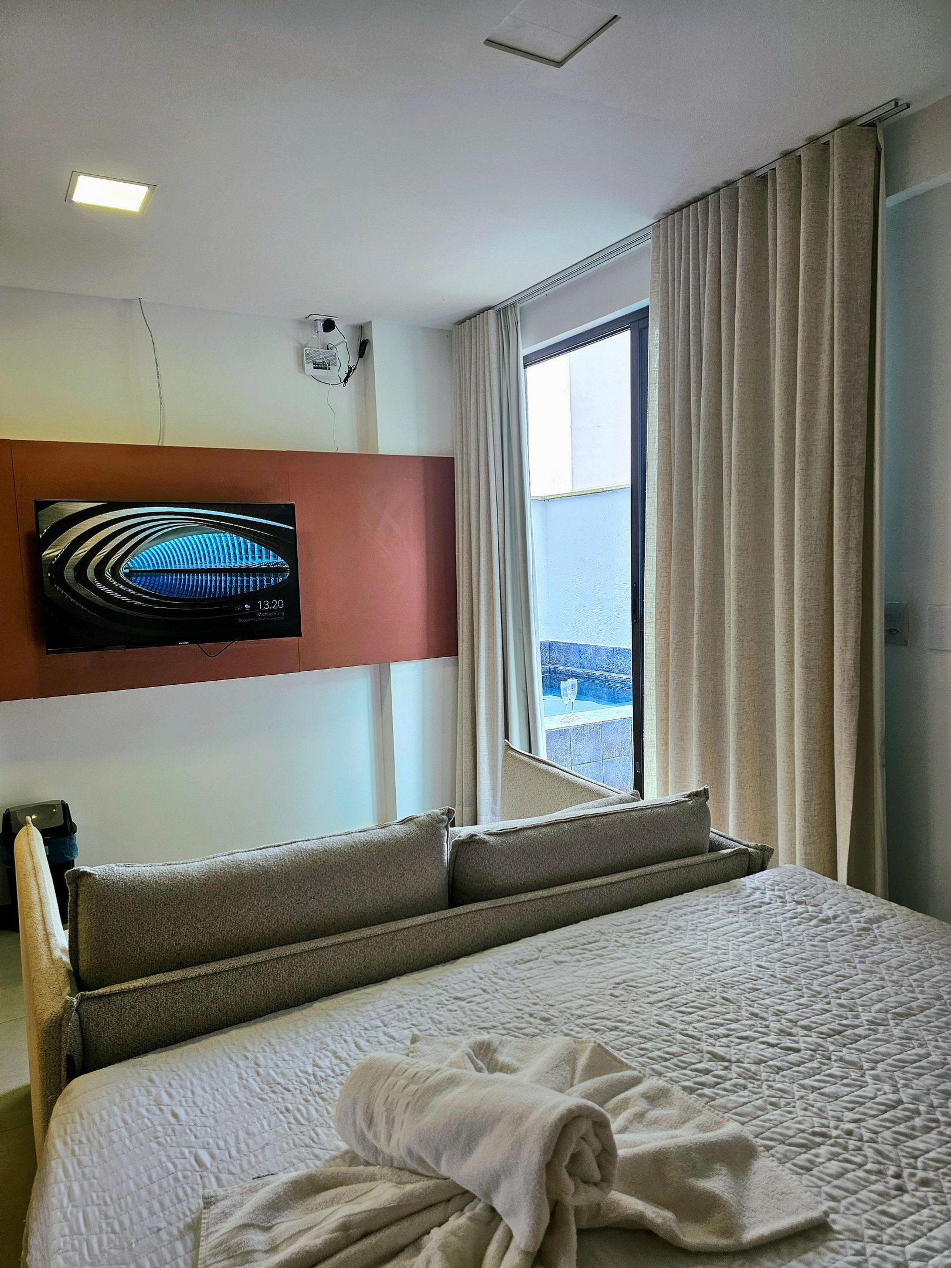 Studio com 1 cama de casal e 1 sofá cama, a cozinha possui os principais eletrodomésticos (cooktop 2 bocas, airfryer, microondas, cafeteira, saduicheira, liquidificador, frigobar com freezer, conjunto de panelas, travessas para servir, etc...) possuímos a incrível varanda com mesa e 4 cadeiras e a exclusiva piscina privativa 🤽♂️ que é perfeita para um fim de tarde! 🌇