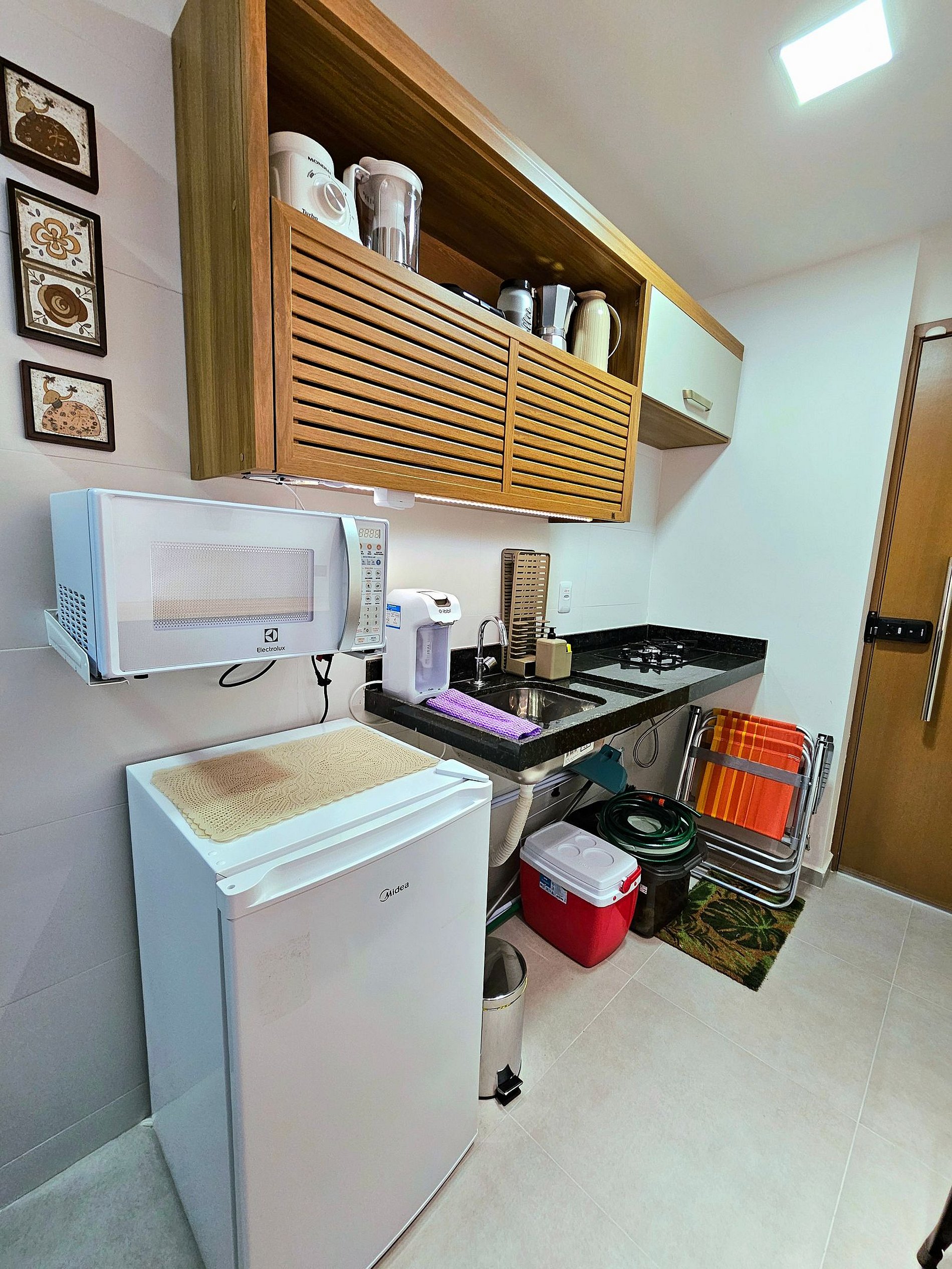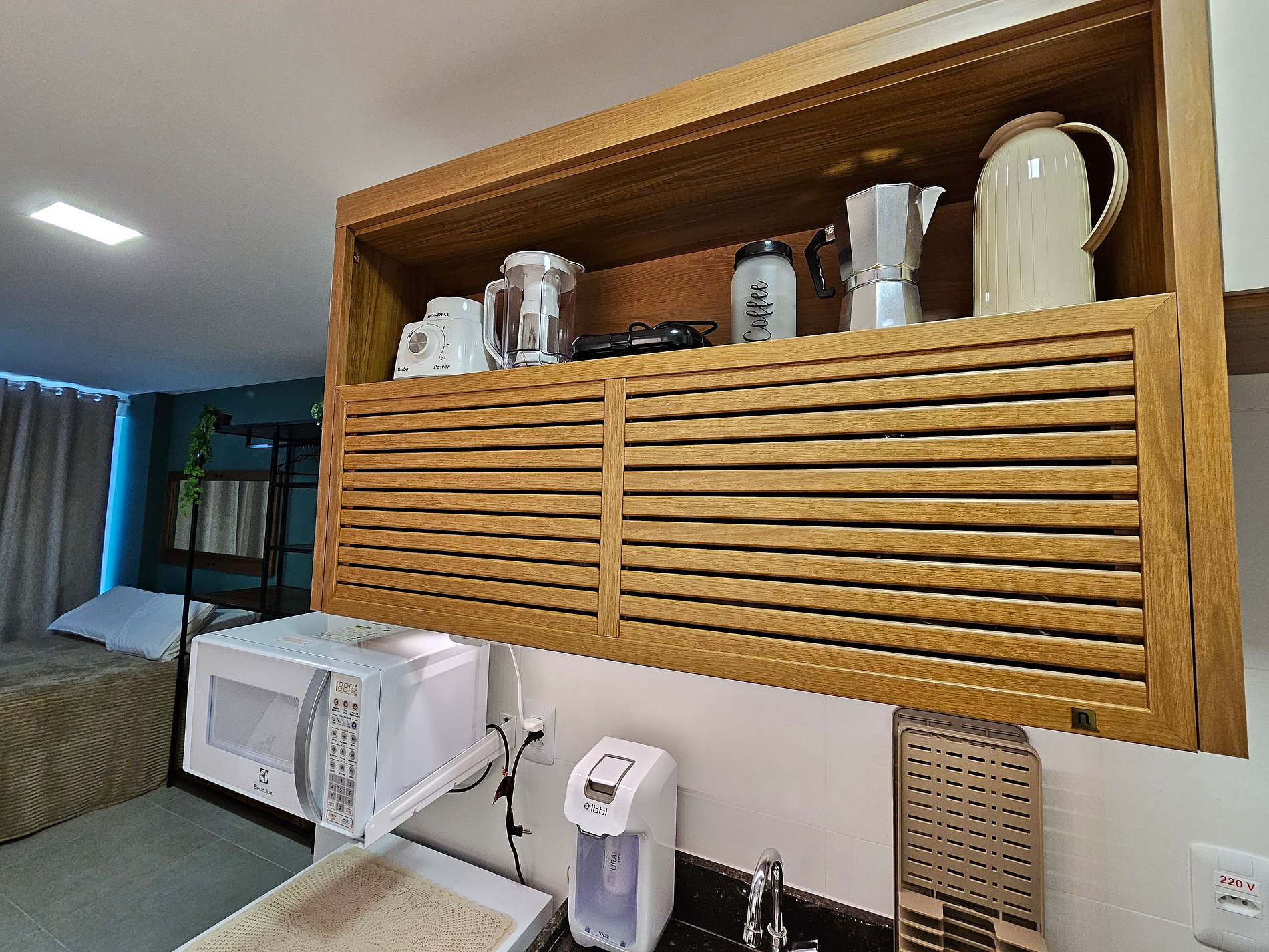 Nossa unidade possui 1 cama de casal e 1 sofá cama, a cozinha possui os principais eletrodomésticos (cooktop 2 bocas, airfryer, microondas, cafeteira, saduicheira, liquidificador, frigobar, conjunto de panelas, travessas, etc...), possuímos na nossa unidade uma área externa com a exclusiva piscina privativa ( não é aquecida ) que é perfeita para um fim de tarde! Temos ainda em nosso flat: cooler e 2 cadeiras de praia para maior comodidade dos nossos hóspedes.