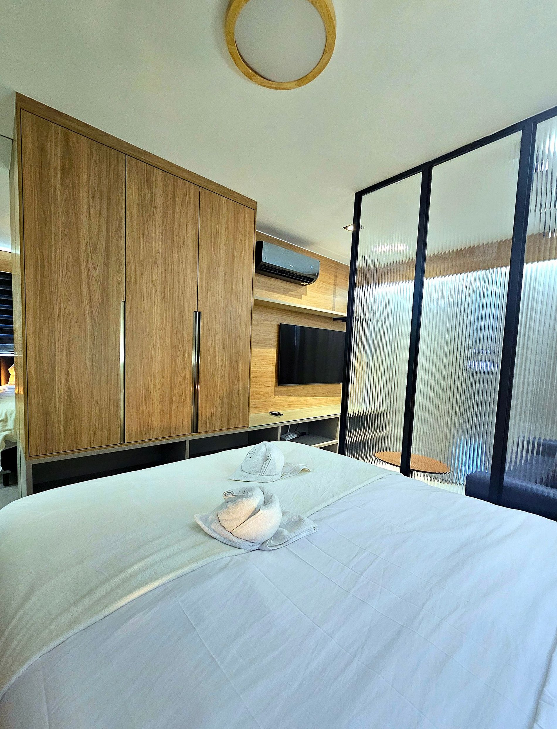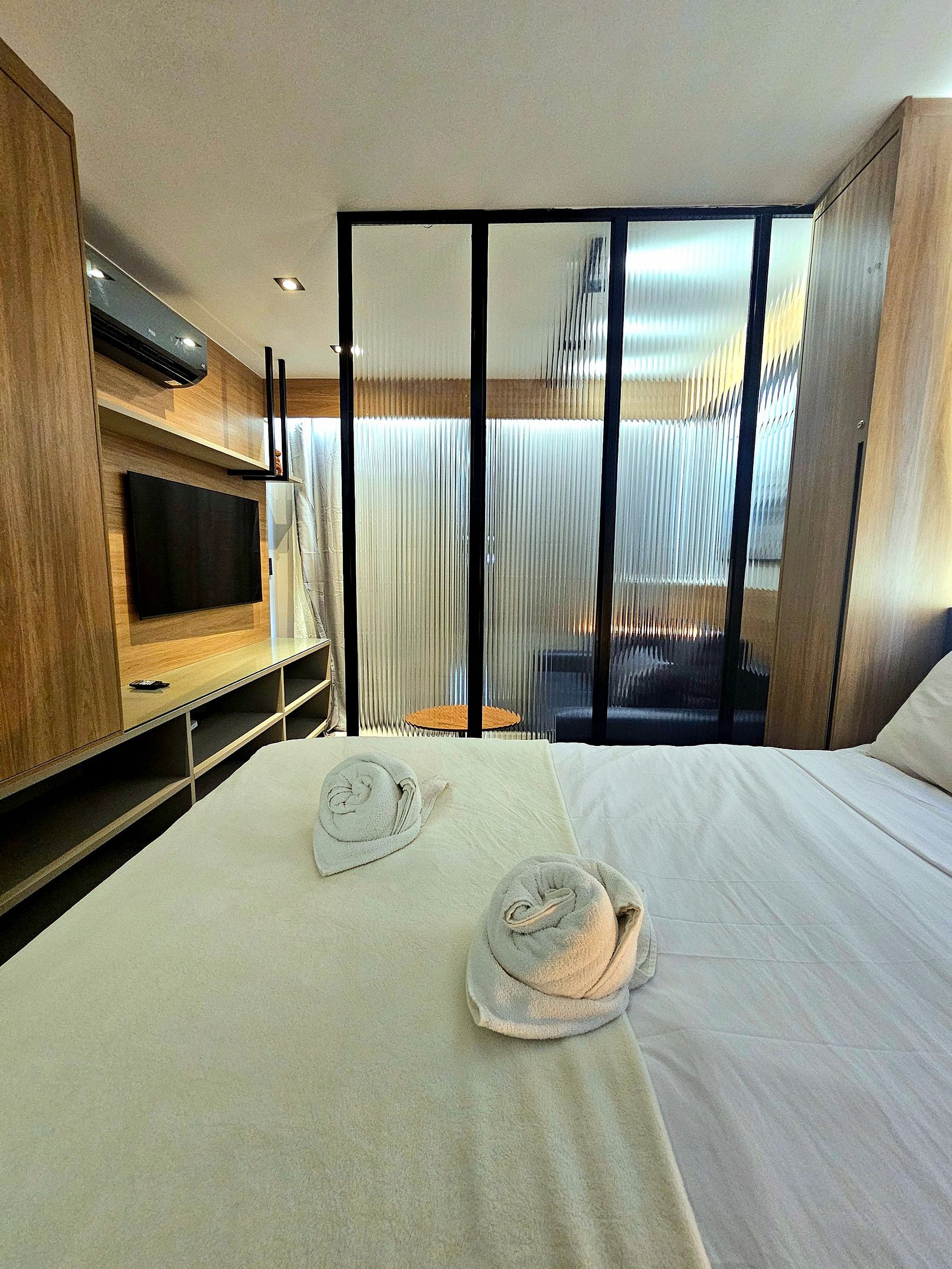 Este lindo Studio com Varanda foi projetado para proporcionar uma estadia com muito estilo e conforto. A decoração moderna, com iluminação aconchegante, cria um ambiente agradável, perfeito para relaxar após um dia explorando Porto de Galinhas.