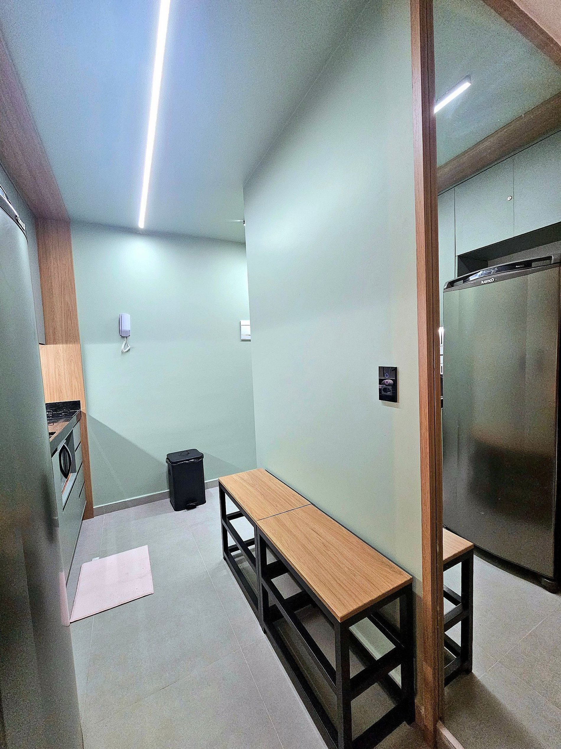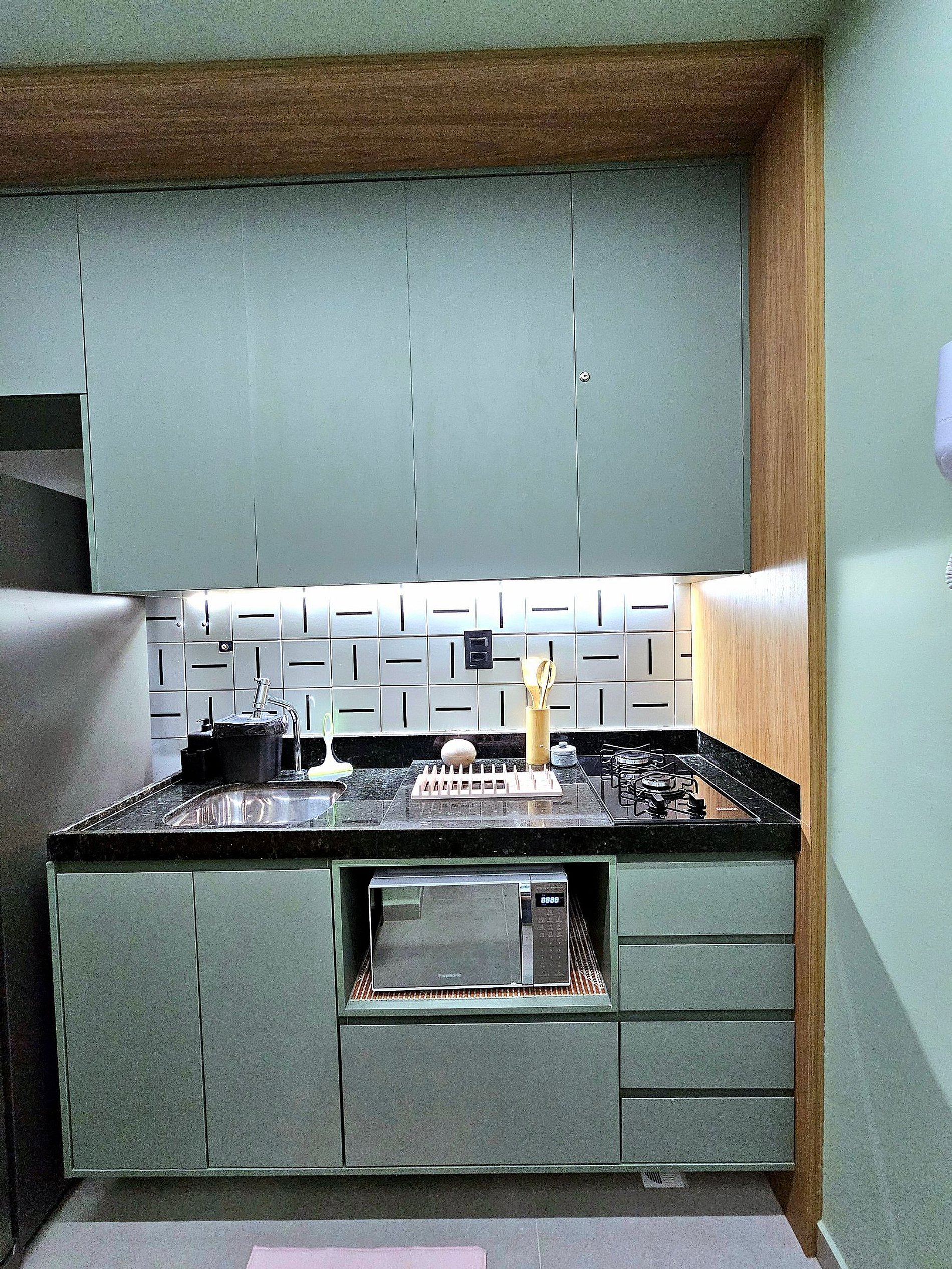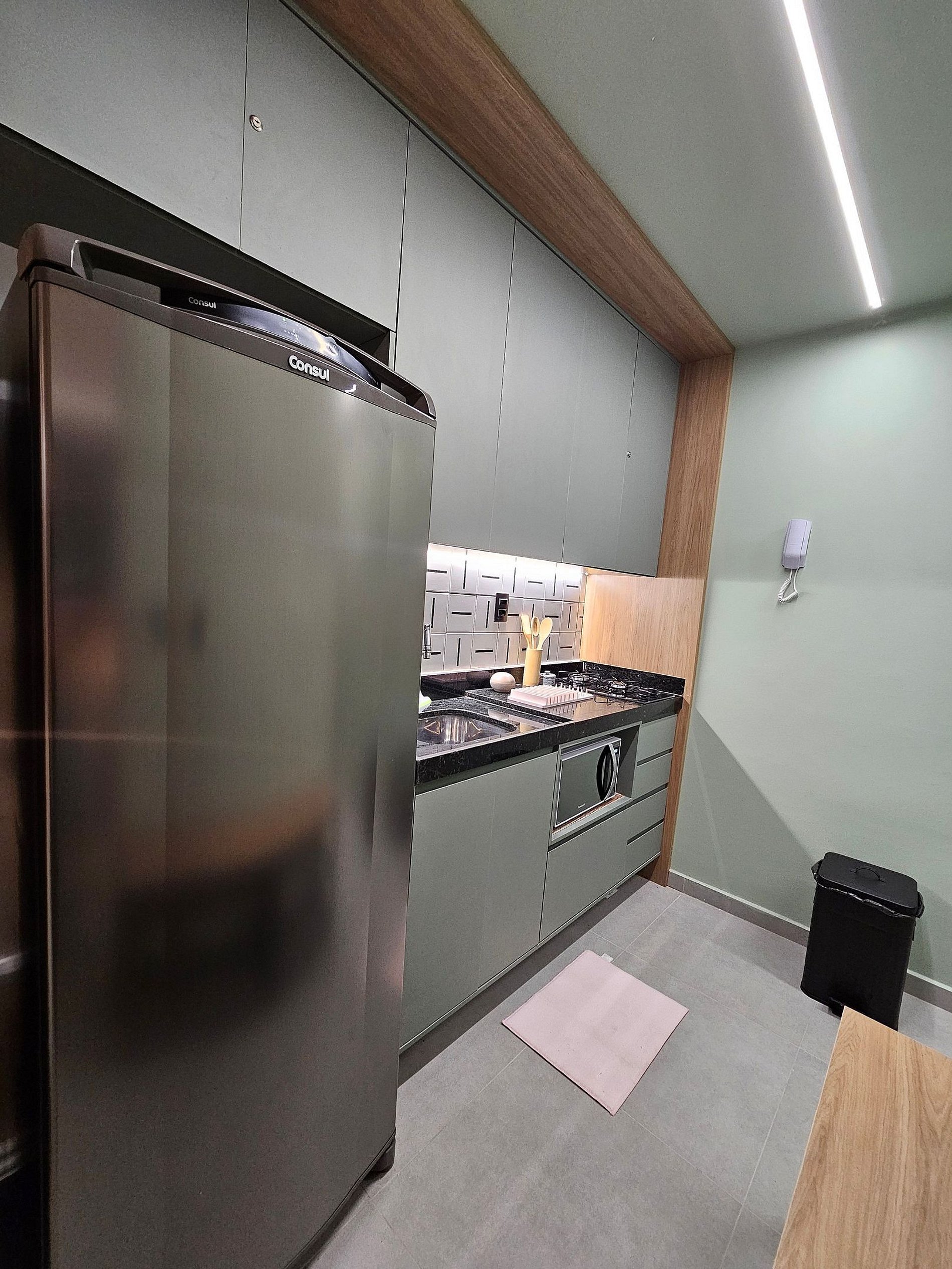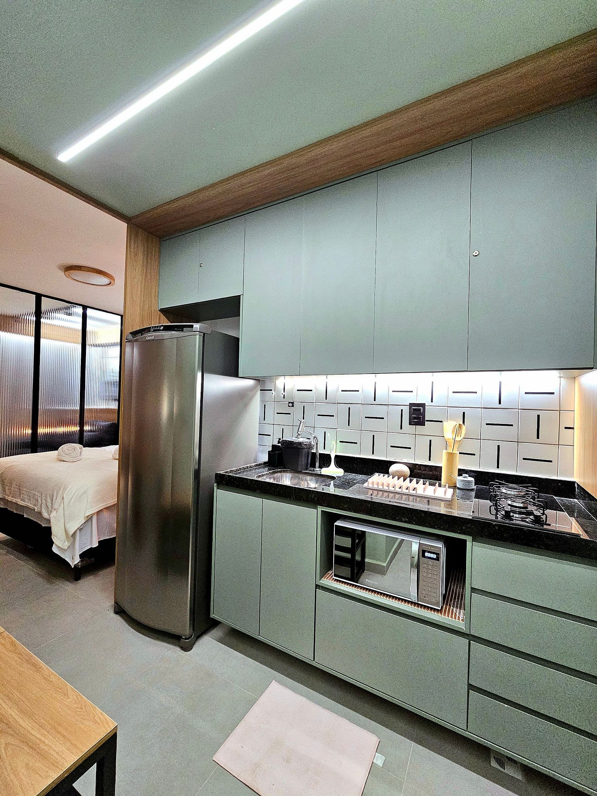Tudo foi pensado para oferecer praticidade e bem-estar. A cozinha completa é equipada com os principais eletrodomésticos, incluindo geladeira, cooktop, liquidificador e cafeteira, além de utensílios de cozinha essenciais. Este ambiente foi planejado para que você possa preparar suas refeições de forma prática e conveniente, aproveitando o máximo de sua estadia sem abrir mão de conforto.