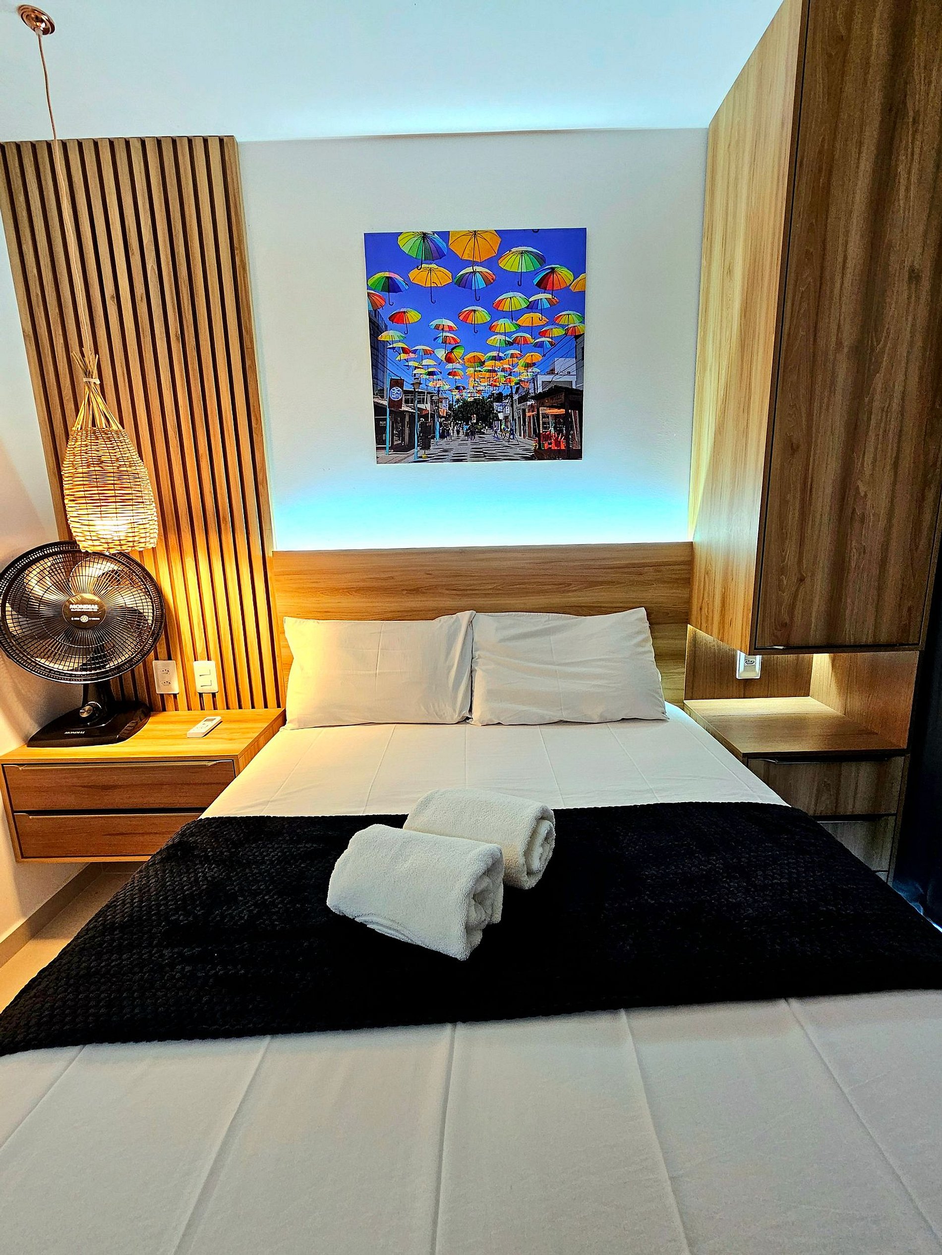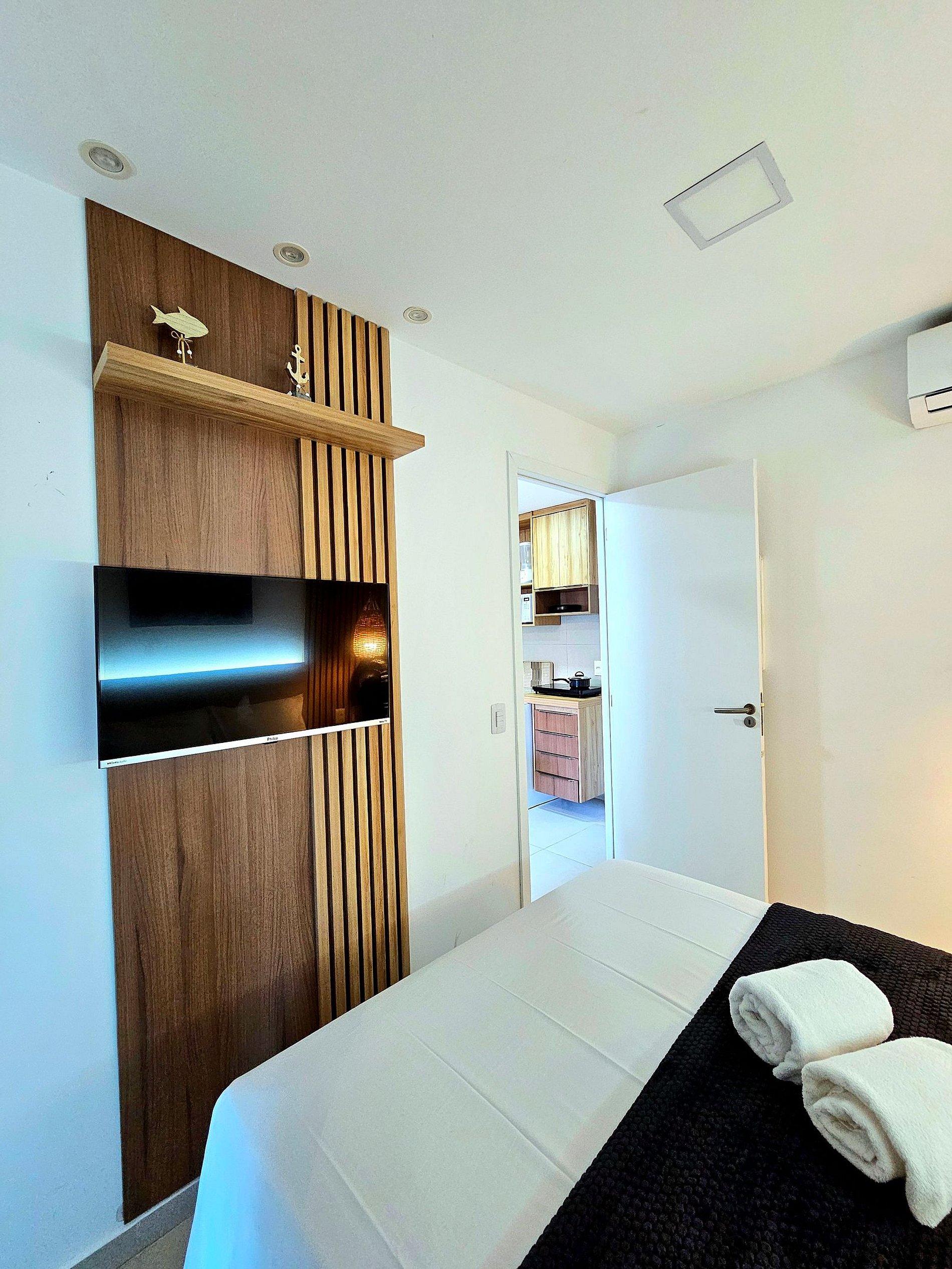 Apartamento de 1 quarto com 1 cama de casal e 1 sofá-cama na sala (Tanto quarto como sala climatizados), a cozinha bem equipada com os principais eletrodomésticos (cooktop 2 bocas, microondas, sanduicheira, liquidificador, frigobar, conjunto de panelas, etc..).