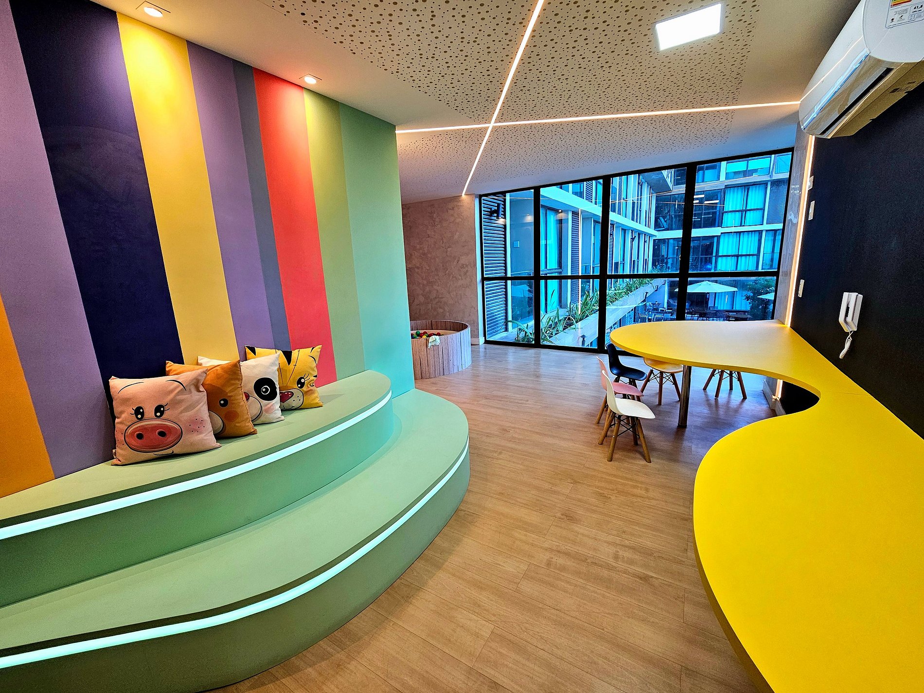 Estamos em um incrível condomínio com uma das estruturas mais bonitas da região, com decoração moderna, iluminação inovadora, academia completa, brinquedoteca, salão de jogos, Spa, e um excelente restaurante que fornece café da manhã.