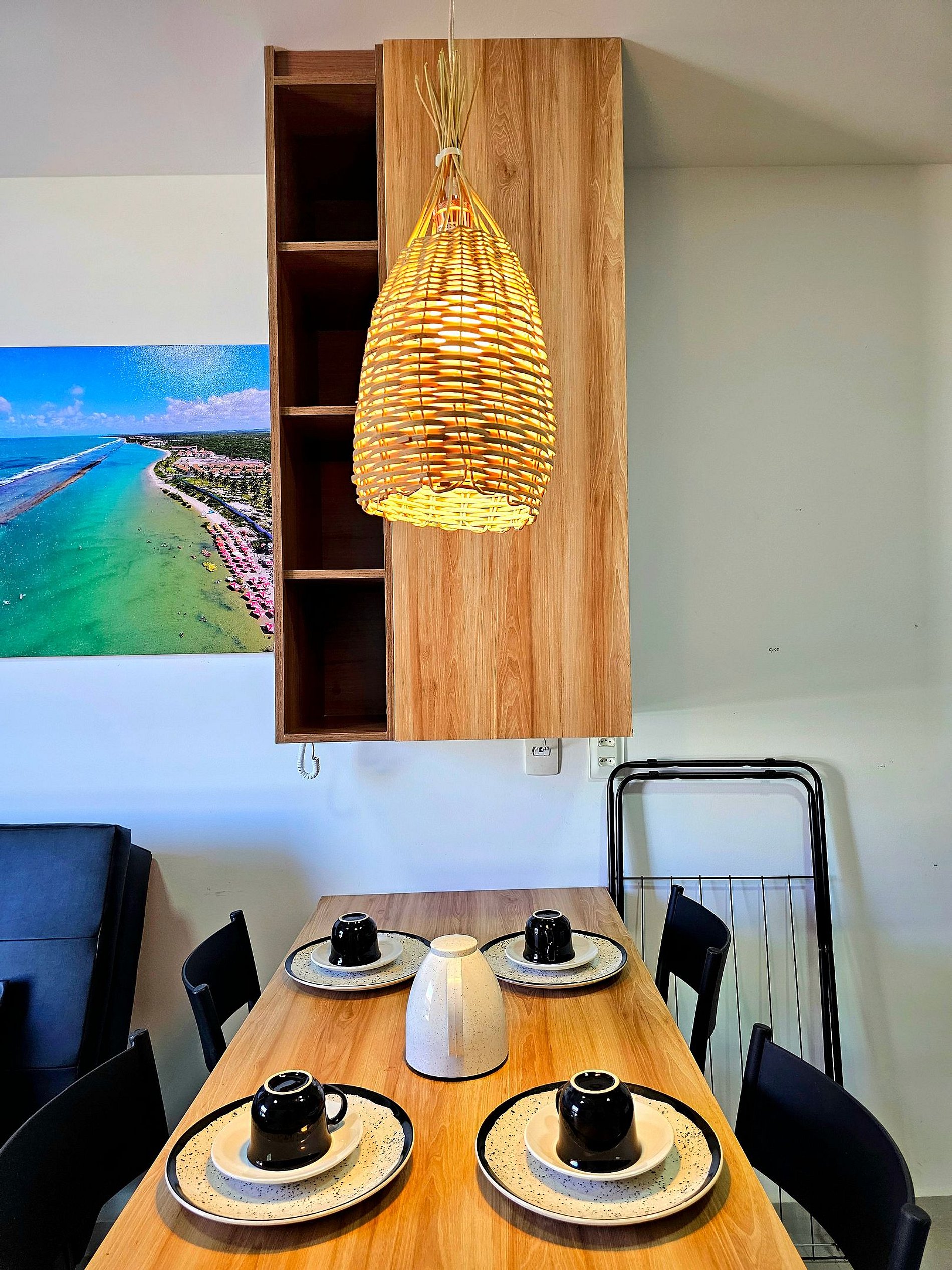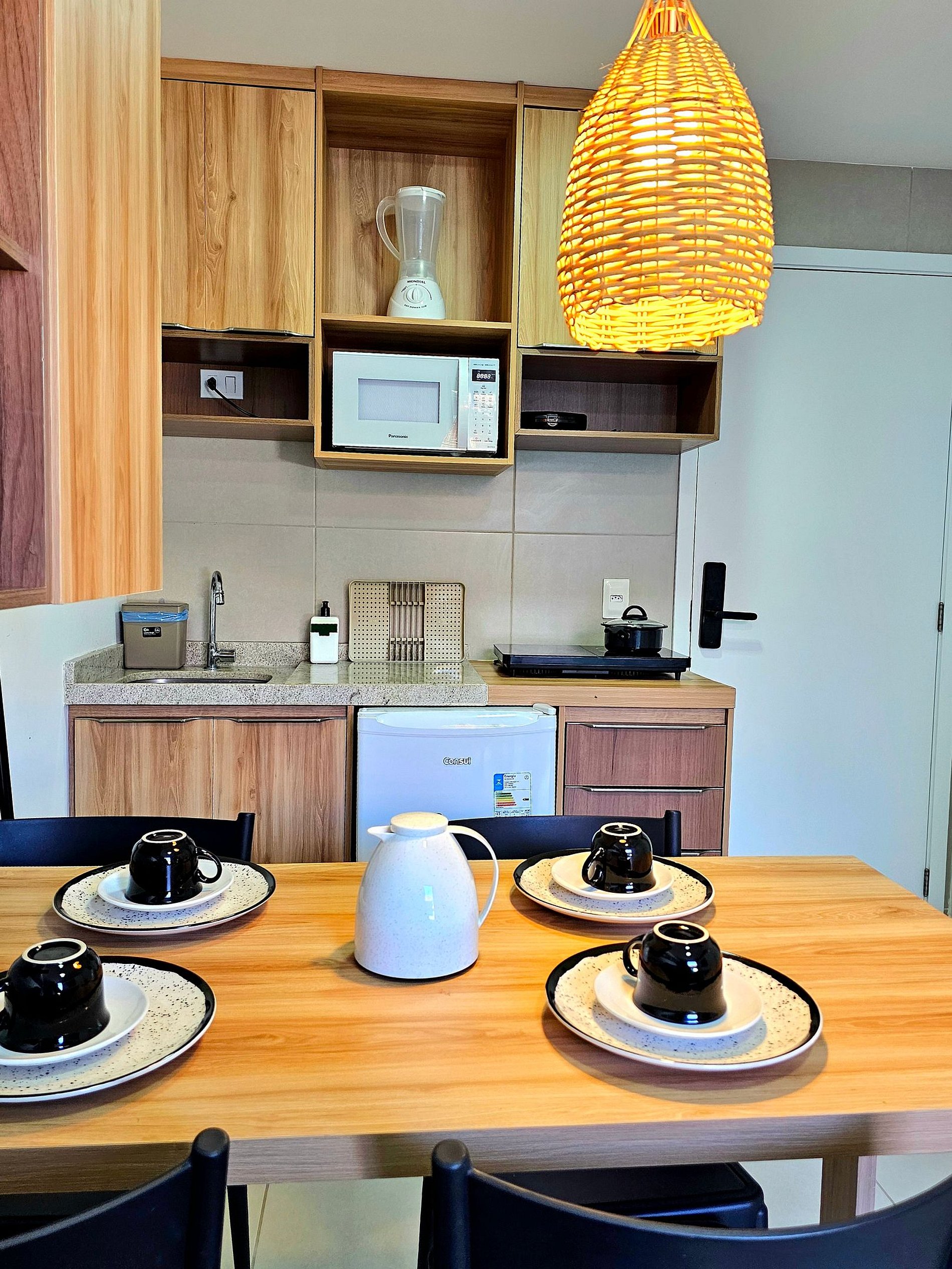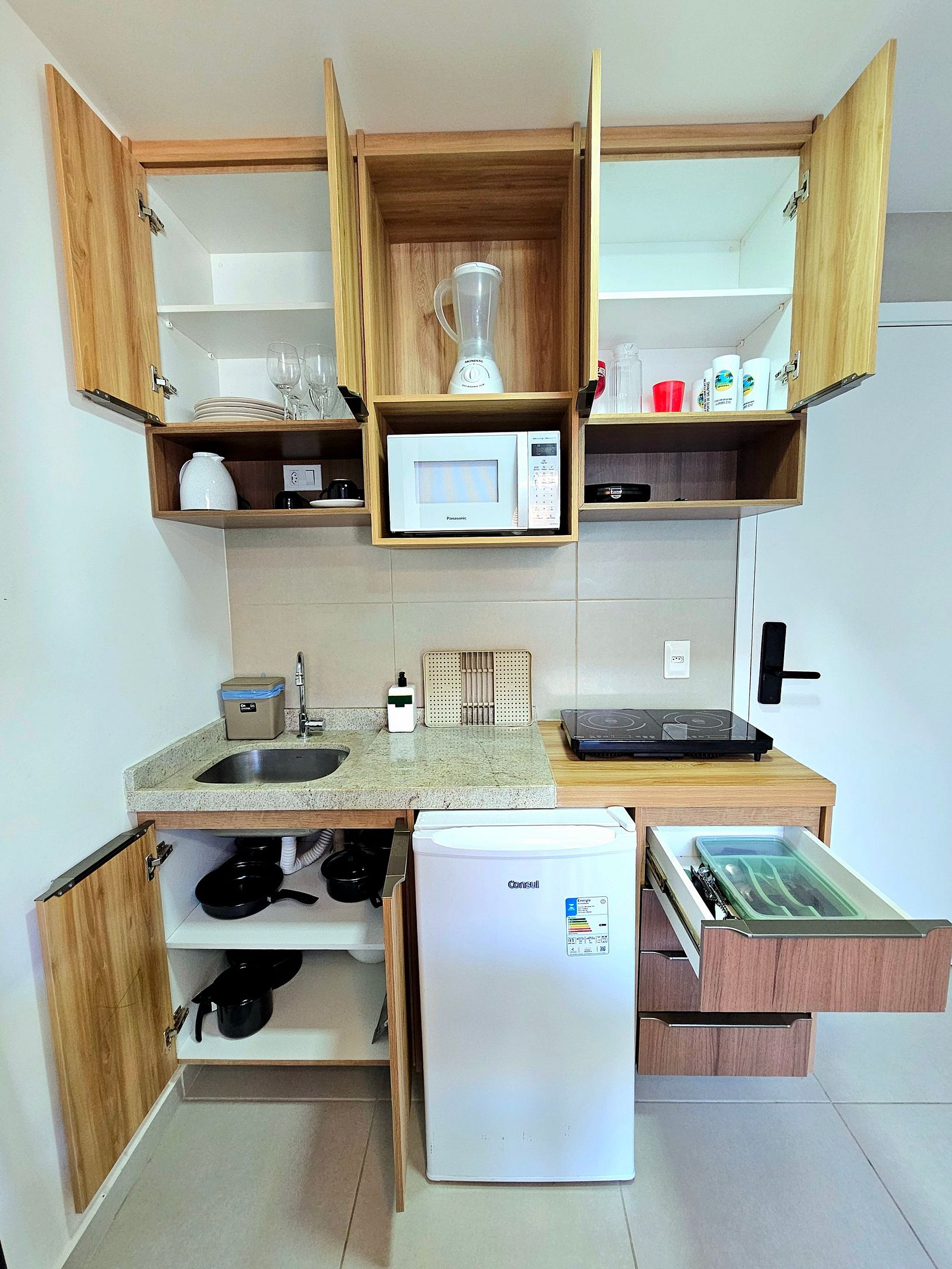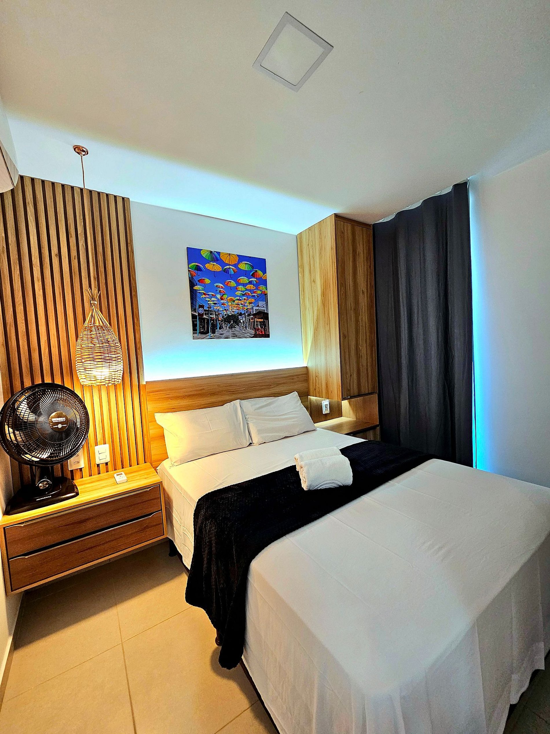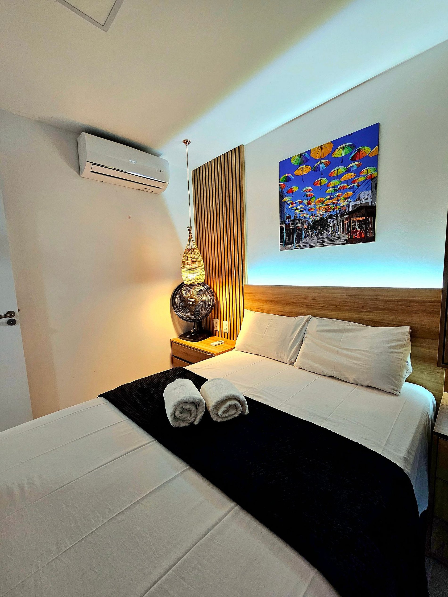 Apartamento de 1 quarto com 1 cama de casal e 1 sofá-cama na sala (Tanto quarto como sala climatizados), a cozinha bem equipada com os principais eletrodomésticos (cooktop 2 bocas, microondas, sanduicheira, liquidificador, frigobar, conjunto de panelas, etc..).